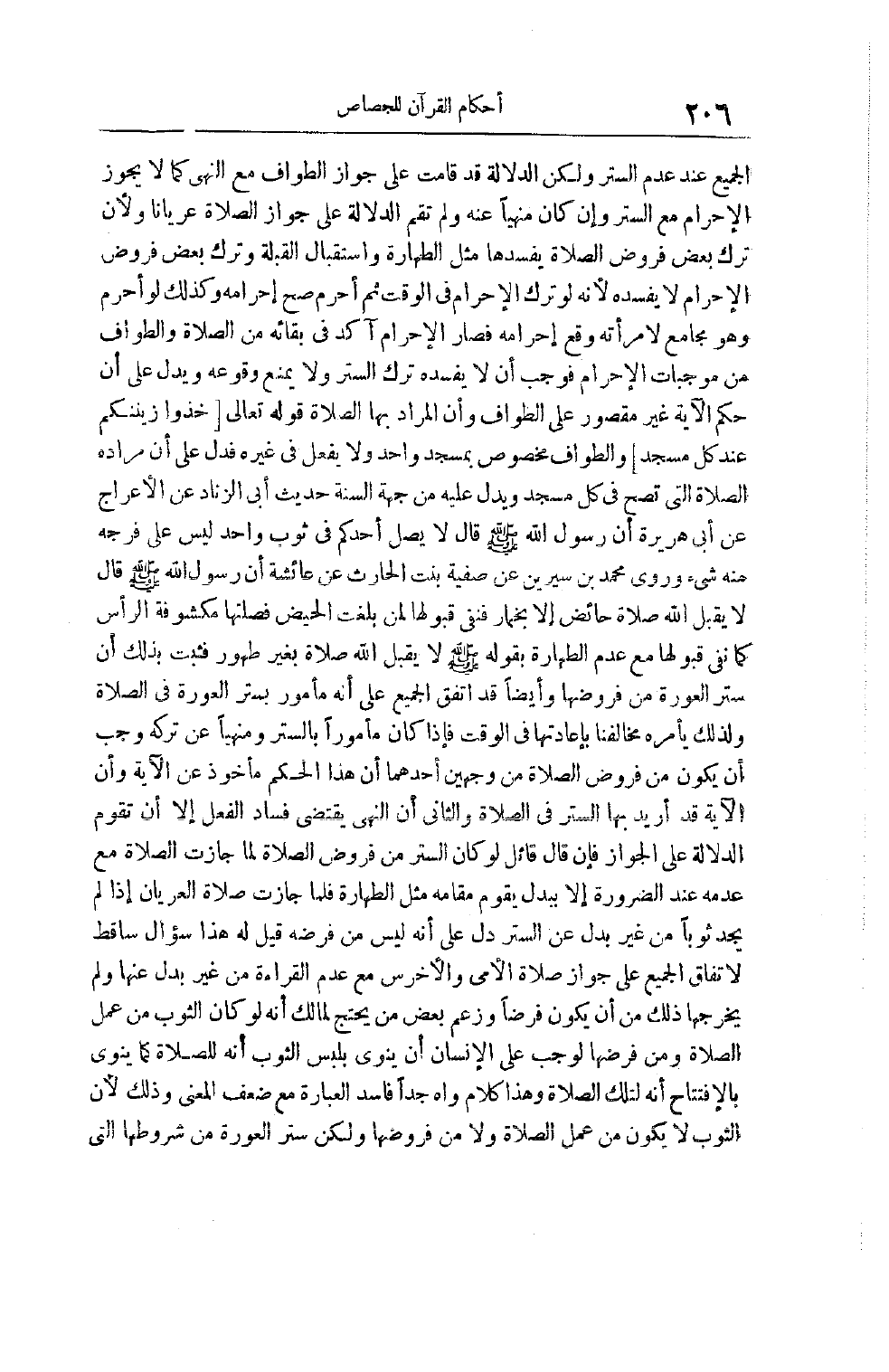 الْجَمِيعِ عِنْدَ عَدَمِ السَّتْرِ وَلَكِنَّ الدَّلَالَةَ قَدْ قَامَتْ عَلَى جَوَازِ الطَّوَافِ مَعَ النَّهْيِ كَمَا لا يَجُوزُ الْإِحْرَامُ مَعَ السَّتْرِ وَإِنْ كَانَ مَنْهِيًّا عَنْهُ وَلَمْ تَقُمْ الدَّلَالَةُ عَلَى جَوَازِ الصَّلَاةِ عُرْيَانًا وَلِأَنَّ تَرْكَ بَعْضِ فُرُوضِ الصَّلَاةِ يُفْسِدُهَا مِثْلُ الطَّهَارَةِ وَاسْتِقْبَالِ الْقِبْلَةِ وَتَرْكُ بَعْضِ فُرُوضِ الْإِحْرَامِ لَا يُفْسِدُهُ لِأَنَّهُ لَوْ تَرَكَ الْإِحْرَامَ فِي الْوَقْتِ ثُمَّ أَحْرَمَ صَحَّ إحْرَامُهُ وَكَذَلِكَ لَوْ أَحْرَمَ وَهُوَ مُجَامِعٌ لِامْرَأَتِهِ وَقَعَ إحْرَامُهُ فصار الإحرام آكد فِي بَقَائِهِ مِنْ الصَّلَاةِ وَالطَّوَافِ مِنْ مُوجِبَاتِ الْإِحْرَامِ فَوَجَبَ أَنْ لَا يُفْسِدَهُ تَرْكُ السَّتْرِ ولا يمنع وقوعه ويدل عَلَى أَنَّ حُكْمَ الْآيَةِ غَيْرُ مَقْصُورٍ عَلَى الطَّوَافِ وَأَنَّ الْمُرَادَ بِهَا الصَّلَاةُ قَوْله تَعَالَى خذوا زينتكم عند كل مسجد وَالطَّوَافُ مَخْصُوصٌ بِمَسْجِدٍ وَاحِدٍ وَلَا يُفْعَلُ فِي غَيْرِهِ فَدَلَّ عَلَى أَنَّ مُرَادَهُ الصَّلَاةُ الَّتِي تَصِحُّ فِي كُلِّ مَسْجِدٍ وَيَدُلُّ عَلَيْهِ مِنْ جهة السنة