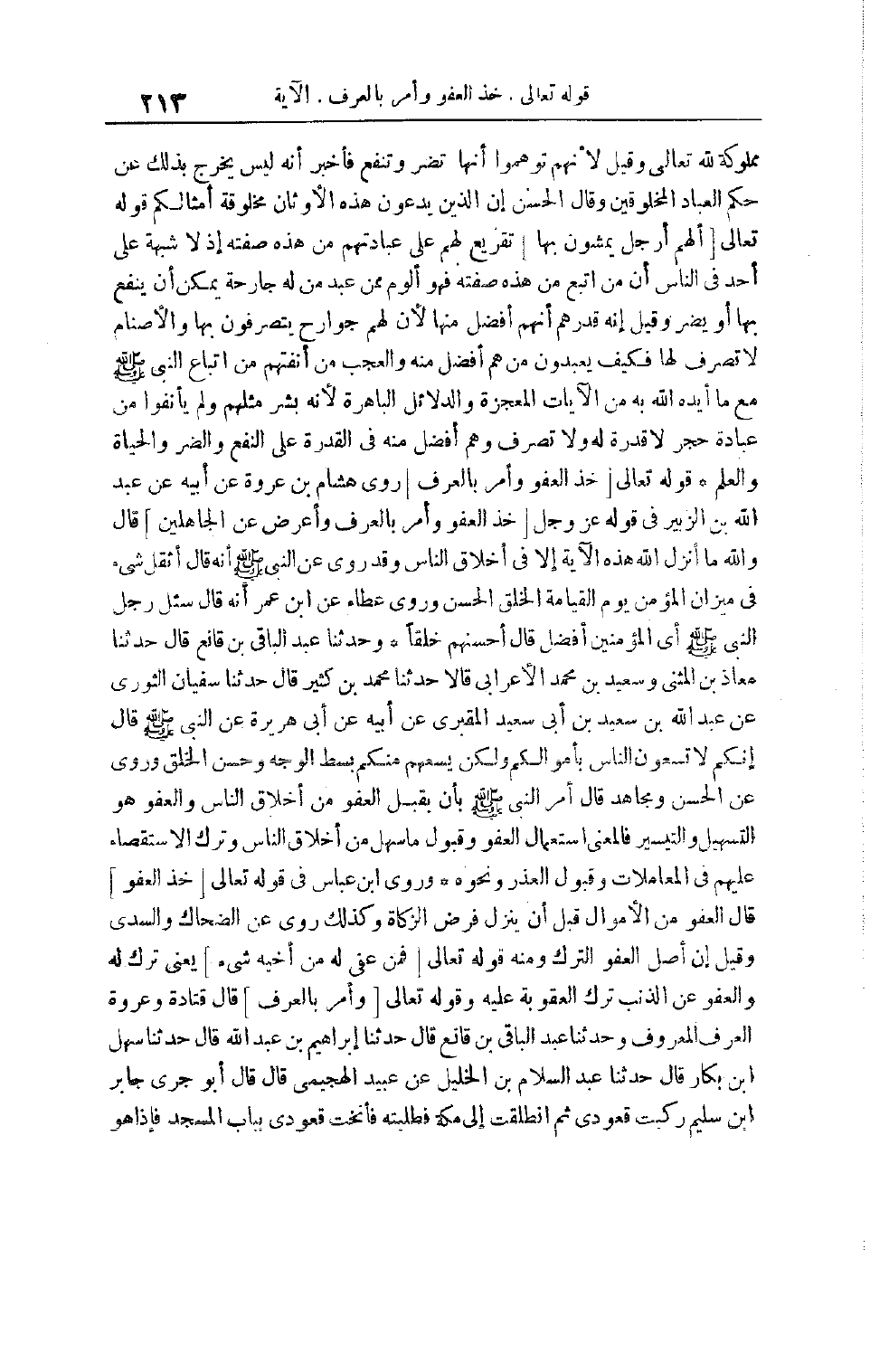قوله تعالى خذ العفو وأمر بالعرف رَوَى هِشَامُ بْنُ عُرْوَةَ عَنْ أَبِيهِ عَنْ عبد اللَّه بن زبير فِي قَوْلِهِ عَزَّ وَجَلَّ خُذِ الْعَفْوَ وَأْمُرْ بالعرف وأعرض عن الجاهلين قَالَ واللَّه مَا أَنْزَلَ اللَّه هَذِهِ الْآيَةَ إلَّا فِي أَخْلَاقِ النَّاسِ