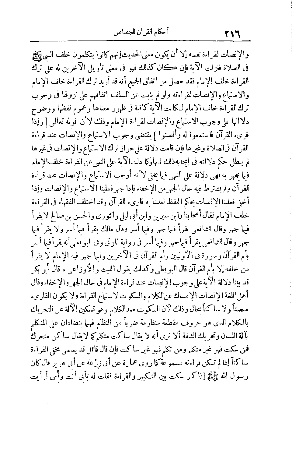 وَالْإِنْصَاتِ لِقِرَاءَةِ نَفْسِهِ إلَّا أَنْ يَكُونَ مَعْنَى الْحَدِيثِ أَنَّهُمْ كَانُوا يَتَكَلَّمُونَ خَلْفَ النَّبِيِّ صَلَّى اللَّه عليه وآله وَسَلَّمَ فِي الصَّلَاةِ فَنَزَلَتْ الْآيَةُ فَإِنْ كَانَ كَذَلِكَ فَهُوَ فِي مَعْنَى تَأْوِيلِ الْآخَرِينَ لَهُ عَلَى تَرْكِ الْقِرَاءَةِ خَلْفَ الْإِمَامِ فَقَدْ حَصَلَ مِنْ اتِّفَاقِ الْجَمِيعِ أَنَّهُ قَدْ أُرِيدَ تَرْكُ الْقِرَاءَةِ خَلْفَ الْإِمَامِ وَالِاسْتِمَاعُ وَالْإِنْصَاتُ لِقِرَاءَتِهِ وَلَوْ لَمْ يَثْبُتْ عَنْ السَّلَفِ اتِّفَاقُهُمْ عَلَى نُزُولِهَا فِي وُجُوبِ تَرْكِ الْقِرَاءَةِ خَلْفَ الْإِمَامِ لَكَانَتْ الْآيَةُ كَافِيَةً فِي ظُهُورِ مَعْنَاهَا وَعُمُومِ لَفْظِهَا وَوُضُوحِ دَلَالَتِهَا عَلَى وُجُوبِ الِاسْتِمَاعِ وَالْإِنْصَاتِ لِقِرَاءَةِ الإمام وذلك لأن قوله تعالى وإذا قرى القرآن فاستمعوا له وأنصتوا يَقْتَضِي وُجُوبَ الِاسْتِمَاعِ وَالْإِنْصَاتِ عِنْدَ قِرَاءَةِ الْقُرْآنِ في الصلاة وغيرها فَإِنْ قَامَتْ دَلَالَةٌ عَلَى جَوَازِ تَرْكِ الِاسْتِمَاعِ وَالْإِنْصَاتِ فِي غَيْرِهَا لَمْ يَبْطُلْ حُكْمُ دَلَالَتِهِ فِي إيجَابِهِ ذَلِكَ فِيهَا وَكَمَا دَلَّتْ الْآيَةُ عَلَى النَّهْيِ عَنْ الْقِرَاءَةِ خَلْفَ الْإِمَامِ فِيمَا يجهز به فهي دلالة عَلَى النَّهْيِ فِيمَا يُخْفِي لِأَنَّهُ أَوْجَبَ الِاسْتِمَاعَ والإنصات عند قراءة القرآن ولم يَشْتَرِطْ فِيهِ حَالَ الْجَهْرِ مِنْ الْإِخْفَاءِ فَإِذَا جَهَرَ فَعَلَيْنَا الِاسْتِمَاعُ وَالْإِنْصَاتُ وَإِذَا أَخْفَى فَعَلَيْنَا الإنصات بحكم اللفظ لعلمنا به قَارِئٌ لِلْقُرْآنِ وَقَدْ اخْتَلَفَ الْفُقَهَاءُ فِي الْقِرَاءَةِ خَلْفَ الْإِمَامِ فَقَالَ أَصْحَابُنَا وَابْنُ سِيرِينَ وَابْنَ أَبِي لَيْلَى وَالثَّوْرِيَّ وَالْحَسَنَ بْنَ صَالِحٍ لَا يَقْرَأُ فِيمَا جَهَرَ وَقَالَ الشَّافِعِيُّ يَقْرَأُ فِيمَا جَهَرَ وَفِيمَا أَسَرَّ وَقَالَ مَالِكٌ يَقْرَأُ فِيمَا أَسَرَّ وَلَا يَقْرَأُ فِيمَا جَهَرَ وَقَالَ الشَّافِعِيُّ يَقْرَأُ فِيمَا جَهَرَ وَفِيمَا أَسَرَّ فِي رِوَايَةِ الْمُزَنِيّ وَفِي الْبُوَيْطِيِّ أَنَّهُ يَقْرَأُ فِيمَا أَسَرَّ بِأُمِّ الْقُرْآنِ وَسُورَةٍ فِي الْأُولَيَيْنِ وَأُمِّ الْقُرْآنِ في الآخرين وَفِيمَا جَهَرَ فِيهِ الْإِمَامُ لَا يَقْرَأُ مَنْ خَلْفَهُ إلَّا بِأُمِّ الْقُرْآنِ قَالَ الْبُوَيْطِيُّ وَكَذَلِكَ يَقُولُ اللَّيْثُ وَالْأَوْزَاعِيُّ قَالَ أَبُو بَكْرٍ قَدْ بَيَّنَّا دَلَالَةَ الْآيَةِ عَلَى وُجُوبِ الْإِنْصَاتِ عِنْدَ قِرَاءَةِ الْإِمَامِ فِي حَالِ الْجَهْرِ وَالْإِخْفَاءِ وَقَالَ أَهْلُ اللُّغَةِ الْإِنْصَاتُ الْإِمْسَاكُ عَنْ الْكَلَامِ وَالسُّكُوتِ لِاسْتِمَاعِ الْقِرَاءَةِ وَلَا يَكُونُ الْقَارِئُ مُنْصِتًا وَلَا سَاكِتًا بِحَالٍ وَذَلِكَ لِأَنَّ السُّكُوتَ ضِدُّ الْكَلَامِ وَهُوَ تَسْكِينُ الْآلَةِ عَنْ التَّحْرِيكِ بِالْكَلَامِ الَّذِي هُوَ حُرُوفٌ مُقَطَّعَةٌ مَنْظُومَةٌ ضَرْبًا مِنْ النِّظَامِ فَهُمَا يَتَضَادَّانِ عَلَى الْمُتَكَلِّمِ بَآلَةِ اللِّسَانِ وَتَحْرِيكِ الشَّفَةِ أَلَا تَرَى أَنَّهُ لَا يُقَالُ سَاكِتٌ مُتَكَلِّمٌ كَمَا لَا يُقَالُ سَاكِنٌ مُتَحَرِّكٌ فَمَنْ سَكَتَ فَهُوَ غَيْرُ مُتَكَلِّمٍ وَمَنْ تَكَلَّمَ فَهُوَ غَيْرُ سَاكِتٍ فَإِنْ قَالَ قَائِلٌ قَدْ يُسَمَّى مُخْفِي الْقِرَاءَةِ سَاكِتًا إذَا لَمْ تَكُنْ قِرَاءَتُهُ مَسْمُوعَةً كَمَا