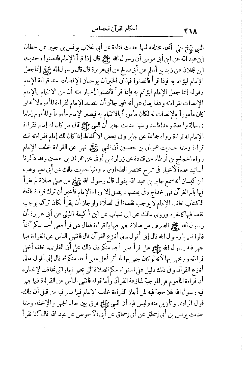 حَدِيثُ عِمْرَانَ بْنِ حصين أن النبي صلّى اللَّه عليه وآله وَسَلَّمَ نَهَى عَنْ الْقِرَاءَةِ خَلْفَ الْإِمَامِ رَوَاهُ الْحَجَّاجُ بْنُ أَرْطَاةَ عَنْ قَتَادَةَ عَنْ زُرَارَةَ بن أوفى عن عمران بن حصين وَقَدْ ذَكَرْنَا أَسَانِيدَ هَذِهِ الْأَخْبَارِ فِي شَرْحِ مُخْتَصَرِ الطَّحَاوِيِّ
