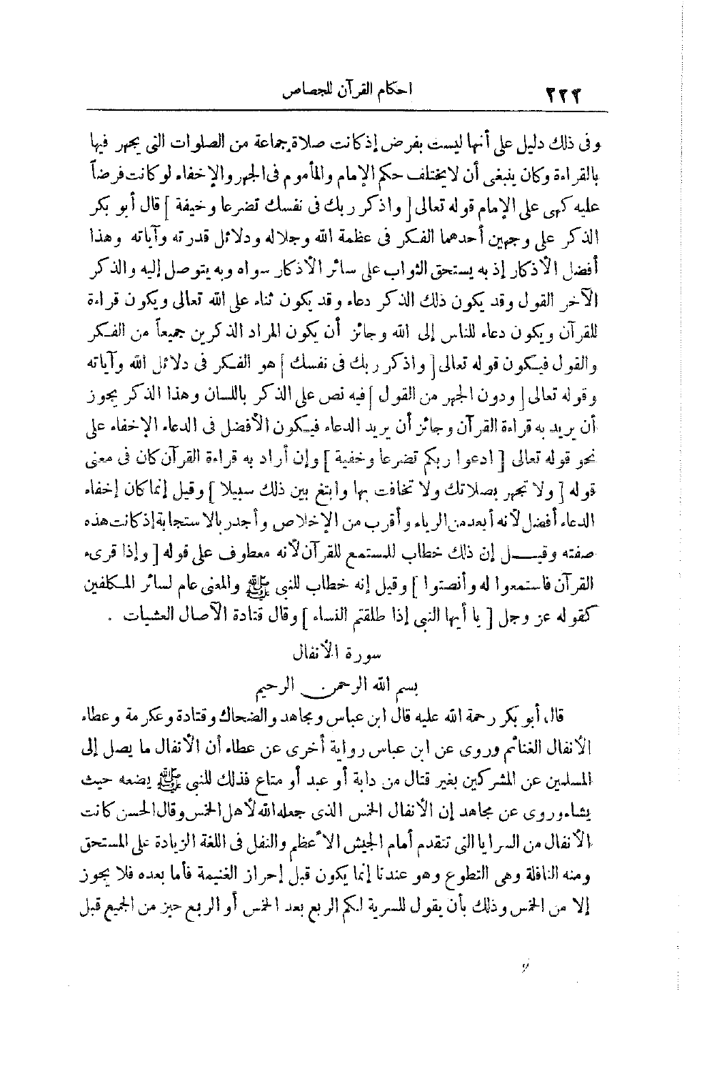 قَالَ أَبُو بَكْرٍ رَحْمَةُ اللَّه عَلَيْهِ قَالَ ابْنُ عَبَّاسٍ وَمُجَاهِدٌ وَالضَّحَّاكُ وَقَتَادَةُ وَعِكْرِمَةُ وَعَطَاءٌ الْأَنْفَالُ الْغَنَائِمُ وَرُوِيَ عَنْ ابْنِ عَبَّاسٍ رِوَايَةٌ أُخْرَى عَنْ عَطَاءٍ أَنَّ الْأَنْفَالَ مَا يَصِلُ إلَى الْمُسْلِمِينَ عَنْ الْمُشْرِكِينَ بِغَيْرِ قِتَالٍ مِنْ دَابَّةٍ أَوْ عَبْدٍ أَوْ مَتَاعٍ فَذَلِكَ لِلنَّبِيِّ صلّى اللَّه عليه وآله وسلم يضعه حَيْثُ يَشَاءُ وَرُوِيَ عَنْ مُجَاهِدٍ أَنَّ الْأَنْفَالَ الْخُمُسُ الَّذِي جَعَلَهُ اللَّه لِأَهْلِ الْخُمُسِ وَقَالَ الْحَسَنُ كَانَتْ الْأَنْفَالُ مِنْ السَّرَايَا الَّتِي تَتَقَدَّمُ أَمَامَ الْجَيْشِ الْأَعْظَمِ وَالنَّفَلُ فِي اللُّغَةِ الزِّيَادَةُ على المستحق ومنه النافلة وهي التطوع وعندنا إنَّمَا يَكُونُ قَبْلَ إحْرَازِ الْغَنِيمَةِ فَأَمَّا بَعْدَهُ فَلَا يَجُوزُ إلَّا مِنْ الْخُمُسِ وَذَلِكَ بِأَنْ يَقُولَ لِلسَّرِيَّةِ لَكُمْ الرُّبُعُ بَعْدَ الْخُمُسِ أَوْ الرُّبُعُ حِيزَ مِنْ الْجَمِيعِ قَبْلَ