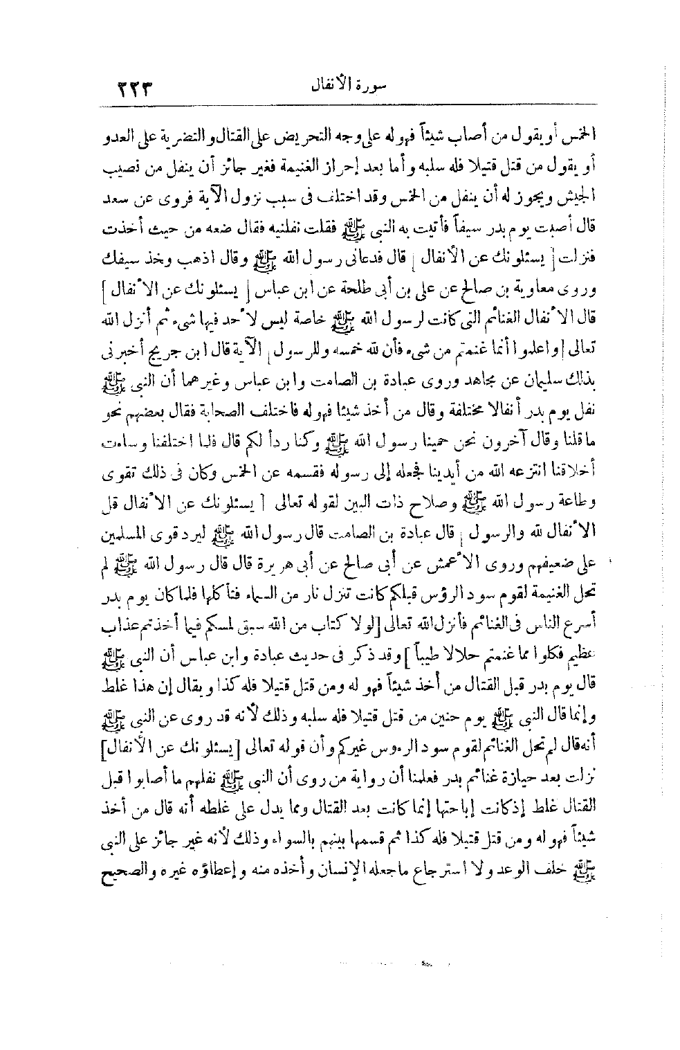 وَرَوَى مُعَاوِيَةُ بْنُ صَالِحٍ عَنْ عَلِيِّ بْنِ أَبِي طَلْحَةَ عَنْ ابْنِ عَبَّاسٍ يسئلونك عن الأنفال قَالَ الْأَنْفَالُ الْغَنَائِمُ الَّتِي كَانَتْ لِرَسُولِ اللَّه صلّى اللَّه عليه وآله وَسَلَّمَ خَاصَّةً لَيْسَ لِأَحَدٍ فِيهَا شَيْءٌ ثُمَّ أَنْزَلَ اللَّه تَعَالَى وَاعْلَمُوا أَنَّمَا غَنِمْتُمْ مِنْ شَيْءٍ فَأَنَّ لِلَّهِ خمسه وللرسول الْآيَةَ قَالَ ابْنُ جُرَيْجٍ أَخْبَرَنِي بِذَلك سُلَيْمَانُ عَنْ مُجَاهِدٍ