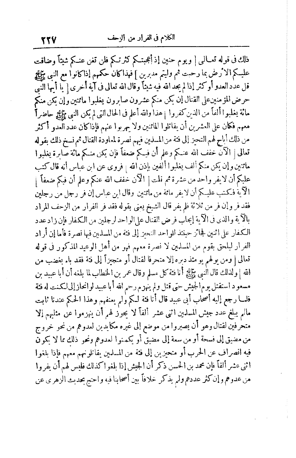 ذَلِكَ فِي قَوْله تَعَالَى وَيَوْمَ حُنَيْنٍ إِذْ أَعْجَبَتْكُمْ كَثْرَتُكُمْ فَلَمْ تُغْنِ عَنْكُمْ شَيْئًا وَضَاقَتْ عَلَيْكُمُ الأَرْضُ بِمَا رَحُبَتْ ثُمَّ وَلَّيْتُمْ مُدْبِرِينَ فهذا كان حكمهم إذا كانوا مع النبي صلّى اللَّه عليه وآله وسلم قل عدد العدو أو كثر إذا لم يجد اللَّه فِيهِ شَيْئًا وَقَالَ اللَّه تَعَالَى فِي آيَةٍ أُخْرَى يَا أَيُّهَا النَّبِيُّ حَرِّضِ الْمُؤْمِنِينَ عَلَى الْقِتَالِ إِنْ يَكُنْ مِنْكُمْ عِشْرُونَ صَابِرُونَ يَغْلِبُوا مِائَتَيْنِ وَإِنْ يَكُنْ مِنْكُمْ مِائَةٌ يَغْلِبُوا ألفا من الذين كفروا هَذَا واللَّه أَعْلَمُ فِي الْحَالِ الَّتِي لَمْ يكن النبي صلّى اللَّه عليه وآله وَسَلَّمَ حَاضِرًا مَعَهُمْ فَكَانَ عَلَى الْعِشْرِينَ أَنْ يُقَاتِلُوا الْمِائَتَيْنِ وَلَا يَهْرُبُوا عَنْهُمْ فَإِذَا كَانَ عَدَدُ الْعَدُوِّ أَكْثَرَ مِنْ ذَلِكَ أَبَاحَ لَهُمْ التَّحَيُّزَ إلَى فِئَةٍ مِنْ الْمُسْلِمِينَ فِيهِمْ نُصْرَةٌ لِمُعَاوَدَةِ الْقِتَالِ ثُمَّ نُسِخَ ذَلِكَ بِقَوْلِهِ تَعَالَى الآنَ خَفَّفَ اللَّهُ عَنْكُمْ وَعَلِمَ أَنَّ فِيكُمْ ضَعْفًا فَإِنْ يَكُنْ مِنْكُمْ مِائَةٌ صَابِرَةٌ يَغْلِبُوا مِائَتَيْنِ وَإِنْ يَكُنْ مِنْكُمْ أَلْفٌ يَغْلِبُوا أَلْفَيْنِ بإذن الله فَرُوِيَ عَنْ ابْنِ عَبَّاسٍ أَنَّهُ قَالَ كَتَبَ عَلَيْكُمْ أَنْ لَا يَفِرَّ وَاحِدٌ مِنْ عَشَرَةٍ ثم قلت الآنَ خَفَّفَ اللَّهُ عَنْكُمْ وَعَلِمَ أَنَّ فِيكُمْ ضعفا الْآيَةَ فَكَتَبَ عَلَيْكُمْ أَنْ لَا يَفِرَّ مِائَةٌ من مائتين وقال ابن عباس وإن فَرَّ رَجُلٌ مِنْ رَجُلَيْنِ فَقَدْ فَرَّ وَإِنَّ فَرَّ مِنْ ثَلَاثَةٍ فَلَمْ يَفِرَّ قَالَ الشَّيْخُ يعنب بِقَوْلِهِ فَقَدْ فَرَّ الْفِرَارُ مِنْ الزَّحْفِ الْمُرَادُ بِالْآيَةِ وَاَلَّذِي فِي الْآيَةِ إيجَابُ فَرْضِ الْقِتَالِ عَلَى الْوَاحِدِ لِرَجُلَيْنِ مِنْ الْكُفَّارِ فَإِنْ زَادَ عَدَدُ الْكُفَّارِ عَلَى اثْنَيْنِ فَجَائِزٌ حِينَئِذٍ لِلْوَاحِدِ التَّحَيُّزُ إلَى فِئَةٍ مِنْ الْمُسْلِمِينَ فِيهَا نُصْرَةٌ فَأَمَّا إنَّ أَرَادَ الْفِرَارَ لِيَلْحَقَ بِقَوْمٍ مِنْ الْمُسْلِمِينَ لَا نُصْرَةَ مَعَهُمْ فَهُوَ مِنْ أَهْلِ الْوَعِيدِ الْمَذْكُورِ فِي قَوْله تَعَالَى وَمَنْ يُوَلِّهِمْ يَوْمَئِذٍ دُبُرَهُ إِلا مُتَحَرِّفًا لِقِتَالٍ أَوْ مُتَحَيِّزًا إِلَى فِئَةٍ فَقَدْ بَاءَ بِغَضَبٍ مِنَ اللَّهِ ولذلك