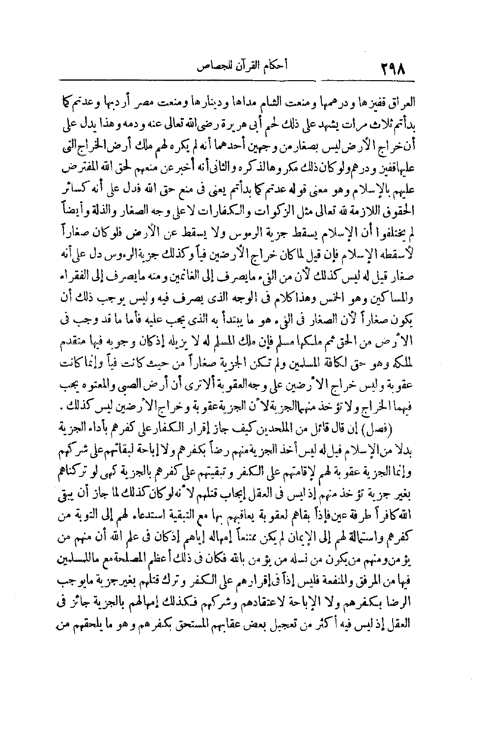 (فَصْلٌ) إنْ قَالَ قَائِلٌ مِنْ الْمُلْحِدِينَ كَيْفَ جَازَ إقْرَارُ الْكُفَّارِ عَلَى كُفْرِهِمْ بِأَدَاءِ الْجِزْيَةِ بَدَلًا مِنْ الْإِسْلَامِ قِيلَ لَهُ لَيْسَ أَخْذُ الْجِزْيَةِ مِنْهُمْ رِضًا بِكُفْرِهِمْ وَلَا إبَاحَةً لِبَقَائِهِمْ عَلَى شِرْكِهِمْ وَإِنَّمَا الْجِزْيَةُ عُقُوبَةٌ لَهُمْ لِإِقَامَتِهِمْ عَلَى الْكُفْرِ وَتَبْقِيَتِهِمْ عَلَى كُفْرِهِمْ بِالْجِزْيَةِ كَهِيَ لَوْ تَرَكْنَاهُمْ بِغَيْرِ جِزْيَةٍ تُؤْخَذُ مِنْهُمْ إذْ لَيْسَ فِي الْعَقْلِ إيجَابُ قَتْلِهِمْ لِأَنَّهُ لَوْ كَانَ كَذَلِكَ لَمَا جَازَ أَنْ يُبْقِيَ اللَّهُ كَافِرًا طَرْفَةَ عَيْنٍ فَإِذَا بَقَّاهُمْ لِعُقُوبَةٍ يُعَاقِبُهُمْ بِهَا مَعَ التَّبْقِيَةِ اسْتِدْعَاءً لَهُمْ إلَى التَّوْبَةِ مِنْ كُفْرِهِمْ وَاسْتِمَالَةً لَهُمْ إلَى الْإِيمَانِ لَمْ يَكُنْ مُمْتَنِعًا إمْهَالُهُ إيَّاهُمْ إذْ كَانَ فِي عِلْمِ اللَّهِ أَنَّ مِنْهُمْ مَنْ يُؤْمِنُ وَمِنْهُمْ مَنْ يَكُونُ مِنْ نَسْلِهِ مَنْ يُؤْمِنُ بِاَللَّهِ فَكَانَ فِي ذَلِكَ أَعْظَمُ الْمَصْلَحَةِ مَعَ مَا للمسلمين فيها من المرفق وَالْمَنْفَعَةِ فَلَيْسَ إذًا فِي إقْرَارِهِمْ عَلَى الْكُفْرِ وَتَرْكِ قَتْلِهِمْ بِغَيْرِ جِزْيَةٍ مَا يُوجِبُ الرِّضَا بِكُفْرِهِمْ وَلَا الْإِبَاحَةَ لِاعْتِقَادِهِمْ وَشِرْكِهِمْ فَكَذَلِكَ إمْهَالُهُمْ بِالْجِزْيَةِ جَائِزٌ فِي الْعَقْلِ إذْ لَيْسَ فِيهِ أَكْثَرُ مِنْ تَعْجِيلِ بَعْضِ عِقَابِهِمْ الْمُسْتَحَقِّ بِكُفْرِهِمْ وَهُوَ مَا يَلْحَقُهُمْ مِنْ