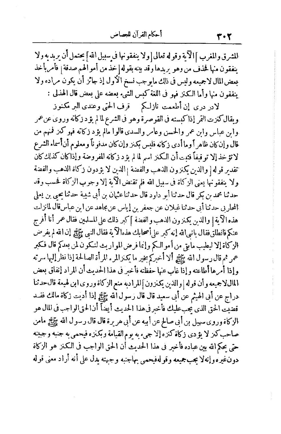 الْآيَةَ وقَوْله تَعَالَى وَلا يُنْفِقُونَهَا فِي سَبِيلِ الله يَحْتَمِلُ أَنْ يُرِيدَ بِهِ وَلَا يُنْفِقُونَ مِنْهَا فَحَذَفَ مِنْ وَهُوَ يُرِيدُهَا وَقَدْ بَيَّنَهُ بِقَوْلِهِ خذ من أموالهم صدقة فَأَمَرَ بِأَخْذِ بَعْضِ الْمَالِ لَا جَمِيعِهِ وَلَيْسَ فِي ذَلِكَ مَا يُوجِبُ نَسْخَ الْأَوَّلِ إذْ جَائِزٌ أَنْ يَكُونَ مُرَادُهُ وَلَا يُنْفِقُونَ مِنْهَا وَأَمَّا الْكَنْزُ فَهُوَ فِي اللُّغَةِ كَبْسُ الشَّيْءِ بَعْضُهُ عَلَى بَعْضٍ قَالَ الْهُذَلِيُّ: