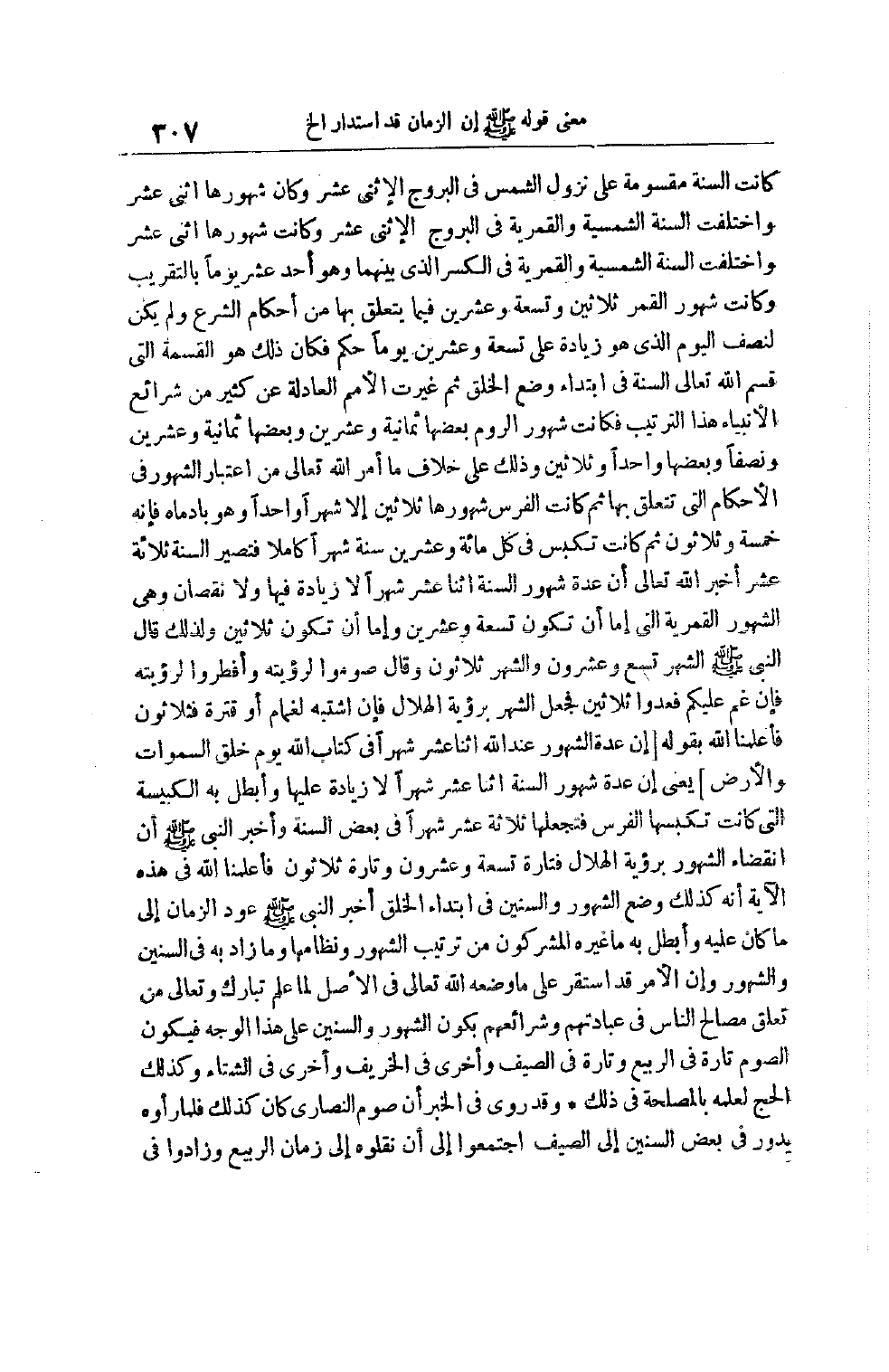 كَانَتْ السَّنَةُ مَقْسُومَةً عَلَى نُزُولِ الشَّمْسِ فِي الْبُرُوجِ الِاثْنَيْ عَشَرَ وَكَانَ شُهُورُهَا اثْنَيْ عَشَرَ وَاخْتَلَفَتْ السَّنَةُ الشَّمْسِيَّةُ وَالْقَمَرِيَّةُ فِي الْبُرُوجِ الِاثْنَيْ عَشَرَ وَكَانَتْ شُهُورُهَا اثْنَيْ عَشَرَ وَاخْتَلَفَتْ السَّنَةُ الشَّمْسِيَّةُ وَالْقَمَرِيَّةُ فِي الْكَسْرِ الَّذِي بَيْنَهُمَا وَهُوَ أَحَدَ عَشَرَ يَوْمًا بِالتَّقْرِيبِ وَكَانَتْ شُهُورُ الْقَمَرِ ثَلَاثِينَ وَتِسْعَةً وَعِشْرِينَ فِيمَا يَتَعَلَّقُ بِهَا مِنْ أَحْكَامِ الشَّرْعِ وَلَمْ يَكُنْ لِنِصْفِ الْيَوْمِ الَّذِي هُوَ زِيَادَةٌ عَلَى تِسْعَةٍ وَعِشْرِينَ يَوْمًا حُكْمٌ فَكَانَ ذَلِكَ هُوَ الْقِسْمَةُ الَّتِي قَسَمَ اللَّهُ تعالى السَّنَةَ فِي ابْتِدَاءِ وَضْعِ الْخَلْقِ ثُمَّ غَيَّرَتْ الْأُمَمُ الْعَادِلَةُ عَنْ كَثِيرٍ مِنْ شَرَائِعِ الْأَنْبِيَاءِ هَذَا التَّرْتِيبَ فَكَانَتْ شُهُورُ الرُّومِ بَعْضُهَا ثَمَانِيَةً وَعِشْرِينَ وَبَعْضُهَا ثَمَانِيَةً وَعِشْرِينَ وَنِصْفًا وَبَعْضُهَا وَاحِدًا وَثَلَاثِينَ وَذَلِكَ عَلَى خِلَافِ مَا أَمَرَ اللَّهُ تَعَالَى مِنْ اعْتِبَارِ الشُّهُورِ فِي الْأَحْكَامِ الَّتِي تَتَعَلَّقُ بِهَا ثُمَّ كَانَتْ الْفُرْسُ شُهُورُهَا ثَلَاثِينَ إلَّا شَهْرًا وَاحِدًا وَهُوَ بادماه فَإِنَّهُ خَمْسَةٌ وَثَلَاثُونَ ثُمَّ كَانَتْ تَكْبِسُ فِي كُلِّ مِائَةٍ وَعِشْرِينَ سَنَةً شَهْرًا كَامِلًا فَتَصِيرُ السَّنَةُ ثَلَاثَةَ عَشَرَ أَخْبَرَ اللَّهُ تَعَالَى أَنَّ عِدَّةَ شُهُورِ السَّنَةِ اثْنَا عَشَرَ شَهْرًا لَا زِيَادَةَ فِيهَا وَلَا نُقْصَانَ وَهِيَ الشُّهُورُ الْقَمَرِيَّةُ الَّتِي إمَّا أَنْ تَكُونَ تِسْعَةً وَعِشْرِينَ وَإِمَّا أَنْ تَكُونَ ثَلَاثِينَ وَلِذَلِكَ