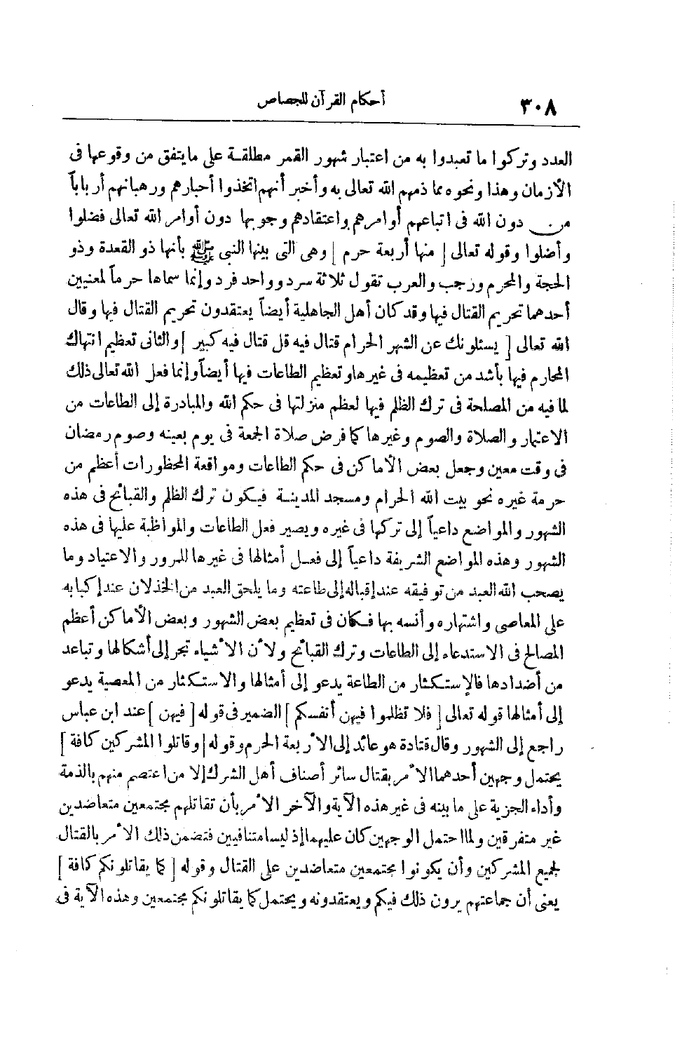 الْعَدَدِ وَتَرَكُوا مَا تَعَبَّدُوا بِهِ مِنْ اعْتِبَارِ شُهُورِ الْقَمَرِ مُطْلَقَةً عَلَى مَا يَتَّفِقُ مِنْ وُقُوعِهَا فِي الْأَزْمَانِ وَهَذَا وَنَحْوُهُ مِمَّا ذَمَّهُمْ اللَّهُ تَعَالَى بِهِ وَأَخْبَرَ أَنَّهُمْ اتَّخَذُوا أَحْبَارَهُمْ وَرُهْبَانَهُمْ أَرْبَابًا مِنْ دُونِ اللَّهِ فِي اتِّبَاعِهِمْ أَوَامِرَهُمْ وَاعْتِقَادِهِمْ وُجُوبَهَا دُونَ أَوَامِرِ اللَّهِ تَعَالَى فَضَلُّوا وَأَضَلُّوا وقَوْله تَعَالَى مِنْهَا أَرْبَعَةٌ حُرُمٌ وَهِيَ الَّتِي بَيَّنَهَا النَّبِيُّ صَلَّى اللَّهُ عَلَيْهِ وَسَلَّمَ بِأَنَّهَا ذُو الْقِعْدَةِ وَذُو الْحِجَّةِ وَالْمُحَرَّمُ وَرَجَبُ وَالْعَرَبُ تَقُولُ ثَلَاثَةٌ سَرْدٌ وَوَاحِدٌ فَرْدٌ وَإِنَّمَا سَمَّاهَا حُرُمًا لِمَعْنَيَيْنِ أَحَدُهُمَا تَحْرِيمُ الْقِتَالِ فِيهَا وَقَدْ كَانَ أَهْلُ الْجَاهِلِيَّةِ أَيْضًا يَعْتَقِدُونَ تحريم القتال فيها وقال الله تعالى يسئلونك عَنِ الشَّهْرِ الْحَرَامِ قِتَالٍ فِيهِ قُلْ قِتَالٌ فيه كبير وَالثَّانِي تَعْظِيمُ انْتِهَاكِ الْمَحَارِمِ فِيهَا بِأَشَدَّ مِنْ تَعْظِيمِهِ فِي غَيْرِهَا وَتَعْظِيمِ الطَّاعَاتِ فِيهَا أَيْضًا وَإِنَّمَا فَعَلَ اللَّهُ تَعَالَى ذَلِكَ لِمَا فِيهِ مِنْ الْمَصْلَحَةِ فِي تَرْكِ الظُّلْمِ فِيهَا لِعِظَمِ مَنْزِلَتِهَا فِي حُكْمِ اللَّهِ وَالْمُبَادَرَةِ إلَى الطَّاعَاتِ من الاعتمار وَالصَّلَاةِ وَالصَّوْمِ وَغَيْرِهَا كَمَا فَرَضَ صَلَاةَ الْجُمُعَةِ فِي يَوْمٍ بِعَيْنِهِ وَصَوْمَ رَمَضَانَ فِي وَقْتٍ مُعَيَّنٍ وَجَعَلَ بَعْضَ الْأَمَاكِنِ فِي حُكْمِ الطَّاعَاتِ وَمُوَاقَعَةُ الْمَحْظُورَاتِ أَعْظَمُ مِنْ حُرْمَةِ غَيْرِهِ نَحْوَ بَيْتِ اللَّهِ الْحَرَامِ وَمَسْجِدِ الْمَدِينَةِ فَيَكُونُ تَرْكُ الظُّلْمِ وَالْقَبَائِحِ فِي هَذِهِ الشُّهُورِ وَالْمَوَاضِعِ دَاعِيًا إلى تركها في غيره ويصير فِعْلِ الطَّاعَاتِ وَالْمُوَاظَبَةِ عَلَيْهَا فِي هَذِهِ الشُّهُورِ وَهَذِهِ الْمَوَاضِعِ الشَّرِيفَةِ دَاعِيًا إلَى فِعْلِ أَمْثَالِهَا فِي غَيْرِهَا لِلْمُرُورِ وَالِاعْتِيَادِ وَمَا يَصْحَبُ اللَّهُ الْعَبْدَ مِنْ تَوْفِيقِهِ عِنْدَ إقْبَالِهِ إلَى طَاعَتِهِ وَمَا يَلْحَقُ الْعَبْدَ مِنْ الْخِذْلَانِ عِنْدَ إكْبَابِهِ عَلَى الْمَعَاصِي وَاشْتِهَارِهِ وَأُنْسِهِ بِهَا فَكَانَ فِي تَعْظِيمِ بَعْضِ الشُّهُورِ وَبَعْضِ الْأَمَاكِنِ أَعْظَمُ الْمَصَالِحِ فِي الِاسْتِدْعَاءِ إلَى الطَّاعَاتِ وَتَرْكِ الْقَبَائِحِ وَلِأَنَّ الْأَشْيَاءَ تَجُرُّ إلَى أَشْكَالِهَا وَتُبَاعِدُ مِنْ أَضْدَادِهَا فَالِاسْتِكْثَارُ مِنْ الطَّاعَةِ يَدْعُو إلَى أَمْثَالِهَا وَالِاسْتِكْثَارُ مِنْ الْمَعْصِيَةِ يَدْعُو إلَى أَمْثَالِهَا قَوْله تَعَالَى فلا تظلموا فيهن أنفسكم الضمير في قوله فيهن عِنْدَ ابْنِ عَبَّاسٍ رَاجِعٌ إلَى الشُّهُورِ وَقَالَ قَتَادَةُ هُوَ عَائِدٌ إلَى الْأَرْبَعَةِ الْحُرُمِ وَقَوْلُهُ وقاتلوا المشركين كافة يَحْتَمِلُ وَجْهَيْنِ أَحَدُهُمَا الْأَمْرُ بِقِتَالِ سَائِرِ أَصْنَافِ أَهْلِ الشِّرْكِ إلَّا مَنْ اعْتَصَمَ مِنْهُمْ بِالذِّمَّةِ وَأَدَاءِ الْجِزْيَةِ عَلَى مَا بَيَّنَهُ فِي غَيْرِ هذه الآية والآخر الأمر بأن تقاتلهم مُجْتَمِعِينَ مُتَعَاضِدِينَ غَيْرَ مُتَفَرِّقِينَ وَلِمَا احْتَمَلَ الْوَجْهَيْنِ كَانَ عَلَيْهِمَا إذْ لَيْسَا مُتَنَافِيَيْنِ فَتَضَمَّنَ ذَلِكَ الْأَمْرُ بِالْقِتَالِ لِجَمِيعِ الْمُشْرِكِينَ وَأَنْ يَكُونُوا مُجْتَمِعِينَ مُتَعَاضِدِينَ عَلَى الْقِتَالِ وَقَوْلُهُ كَمَا يُقَاتِلُونَكُمْ كَافَّةً يَعْنِي أَنَّ جَمَاعَتَهُمْ يَرَوْنَ ذَلِكَ فِيكُمْ وَيَعْتَقِدُونَهُ وَيَحْتَمِلُ كَمَا يُقَاتِلُونَكُمْ مُجْتَم