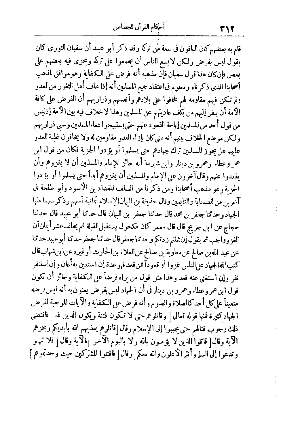 قَامَ بِهِ بَعْضُهُمْ كَانَ الْبَاقُونَ فِي سَعَةٍ مِنْ تَرْكِهِ وَقَدْ ذَكَرَ أَبُو عُبَيْدٍ أَنَّ سُفْيَانَ الثَّوْرِيِّ كَانَ يَقُولُ لَيْسَ بِفَرْضٍ وَلَكِنْ لَا يَسَعُ النَّاسَ أَنْ يُجْمِعُوا عَلَى تَرْكِهِ وَيَجْزِي فِيهِ بَعْضُهُمْ عَلَى بَعْضٍ فَإِنْ كَانَ هَذَا قَوْلَ سُفْيَانَ فَإِنَّ مَذْهَبَهُ أَنَّهُ فَرْضٌ عَلَى الْكِفَايَةِ وَهُوَ مُوَافِقٌ لِمَذْهَبِ أَصْحَابِنَا الَّذِي ذَكَرْنَاهُ وَمَعْلُومٌ فِي اعْتِقَادِ جَمِيعِ الْمُسْلِمِينَ أَنَّهُ إذَا خَافَ أَهْلُ الثُّغُورِ مِنْ الْعَدُوِّ وَلَمْ تَكُنْ فِيهِمْ مُقَاوِمَةٌ لَهُمْ فَخَافُوا عَلَى بِلَادِهِمْ وَأَنْفُسِهِمْ وَذَرَارِيِّهِمْ أَنَّ الْفَرْضَ عَلَى كَافَّةِ الْأُمَّةِ أَنْ يَنْفِرُ إلَيْهِمْ مَنْ يَكُفُّ عَادِيَتَهُمْ عَنْ الْمُسْلِمِينَ وَهَذَا لَا خِلَافَ فِيهِ بَيْنَ الْأُمَّةِ إذا لَيْسَ مِنْ قَوْلِ أَحَدٍ مِنْ الْمُسْلِمِينَ إبَاحَةُ القعود عنهم حين يَسْتَبِيحُوا دِمَاءَ الْمُسْلِمِينَ وَسَبْيَ ذَرَارِيِّهِمْ وَلَكِنَّ مَوْضِعَ الْخِلَافِ بَيْنَهُمْ أَنَّهُ مَتَى كَانَ بِإِزَاءِ الْعَدُوِّ مُقَاوِمِينَ لَهُ وَلَا يَخَافُونَ غَلَبَةَ الْعَدُوِّ عَلَيْهِمْ هَلْ يَجُوزُ لِلْمُسْلِمِينَ تَرْكُ جِهَادِهِمْ حَتَّى يُسْلِمُوا أَوْ يُؤَدُّوا الْجِزْيَةَ فَكَانَ مِنْ قَوْلِ ابْنِ عُمَرَ وَعَطَاءٍ وَعَمْرِو بْنِ دِينَارٍ وَابْنِ شُبْرُمَةَ أَنَّهُ جَائِزٌ لِلْإِمَامِ وَالْمُسْلِمِينَ أَنْ لَا يَغْزُوهُمْ وَأَنْ يَقْعُدُوا عَنْهُمْ وَقَالَ آخَرُونَ عَلَى الْإِمَامِ وَالْمُسْلِمِينَ أَنْ يَغْزُوَهُمْ أَبَدًا حَتَّى يُسْلِمُوا أَوْ يُؤَدُّوا الْجِزْيَةَ وَهُوَ مَذْهَبُ أَصْحَابِنَا وَمَنْ ذَكَرْنَا مِنْ السَّلَفِ الْمِقْدَادُ بْنُ الْأَسْوَدِ وَأَبُو طَلْحَةَ فِي آخَرِينَ مِنْ الصَّحَابَةِ وَالتَّابِعِينَ وَقَالَ حُذَيْفَةُ بْنُ الْيَمَانِ الْإِسْلَامُ ثَمَانِيَةُ أَسْهُمٍ وَذَكَرَ سَهْمًا منها الجهاد وَحَدَّثَنَا جَعْفَرُ بْنُ مُحَمَّدٍ قَالَ حَدَّثَنَا جَعْفَرُ بن اليمان قال حدثنا أبو عبيد قال حَدَّثَنَا حَجَّاجٌ عَنْ ابْنِ جُرَيْجٍ قَالَ قَالَ مَعْمَرٌ كَانَ مَكْحُولٌ يَسْتَقْبِلُ الْقِبْلَةَ ثُمَّ يَحْلِفُ عَشْرَ أَيْمَانٍ أَنَّ الْغَزْوَ وَاجِبٌ ثُمَّ يَقُولُ إنْ شِئْتُمْ زِدْتُكُمْ وَحَدَّثَنَا جَعْفَرٌ قَالَ حَدَّثَنَا جعفر حدثنا أبو عبيد حدثنا عن عبد اللَّه بن صالح عن معاوية بن صَالِحٍ عَنْ الْعَلَاءِ بْنِ الْحَارِثِ أَوْ غَيْرِهِ عَنْ ابْنِ شِهَابٍ قَالَ كَتَبَ اللَّه الْجِهَادَ على الناس غزوا أو قعودا فَمَنْ قَعَدَ فَهُوَ عِدَّةٌ إنْ اُسْتُعِينَ بِهِ أَعَانَ وَإِنْ اُسْتُنْفِرَ نَفَرَ وَإِنْ اسْتَغْنَى عَنْهُ قَعَدَ وَهَذَا مِثْلُ قَوْلِ مَنْ يَرَاهُ فَرْضًا عَلَى الْكِفَايَةِ وَجَائِزٌ أَنْ يَكُونَ قَوْلَ ابْنِ عُمَرَ وَعَطَاءٍ وَعَمْرِو بْنِ دِينَارٍ فِي أَنَّ الْجِهَادَ لَيْسَ بِفَرْضٍ يَعْنُونَ بِهِ أَنَّهُ لَيْسَ فَرْضُهُ مُتَعَيَّنًا عَلَى كُلِّ أَحَدٍ كَالصَّلَاةِ وَالصَّوْمِ وَأَنَّهُ فُرِضَ عَلَى الْكِفَايَةِ وَالْآيَاتُ الْمُوجِبَةُ لِفَرْضِ الْجِهَادِ كَثِيرَةٌ فَمِنْهَا قَوْله تَعَالَى وَقَاتِلُوهُمْ حَتَّى لا تَكُونَ فِتْنَةٌ وَيَكُونَ الدين لله فَاقْتَضَى