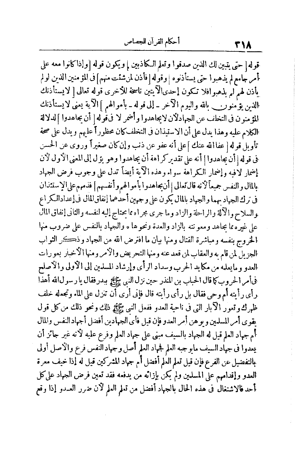 قَوْلُهُ حَتَّى يَتَبَيَّنَ لَكَ الَّذِينَ صَدَقُوا وَتَعْلَمَ الكاذبين وَيَكُونُ قَوْلُهُ وَإِذَا كَانُوا مَعَهُ عَلَى أَمْرٍ جامع لم يذهبوا حتى يستأذنوه وقوله فأذن لمن شئت منهم فِي الْمُؤْمِنِينَ الَّذِينَ لَوْ لَمْ يَأْذَنْ لَهُمْ لَمْ يَذْهَبُوا فَلَا تَكُونُ إحْدَى الْآيَتَيْنِ نَاسِخَةً لِلْأُخْرَى قَوْله تَعَالَى لا يَسْتَأْذِنُكَ الَّذِينَ يُؤْمِنُونَ بالله واليوم الآخر- إلى قوله- بأموالهم الْآيَةَ يَعْنِي لَا يَسْتَأْذِنُك الْمُؤْمِنُونَ فِي التَّخَلُّفِ عَنْ الْجِهَادِ لَأَنْ لَا يُجَاهِدُوا وَأَضْمَرَ لَا في قوله أن يجاهدوا لِدَلَالَةِ الْكَلَامِ عَلَيْهِ وَهَذَا يَدُلُّ عَلَى أَنَّ الاستيذان فِي التَّخَلُّفِ كَانَ مَحْظُورًا عَلَيْهِمْ وَيَدُلُّ عَلَى صحة تأويل قوله أن يجاهدوا أَنَّهُ عَلَى تَقْدِيرِ كَرَاهَةِ أَنْ يُجَاهِدُوا وَهُوَ يئول إلَى الْمَعْنَى الْأَوَّلِ لِأَنَّ إضْمَارَ لَا فِيهِ وَإِضْمَارَ الْكَرَاهَةِ سَوَاءٌ وَهَذِهِ الْآيَةُ أَيْضًا تَدُلُّ عَلَى وُجُوبِ فَرْضِ الْجِهَادِ بِالْمَالِ وَالنَّفْسِ جَمِيعًا لِأَنَّهُ قَالَ تَعَالَى أَنْ يُجَاهِدُوا بِأَمْوَالِهِمْ وَأَنْفُسِهِمْ فذمنهم عَلَى الِاسْتِئْذَانِ فِي تَرْكِ الْجِهَادِ بِهِمَا وَالْجِهَادُ بِالْمَالِ يَكُونُ عَلَى وَجْهَيْنِ أَحَدِهِمَا إنْفَاقُ الْمَالِ فِي إعْدَادِ الْكُرَاعِ وَالسِّلَاحِ وَالْآلَةِ وَالرَّاحِلَةِ وَالزَّادِ وَمَا جَرَى مَجْرَاهُ مِمَّا يَحْتَاجُ إلَيْهِ لِنَفْسِهِ وَالثَّانِي إنْفَاقُ الْمَالِ عَلَى غَيْرِهِ مِمَّا يُجَاهِدُ وَمَعُونَتُهُ بِالزَّادِ وَالْعُدَّةِ وَنَحْوِهَا وَالْجِهَادُ بِالنَّفْسِ عَلَى ضُرُوبٍ مِنْهَا الْخُرُوجُ بِنَفْسِهِ وَمُبَاشَرَةُ الْقِتَالِ وَمِنْهَا بَيَانُ مَا افْتَرَضَ اللَّه مِنْ الْجِهَادِ وَذِكْرُ الثواب الجزيل لمن قال بِهِ وَالْعِقَابِ لِمَنْ قَعَدَ عَنْهُ وَمِنْهَا التَّحْرِيضُ وَالْأَمْرُ وَمِنْهَا الْإِخْبَارُ بِعَوْرَاتِ الْعَدُوِّ وَمَا يَعْلَمُهُ مِنْ مَكَايِدِ الْحَرْبِ وَسَدَادِ الرَّأْيِ وَإِرْشَادِ الْمُسْلِمِينَ إلَى الْأَوْلَى وَالْأَصْلَحِ فِي أَمْرِ الْحُرُوبِ كَمَا