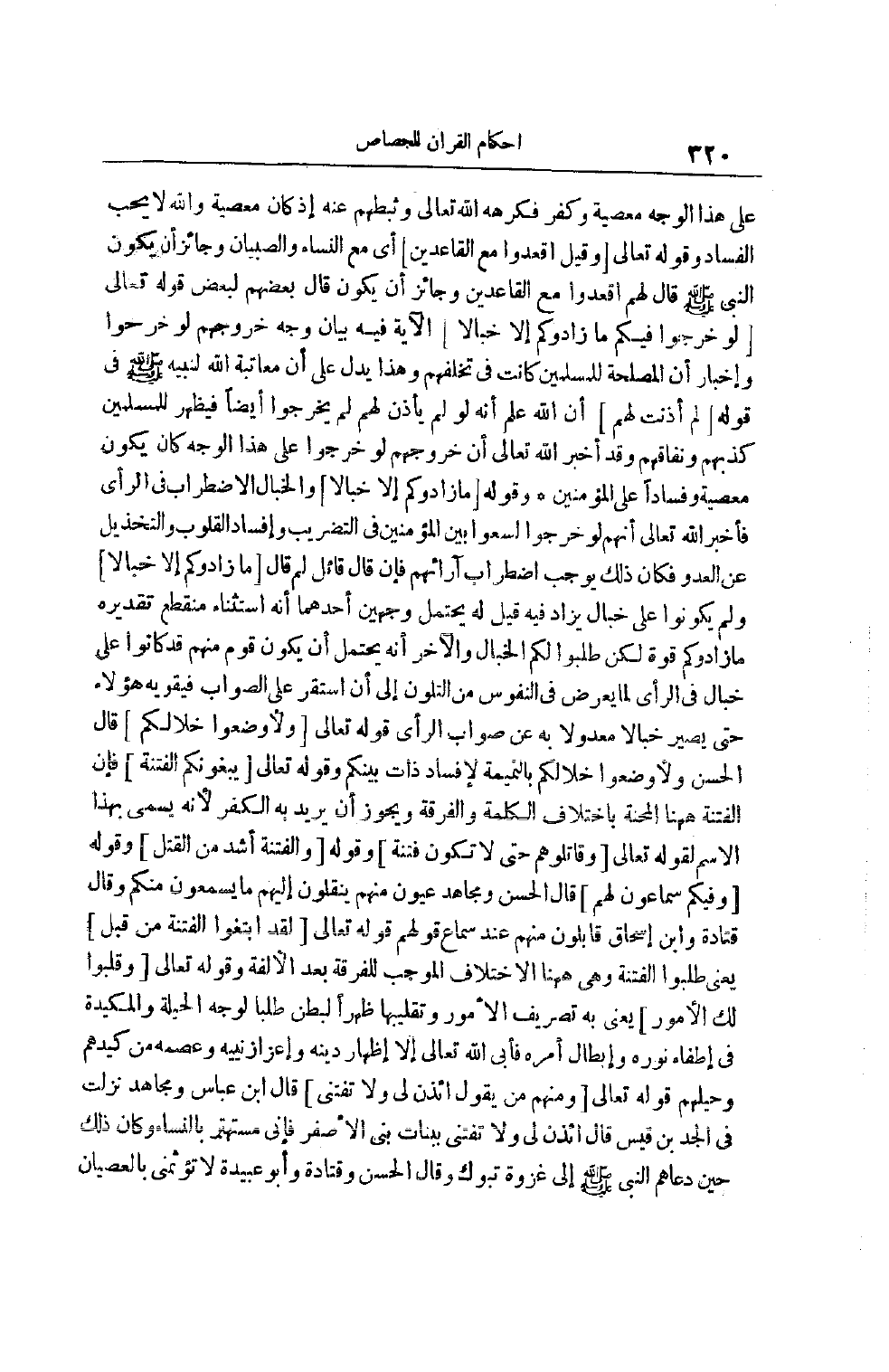 قَوْله تَعَالَى لَوْ خَرَجُوا فِيكُمْ ما زادوكم إلا خبالا الْآيَةَ فِيهِ بَيَانُ وَجْهِ خُرُوجِهِمْ لَوْ خَرَجُوا وَإِخْبَارٌ أَنَّ الْمَصْلَحَةَ لِلْمُسْلِمِينَ كَانَتْ فِي تَخَلُّفِهِمْ وَهَذَا يَدُلُّ عَلَى أَنَّ مُعَاتَبَةَ اللَّه لِنَبِيِّهِ صلّى اللَّه عليه وآله وسلم في قوله لم أذنت لهم أَنَّ اللَّه عَلِمَ أَنَّهُ لَوْ لَمْ يَأْذَنْ لَهُمْ لَمْ يَخْرُجُوا أَيْضًا فَيَظْهَرُ لِلْمُسْلِمِينَ كِذْبُهُمْ ونفاقهم وقد أخبر اللَّه تعالى أو خُرُوجَهُمْ لَوْ خَرَجُوا عَلَى هَذَا الْوَجْهِ كَانَ يَكُونُ مَعْصِيَةً وَفَسَادًا عَلَى الْمُؤْمِنِينَ وَقَوْلُهُ مَا زادوكم إلا خبالا وَالْخَبَالُ الِاضْطِرَابُ فِي الرَّأْيِ فَأَخْبَرَ اللَّه تَعَالَى أَنَّهُمْ لَوْ خَرَجُوا لَسَعَوْا بَيْنَ الْمُؤْمِنِينَ فِي التَّضْرِيبِ وَإِفْسَادِ الْقُلُوبِ وَالتَّخْذِيلِ عَنْ الْعَدُوِّ فَكَانَ ذَلِكَ يُوجِبُ اضْطِرَابَ آرَائِهِمْ فَإِنْ قَالَ قَائِلٌ لم قال ما زادوكم إلا خبالا وَلَمْ يَكُونُوا عَلَى خَبَالٍ يُزَادُ فِيهِ قِيلَ لَهُ يَحْتَمِلُ وَجْهَيْنِ أَحَدِهِمَا أَنَّهُ اسْتِثْنَاءٌ مُنْقَطِعٌ تَقْدِيرُهُ مَا زَادُوكُمْ قُوَّةً لَكِنْ طَلَبُوا لَكُمْ الْخَبَالَ وَالْآخَرُ أَنَّهُ يَحْتَمِلُ أَنْ يَكُونَ قَوْمٌ مِنْهُمْ قَدْ كَانُوا عَلَى خَبَالٍ فِي الرَّأْيِ لِمَا يَعْرِضُ فِي النُّفُوسِ مِنْ التَّلَوُّنِ إلَى أَنْ اسْتَقَرَّ عَلَى الصَّوَابِ فَيُقَوِّيهِ هَؤُلَاءِ حَتَّى يَصِيرَ خَبَالًا مَعْدُولًا بِهِ عَنْ صَوَابِ الرَّأْيِ قوله تعالى ولأوضعوا خلالكم قَالَ الْحَسَنُ وَلَأَوْضَعُوا خِلَالَكُمْ بِالنَّمِيمَةِ لِإِفْسَادِ ذَاتِ بينكم وقوله تعالى يبغونكم الفتنة فإن الفتنة هاهنا الْمِحْنَةُ بِاخْتِلَافِ الْكَلِمَةِ وَالْفُرْقَةِ وَيَجُوزُ أَنْ يُرِيدَ بِهِ الْكُفْرَ لِأَنَّهُ يُسَمَّى بِهَذَا الِاسْمِ لِقَوْلِهِ تعالى وقاتلوهم حتى لا تكون فتنة وقوله والفتنة أشد من القتل وقوله وفيكم سماعون لهم قَالَ الْحَسَنُ وَمُجَاهِدٌ عُيُونٌ مِنْهُمْ يَنْقُلُونَ إلَيْهِمْ مَا يَسْمَعُونَ مِنْكُمْ وَقَالَ قَتَادَةُ وَابْنُ إِسْحَاقَ قَابِلُونَ مِنْهُمْ عِنْدَ سَمَاعِ قَوْلِهِمْ