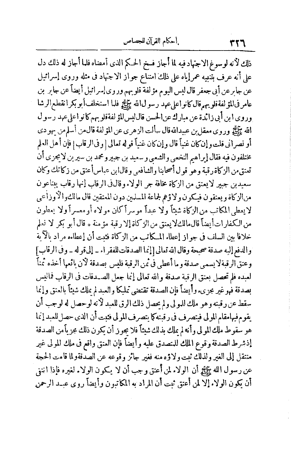 ذلك لأنه لوسوغ الِاجْتِهَادَ فِيهِ لَمَا أَجَازَ فَسْخَ الْحُكْمِ الَّذِي أَمْضَاهُ فَلَمَّا أَجَازَ لَهُ ذَلِكَ دَلَّ عَلَى أَنَّهُ عَرَفَ بِتَنْبِيهِ عُمَرَ إيَّاهُ عَلَى ذَلِكَ امْتِنَاعَ جَوَازِ الِاجْتِهَادِ فِي مِثْلِهِ وَرَوَى إسْرَائِيلُ عَنْ جَابِرٍ عَنْ أَبِي جَعْفَرٍ قَالَ لَيْسَ الْيَوْمَ مُؤَلَّفَةٌ قُلُوبُهُمْ وَرَوَى إسْرَائِيلُ أَيْضًا عَنْ جَابِرِ بْنِ عَامِرٍ فِي الْمُؤَلَّفَةِ قُلُوبُهُمْ قَالَ كَانُوا عَلَى عَهْدِ رَسُولِ اللَّه صَلَّى اللَّه عَلَيْهِ وآله وَسَلَّمَ فَلَمَّا اُسْتُخْلِفَ أَبُو بَكْرٍ انْقَطَعَ الرِّشَا وَرَوَى ابْنُ أَبِي زَائِدَةَ عَنْ مُبَارَكٍ عَنْ الحسن قال ليس المؤلفة قُلُوبُهُمْ كَانُوا عَلَى عَهْدِ رَسُولِ اللَّه صَلَّى اللَّه عَلَيْهِ وآله وَسَلَّمَ وَرَوَى مَعْقِلُ بْنُ عُبَيْدِ اللَّه قَالَ سألت الزهري عن المؤلفة قَالَ مَنْ أَسْلَمَ مِنْ يَهُودِيٍّ أَوْ نَصْرَانِيٍّ قُلْت وَإِنْ كَانَ غَنِيًّا قَالَ وَإِنْ كَانَ غنيا قوله تعالى وفي الرقاب فَإِنَّ أَهْلَ الْعِلْمِ مُخْتَلِفُونَ فِيهِ فَقَالَ إبْرَاهِيمُ النَّخَعِيُّ وَالشَّعْبِيُّ وَسَعِيدُ بْنُ جُبَيْرٍ وَمُحَمَّدُ بْنُ سِيرِينَ لَا يُجْزِي أَنْ تُعْتَقَ مِنْ الزَّكَاةِ رَقَبَةُ وَهُوَ قَوْلُ أَصْحَابِنَا وَالشَّافِعِيِّ وَقَالَ ابْنُ عَبَّاسٍ أَعْتِقْ مِنْ زَكَاتِك وَكَانَ سَعِيدُ بْنُ جُبَيْرٍ لَا يُعْتِقُ مِنْ الزَّكَاةِ مَخَافَةَ جَرِّ الولاء وقال فِي الرِّقَابِ إنَّهَا رِقَابٌ يُبْتَاعُونَ مِنْ الزَّكَاةِ وَيُعْتَقُونَ فَيَكُونُ وَلَاؤُهُمْ لِجَمَاعَةِ الْمُسْلِمِينَ دُونَ الْمُعْتِقِينَ قَالَ مَالِكٌ وَالْأَوْزَاعِيُّ لَا يُعْطَى الْمُكَاتَبُ مِنْ الزَّكَاةِ شَيْئًا وَلَا عَبْدًا مُوسِرًا كَانَ مَوْلَاهُ أَوْ مُعْسِرًا وَلَا يُعْطَوْنَ مِنْ الْكَفَّارَاتِ أَيْضًا قَالَ مَالِكٌ لَا يُعْتَقُ مِنْ الزَّكَاةِ إلَّا رَقَبَةٌ مُؤْمِنَةٌ قَالَ أَبُو بَكْرٍ لَا نَعْلَمُ خِلَافًا بَيْنَ السَّلَفِ فِي جَوَازِ إعْطَاءِ الْمُكَاتَبِ مِنْ الزَّكَاةِ فَثَبَتَ أَنَّ إعْطَاءَهُ مُرَادٌ بِالْآيَةِ وَالدَّفْعُ إلَيْهِ صَدَقَةٌ صَحِيحَةٌ وَقَالَ اللَّه تَعَالَى إنما الصدقات للفقراء- إلى قوله- وفي الرقاب وَعِتْقُ الرَّقَبَةِ لَا يُسَمَّى صَدَقَةً وَمَا أُعْطِيَ فِي ثَمَنِ الرَّقَبَةِ فَلَيْسَ بِصَدَقَةٍ لِأَنَّ بَائِعَهَا أَخَذَهُ ثَمَنًا لِعَبْدِهِ فَلَمْ تَحْصُلْ بِعِتْقِ الرَّقَبَةِ صَدَقَةٌ واللَّه تَعَالَى إنَّمَا جَعَلَ الصَّدَقَاتِ فِي الرِّقَابِ فَمَا لَيْسَ بِصَدَقَةٍ فَهُوَ غَيْرُ مُجْزِئٍ وَأَيْضًا فَإِنَّ الصَّدَقَةَ تَقْتَضِي تَمْلِيكًا وَالْعَبْدُ لَمْ يَمْلِكْ شَيْئًا بِالْعِتْقِ وَإِنَّمَا سَقَطَ عَنْ رَقَبَتِهِ وَهُوَ مِلْكٌ لِلْمَوْلَى وَلَمْ يَحْصُلْ ذَلِكَ الرِّقُّ لِلْعَبْدِ لِأَنَّهُ لَوْ حَصَلَ لَهُ لَوَجَبَ أَنْ يقوم فيها مَقَامَ الْمَوْلَى فَيَتَصَرَّفَ فِي رَقَبَتِهِ كَمَا يَتَصَرَّفُ الْمَوْلَى فَثَبَتَ أَنَّ الَّذِي حَصَلَ لِلْعَبْدِ إنَّمَا هُوَ سُقُوطُ مِلْكِ الْمَوْلَى وَأَنَّهُ لَمْ يَمْلِكْ بِذَلِكَ شَيْئَا فَلَا يَجُوزُ أَنْ يَكُونَ ذَلِكَ مُجْزِيًا مِنْ الصَّدَقَةِ إذْ شَرْطُ الصَّدَقَةِ وُقُوعُ الْمِلْكِ لِلْمُتَصَدَّقِ عَلَيْهِ وَأَيْضًا فَإِنَّ الْعِتْقَ وَاقِعٌ فِي مِلْكِ الْمَوْلَى غَيْرُ مُنْتَقِلٍ إلَى الْغَيْرِ وَلِذَلِكَ ثَبَتَ وَلَاؤُهُ مِنْهُ فَغَيْرُ جَائِزٍ وُقُوعُهُ عَنْ الصَّدَقَةِ وَلَمَّا قَامَتْ الْحُجَّةُ