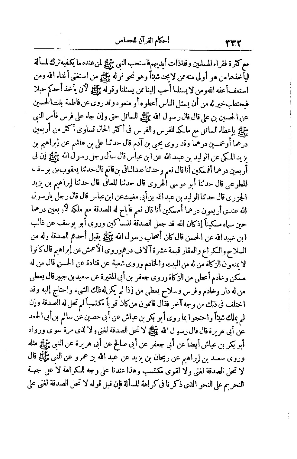 فَأَبَاحَ لَهُ الصَّدَقَةَ مَعَ مِلْكِهِ لِأَرْبَعِينَ دِرْهَمًا حِينَ سَمَّاهُ مِسْكِينًا إذْ كَانَ اللَّه قَدْ جَعَلَ الصَّدَقَةَ لِلْمَسَاكِينِ وَرَوَى أبو يوسف عن غالب ابن عُبَيْدِ اللَّه عَنْ الْحَسَنِ قَالَ كَانَ أَصْحَابُ رَسُولِ اللَّه صَلَّى اللَّه عليه وآله وَسَلَّمَ يَقْبَلُ أَحَدُهُمْ الصَّدَقَةَ وَلَهُ مِنْ السِّلَاحِ وَالْكُرَاعِ وَالْعَقَارِ قِيمَةُ عَشَرَةِ آلَافِ دِرْهَمٍ وَرَوَى الْأَعْمَشُ عَنْ إبْرَاهِيمَ قَالَ كَانُوا لَا يَمْنَعُونَ الزكاة من له من الْبَيْتُ وَالْخَادِمُ وَرَوَى شُعْبَةُ عَنْ قَتَادَةَ عَنْ الْحَسَنِ قَالَ مَنْ لَهُ مَسْكَنٌ وَخَادِمٌ أُعْطِيَ مِنْ الزَّكَاةِ وَرَوَى جَعْفَرِ بْنِ أَبِي الْمُغِيرَةِ عَنْ سَعِيدِ بْنِ جُبَيْرٍ قَالَ يُعْطَى مَنْ لَهُ دَارٌ وَخَادِمٌ وَفَرَسٌ وَسِلَاحٌ يُعْطَى مَنْ إذا لم يكن له ذلك الشيء واحتاج إلَيْهِ وَقَدْ اُخْتُلِفَ فِي ذَلِكَ مِنْ وَجْهٍ آخَرَ فَقَالَ قَائِلُونَ مَنْ كَانَ قَوِيًّا مُكْتَسِبًا لَمْ تَحِلَّ لَهُ الصَّدَقَةُ وَإِنْ لَمْ يَمْلِكْ شَيْئًا وَاحْتَجُّوا بِمَا