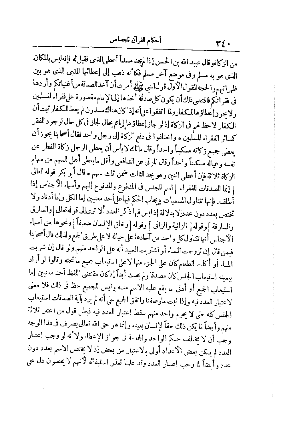 فَاقْتَضَى ذَلِكَ أَنْ يَكُونَ كُلُّ صَدَقَةٍ أَخَذَهَا إلَى الْإِمَامِ مَقْصُورَةً على فقراء المسلمين ولا يجوز إعطاؤها للكفار وَلَمَّا اتَّفَقُوا عَلَى أَنَّهُ إذَا كَانَ هُنَاكَ مُسْلِمُونَ لَمْ يُعْطَ الْكُفَّارُ ثَبَتَ أَنَّ الْكُفَّارَ لاحظ لَهُمْ فِي الزَّكَاةِ إذْ لَوْ جَازَ إعْطَاؤُهَا إيَّاهُمْ بِحَالٍ لَجَازَ فِي كُلِّ حَالٍ لِوُجُودِ الفقر كسائر الفقراء الْمُسْلِمِينَ وَاخْتَلَفُوا فِي دَفْعِ الزَّكَاةِ إلَى رَجُلٍ وَاحِدٍ فَقَالَ أَصْحَابُنَا يَجُوزُ أَنْ يُعْطِيَ جَمِيعَ زَكَاتِهِ مِسْكِينًا وَاحِدًا وَقَالَ مَالِكٌ لَا بَأْسَ أَنْ يُعْطِيَ الرَّجُلُ زَكَاةَ الْفِطْرِ عَنْ نَفْسِهِ وَعِيَالِهِ مِسْكِينًا وَاحِدًا وَقَالَ الْمُزَنِيّ عَنْ الشَّافِعِيِّ وَأَقَلُّ مَا يُعْطَى أَهْلُ السَّهْمِ مِنْ سِهَامِ الزَّكَاةِ ثَلَاثَةٌ فَإِنْ أَعْطَى اثْنَيْنِ وَهُوَ يَجِدُ الثَّالِثَ ضَمِنَ ثُلُثَ سَهْمٍ قَالَ أَبُو بَكْرٍ قوله تعالى إنما الصدقات للفقراء اسْمٌ لِلْجِنْسِ فِي الْمَدْفُوعِ وَالْمَدْفُوعِ إلَيْهِمْ وَأَسْمَاءُ الْأَجْنَاسِ إذَا أُطْلِقَتْ فَإِنَّهَا تَتَنَاوَلُ الْمُسَمَّيَاتِ بِإِيجَابِ الْحُكْمِ فِيهَا عَلَى أَحَدِ مَعْنَيَيْنِ إمَّا الْكُلُّ وَإِمَّا أَدْنَاهُ وَلَا تَخْتَصُّ بِعَدَدٍ دُونَ عَدَدٍ إلَّا بِدَلَالَةٍ إذْ لَيْسَ فِيهَا ذِكْرُ الْعَدَدِ أَلَا تَرَى إلَى قَوْله تَعَالَى وَالسَّارِقُ وَالسَّارِقَةُ وقوله الزانية والزانى وقوله وخلق الإنسان ضعيفا وَنَحْوِهَا مِنْ أَسْمَاءِ الْأَجْنَاسِ أَنَّهَا تَتَنَاوَلُ كُلَّ وَاحِدٍ مِنْ آحَادِهَا عَلَى حِيَالِهِ لَا عَلَى طَرِيقِ الْجَمْعِ وَلِذَلِكَ قَالَ أَصْحَابُنَا فِيمَنْ قَالَ إنْ تَزَوَّجْت النِّسَاءَ أَوْ اشْتَرَيْت الْعَبِيدَ أَنَّهُ عَلَى الْوَاحِدِ مِنْهُمْ وَلَوْ قَالَ إنْ شَرِبْت الْمَاءَ أَوْ أَكَلْت الطَّعَامَ كَانَ عَلَى الْجُزْءِ مِنْهَا لَا عَلَى اسْتِيعَابِ جَمِيعِ مَا تَحْتَهُ وَقَالُوا لَوْ أَرَادَ بِيَمِينِهِ اسْتِيعَابَ الْجِنْسِ كَانَ مُصَدَّقًا وَلَمْ يَحْنَثْ أَبَدًا إذْ كَانَ مُقْتَضَى اللَّفْظِ أَحَدَ مَعْنَيَيْنِ إمَّا اسْتِيعَابُ الْجَمِيعِ أَوْ أَدْنَى مَا يَقَعُ عَلَيْهِ الِاسْمُ مِنْهُ وَلَيْسَ لِلْجَمِيعِ حَظٌّ فِي ذَلِكَ فَلَا مَعْنَى لِاعْتِبَارِ الْعَدَدِ فِيهِ وَإِذَا ثَبَتَ مَا وَصَفْنَا وَاتَّفَقَ الْجَمِيعُ عَلَى أَنَّهُ لَمْ يُرِدْ بِآيَةِ الصَّدَقَاتِ اسْتِيعَابَ الْجِنْسِ كُلِّهِ حَتَّى لَا يَحْرُمَ وَاحِدٌ مِنْهُمْ سَقَطَ اعْتِبَارُ الْعَدَدِ فِيهِ فَبَطَلَ قَوْلُ من اعتبر ثلاثة منهم وأيضا لما يَكُنْ ذَلِكَ حَقًّا لِإِنْسَانٍ بِعَيْنِهِ وَإِنَّمَا هُوَ حَقُّ اللَّهِ تَعَالَى يُصْرَفُ فِي هَذَا الْوَجْهِ وَجَبَ أَنْ لَا يَخْتَلِفَ حُكْمُ الْوَاحِدِ وَالْجَمَاعَةِ فِي جَوَازِ الْإِعْطَاءِ وَلِأَنَّهُ لَوْ وَجَبَ اعْتِبَارُ الْعَدَدِ لَمْ يَكُنْ بَعْضُ الْأَعْدَادِ أَوْلَى بِالِاعْتِبَارِ مِنْ بَعْضٍ إذْ لَا يَخْتَصُّ الِاسْمُ بِعَدَدٍ دُونَ عَدَدٍ وَأَيْضًا لَمَّا وَجَبَ اعْتِبَارُ الْعَدَدِ وَقَدْ عَلِمْنَا تَعَذُّرَ اسْتِيفَائِهِ لِأَنَّهُمْ لَا يُحْصَوْنَ دل على
