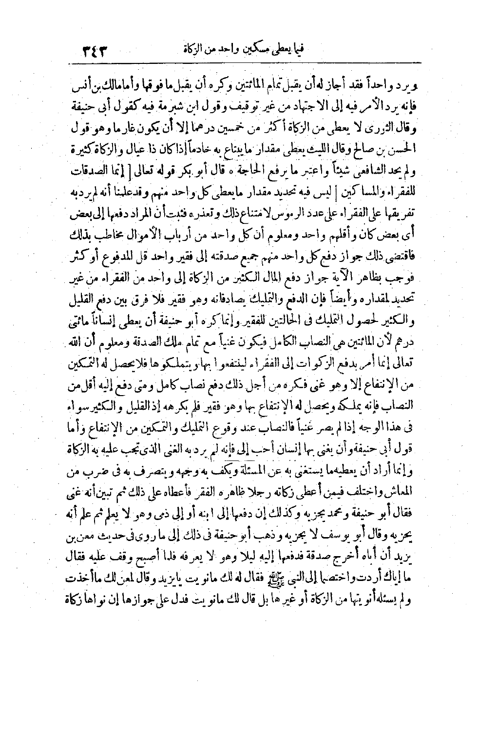وَيَرُدُّ وَاحِدًا فَقَدْ أَجَازَ لَهُ أَنْ يَقْبَلَ تَمَامَ الْمِائَتَيْنِ وَكَرِهَ أَنْ يَقْبَلَ مَا فَوْقَهَا وَأَمَّا مَالِكُ بْنُ أَنَسٍ فَإِنَّهُ يَرُدُّ الْأَمْرَ فِيهِ إلَى الِاجْتِهَادِ مِنْ غَيْرِ تَوْقِيفٍ وَقَوْلُ ابْنِ شُبْرُمَةَ فِيهِ كَقَوْلِ أَبِي حَنِيفَةَ وَقَالَ الثَّوْرِيُّ لَا يُعْطَى مِنْ الزَّكَاةِ أَكْثَرَ مِنْ خَمْسِينَ دِرْهَمًا إلَّا أَنْ يَكُونَ غَارِمًا وَهُوَ قَوْلُ الْحَسَنِ بْنِ صَالِحٍ وَقَالَ اللَّيْثُ يُعْطَى مِقْدَارُ مَا يَبْتَاعُ بِهِ خَادِمًا إذَا كَانَ ذَا عِيَالٍ وَالزَّكَاةُ كَثِيرَةٌ وَلَمْ يَحُدَّ الشَّافِعِيُّ شَيْئًا وَاعْتَبَرَ مَا يَرْفَعُ الْحَاجَةَ قَالَ أَبُو بَكْرٍ قَوْله تَعَالَى إِنَّمَا الصَّدَقَاتُ لِلْفُقَرَاءِ وَالْمَسَاكِينِ لَيْسَ فِيهِ تَحْدِيدُ مِقْدَارِ مَا يُعْطَى كُلُّ وَاحِدٍ مِنْهُمْ وَقَدْ عَلِمْنَا أَنَّهُ لَمْ يُرِدْ بِهِ تَفْرِيقَهَا عَلَى الْفُقَرَاءِ عَلَى عَدَدِ الرُّءُوسِ لِامْتِنَاعِ ذَلِكَ وَتَعَذُّرِهِ فَثَبَتَ أَنَّ الْمُرَادَ دَفْعُهَا إلَى بَعْضٍ أَيِّ بَعْضٍ كَانَ وَأَقَلُّهُمْ وَاحِدٌ وَمَعْلُومٌ أَنَّ كُلَّ وَاحِدٍ مِنْ أَرْبَابِ الْأَمْوَالِ مُخَاطَبٌ بِذَلِكَ فَاقْتَضَى ذَلِكَ جَوَازَ دَفْعِ كُلِّ وَاحِدٍ مِنْهُمْ جَمِيعَ صَدَقَتِهِ إلَى فَقِيرٍ وَاحِدٍ قَلَّ الْمَدْفُوعُ أَوْ كَثُرَ فَوَجَبَ بِظَاهِرِ الْآيَةِ جَوَازُ دَفْعِ الْمَالِ الْكَثِيرِ مِنْ الزَّكَاةِ إلَى وَاحِدٍ مِنْ الْفُقَرَاءِ مِنْ غَيْرِ تَحْدِيدٍ لِمِقْدَارِهِ وَأَيْضًا فَإِنَّ الدَّفْعَ وَالتَّمْلِيكَ يُصَادِفَانِهِ وَهُوَ فَقِيرٌ فَلَا فَرْقَ بَيْنَ دَفْعِ الْقَلِيلِ وَالْكَثِيرِ لِحُصُولِ التَّمْلِيكِ فِي الْحَالَتَيْنِ لِلْفَقِيرِ وَإِنَّمَا كَرِهَ أَبُو حنيفة أن يعطى إنسانا مِائَتَيْ دِرْهَمٍ لِأَنَّ الْمِائَتَيْنِ هِيَ النِّصَابُ الْكَامِلُ فَيَكُونُ غَنِيًّا مَعَ تَمَامِ مِلْكِ الصَّدَقَةِ وَمَعْلُومٌ أَنَّ اللَّهَ تَعَالَى إنَّمَا أَمَرَ بِدَفْعِ الزَّكَوَاتِ إلَى الْفُقَرَاءِ لِيَنْتَفِعُوا بِهَا وَيَتَمَلَّكُوهَا فَلَا يَحْصُلُ لَهُ التَّمْكِينُ مِنْ الِانْتِفَاعِ إلَّا وَهُوَ غَنِيٌّ فَكَرِهَ مِنْ أَجْلِ ذَلِكَ دَفْعَ نِصَابٍ كَامِلٍ وَمَتَى دَفَعَ إلَيْهِ أَقَلَّ مِنْ النِّصَابِ فَإِنَّهُ يَمْلِكُهُ وَيَحْصُلُ لَهُ الِانْتِفَاعُ بِهَا وَهُوَ فَقِيرٌ فَلَمْ يَكْرَهْهُ إذْ الْقَلِيلُ وَالْكَثِيرُ سَوَاءٌ فِي هَذَا الْوَجْهِ إذَا لَمْ يَصِرْ غَنِيًّا فَالنِّصَابُ عِنْدَ وُقُوعِ التَّمْلِيكِ وَالتَّمْكِينِ مِنْ الِانْتِفَاعِ وَأَمَّا قول أبى حنيفة وأن يغنى بها إنسان أَحَبُّ إلَيَّ فَإِنَّهُ لَمْ يُرِدْ بِهِ الْغِنَى الَّذِي تَجِبُ عَلَيْهِ بِهِ الزَّكَاةُ وَإِنَّمَا أَرَادَ أَنْ يُعْطِيَهُ مَا يَسْتَغْنِي بِهِ عَنْ الْمَسْأَلَةِ وَيَكُفُّ بِهِ وَجْهَهُ وَيَتَصَرَّفُ بِهِ فِي ضَرْبٍ مِنْ الْمَعَاشِ وَاخْتُلِفَ فِيمَنْ أَعْطَى زَكَاتَهُ رَجُلًا ظَاهِرُهُ الْفَقْرُ فَأَعْطَاهُ عَلَى ذَلِكَ ثُمَّ تَبَيَّنَ أَنَّهُ غَنِيٌّ فَقَالَ أَبُو حَنِيفَةَ وَمُحَمَّدٌ يَجْزِيهِ وَكَذَلِكَ إنْ دَفَعَهَا إلَى ابْنِهِ أَوْ إلَى ذِمِّيٍّ وَهُوَ لَا يَعْلَمُ ثُمَّ عَلِمَ أَنَّهُ يجزيه وقال أبو يوسف لا يجزيه وذهب أَبُو حَنِيفَةَ فِي ذَلِكَ إلَى مَا