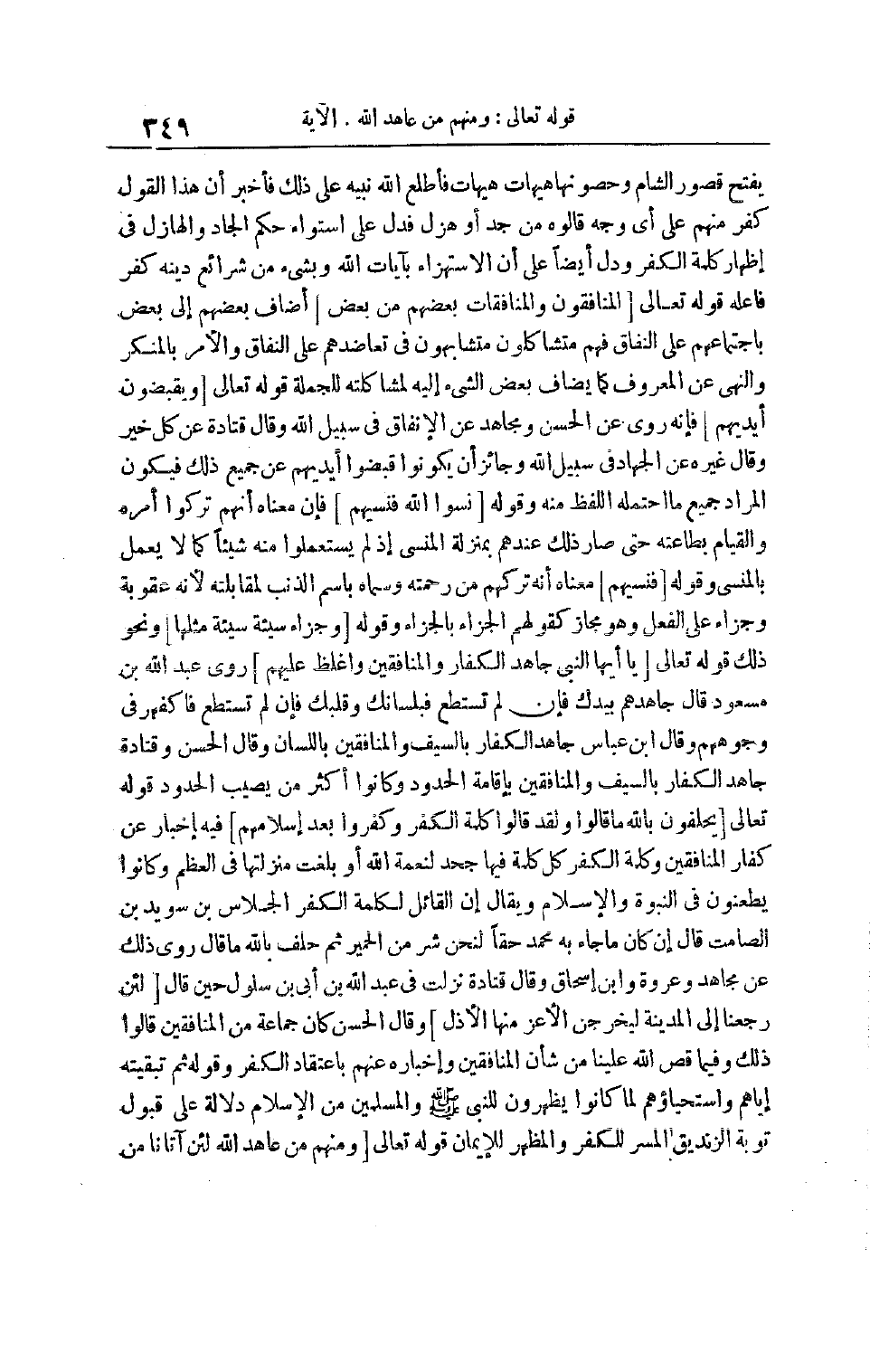 وَنَحْوِ ذَلِكَ قَوْله تَعَالَى يَا أَيُّهَا النَّبِيُّ جَاهِدِ الْكُفَّارَ وَالْمُنَافِقِينَ واغلظ عليهم رَوَى عَبْدُ اللَّهِ بْنُ مَسْعُودٍ قَالَ جَاهِدْهُمْ بِيَدِك فَإِنْ لَمْ تَسْتَطِعْ فَبِلِسَانِك وَقَلْبِك فَإِنْ لَمْ تَسْتَطِعْ فَاكْفَهَرَّ فِي وُجُوهِهِمْ وَقَالَ ابْنُ عَبَّاسٍ جَاهِدْ الْكُفَّارَ بِالسَّيْفِ وَالْمُنَافِقِينَ بِاللِّسَانِ وَقَالَ الْحَسَنُ وَقَتَادَةُ جَاهِدْ الْكُفَّارَ بِالسَّيْفِ وَالْمُنَافِقِينَ بِإِقَامَةِ الْحُدُودِ وَكَانُوا أَكْثَرَ مَنْ يُصِيبُ الْحُدُودَ