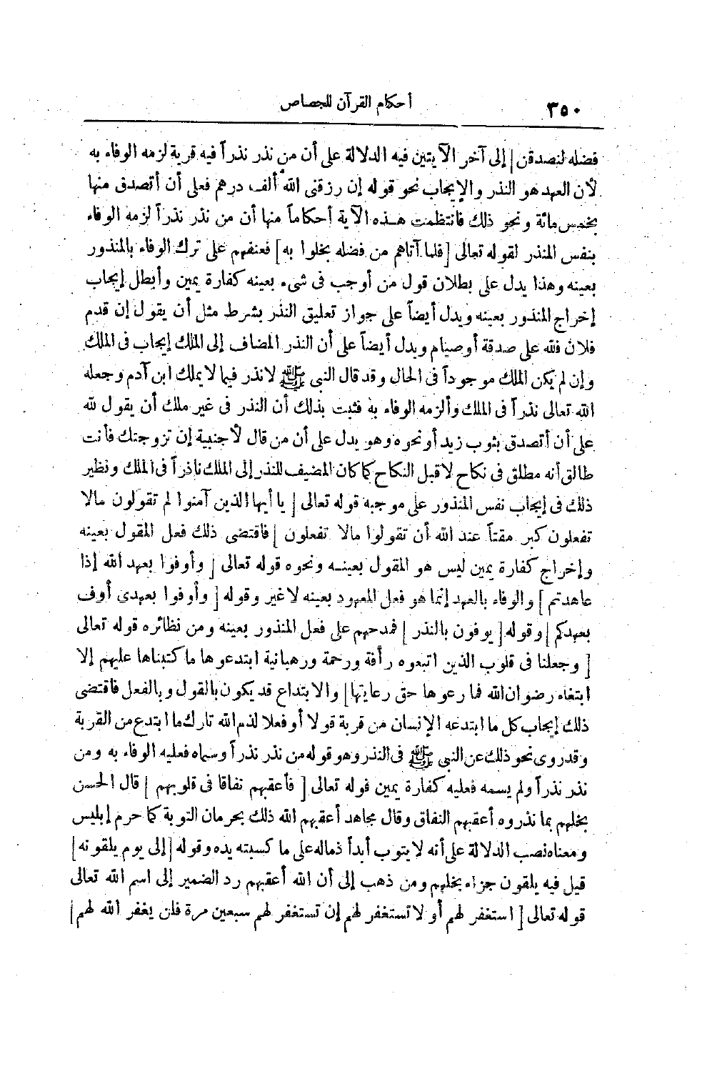 فَانْتَظَمَتْ هَذِهِ الْآيَةُ أَحْكَامًا مِنْهَا أَنَّ مَنْ نَذَرَ نَذْرًا لَزِمَهُ الْوَفَاءُ بِنَفْسِ المنذر لِقَوْلِهِ تَعَالَى فَلَمَّا آتَاهُمْ مِنْ فَضْلِهِ بَخِلُوا به فَعَنَّفَهُمْ عَلَى تَرْكِ الْوَفَاءِ بِالْمَنْذُورِ بِعَيْنِهِ وَهَذَا يَدُلُّ عَلَى بُطْلَانِ قَوْلِ مَنْ أَوْجَبَ فِي شَيْءٍ بِعَيْنِهِ كَفَّارَةَ يَمِينٍ وَأَبْطَلَ إيجَابَ إخْرَاجِ الْمَنْذُورِ بِعَيْنِهِ وَيَدُلُّ أَيْضًا عَلَى جَوَازِ تَعْلِيقِ النَّذْرِ بِشَرْطٍ مِثْلُ أَنْ يَقُولَ إنْ قَدَمَ فُلَانٌ فَلِلَّهِ عَلَيَّ صَدَقَةٌ أَوْ صِيَامٌ وَيَدُلُّ أَيْضًا عَلَى أَنَّ النَّذْرَ الْمُضَافَ إلَى الْمِلْكِ إيجَابٌ فِي الْمِلْكِ وَإِنْ لَمْ يَكُنْ الْمِلْكُ مَوْجُودًا فِي الْحَالِ