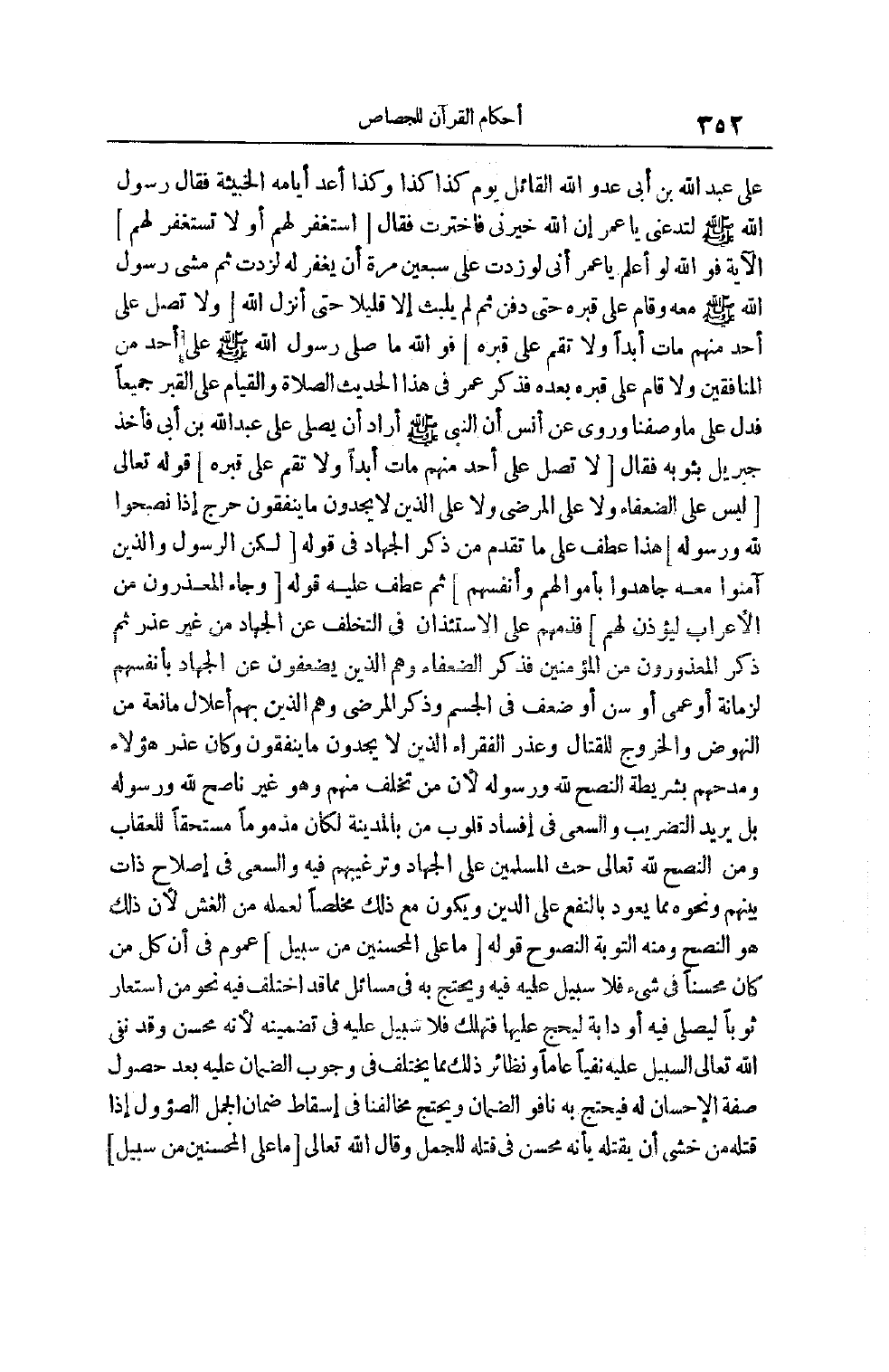 قَوْله تَعَالَى لَيْسَ عَلَى الضُّعَفَاءِ وَلا عَلَى الْمَرْضَى وَلا عَلَى الَّذِينَ لا يَجِدُونَ مَا يُنْفِقُونَ حَرَجٌ إذا نصحوا لله ورسوله هَذَا عَطْفٌ عَلَى مَا تَقَدَّمَ مِنْ ذِكْرِ الْجِهَادِ فِي قَوْلِهِ لَكِنِ الرَّسُولُ وَالَّذِينَ آمَنُوا معه جاهدوا بأموالهم وأنفسهم ثُمَّ عَطَفَ عَلَيْهِ قَوْلَهُ وَجَاءَ الْمُعَذِّرُونَ مِنَ الأعراب ليؤذن لهم فَذَمَّهُمْ عَلَى الِاسْتِئْذَانِ فِي التَّخَلُّفِ عَنْ الْجِهَادِ من غير عذر ثم ذكر المعذورون مِنْ الْمُؤْمِنِينَ فَذَكَرَ الضُّعَفَاءَ وَهُمْ الَّذِينَ يَضْعُفُونَ عَنْ الْجِهَادِ بِأَنْفُسِهِمْ لِزَمَانَةٍ أَوْ عَمًى أَوْ سِنٍّ أَوْ ضَعْفٍ فِي الْجِسْمِ وَذَكَرَ الْمَرْضَى وَهُمْ الَّذِينَ بِهِمْ أَعْلَالٌ مَانِعَةٌ مِنْ النُّهُوضِ وَالْخُرُوجِ لِلْقِتَالِ وَعَذَرَ الْفُقَرَاءَ الَّذِينَ لَا يَجِدُونَ مَا يُنْفِقُونَ وَكَانَ عُذْرُ هَؤُلَاءِ وَمَدْحُهُمْ بِشَرِيطَةِ النُّصْحِ لِلَّهِ وَرَسُولِهِ لِأَنَّ مَنْ تَخَلَّفَ مِنْهُمْ وَهُوَ غَيْرُ نَاصِحٍ لِلَّهِ وَرَسُولِهِ بَلْ يُرِيدُ التَّضْرِيبَ وَالسَّعْيَ فِي إفْسَادِ قُلُوبِ مَنْ بِالْمَدِينَةِ لَكَانَ مَذْمُومًا مُسْتَحِقًّا لِلْعِقَابِ وَمِنْ النُّصْحِ لِلَّهِ تَعَالَى حَثُّ الْمُسْلِمِينَ عَلَى الْجِهَادِ وَتَرْغِيبُهُمْ فِيهِ وَالسَّعْيُ فِي إصْلَاحِ ذَاتِ بَيْنِهِمْ وَنَحْوِهِ مِمَّا يَعُودُ بِالنَّفْعِ عَلَى الدِّين وَيَكُونُ مَعَ ذَلِكَ مُخَلِّصًا لِعَمَلِهِ مِنْ الْغِشِّ لِأَنَّ ذَلِكَ هُوَ النصح ومنه التوبة النصوح قوله ما على المحسنين من سبيل عُمُومٌ فِي أَنَّ كُلَّ مَنْ كَانَ مُحْسِنًا فِي شَيْءٍ فَلَا سَبِيلَ عَلَيْهِ فِيهِ وَيُحْتَجُّ بِهِ فِي مَسَائِلَ مِمَّا قَدْ اُخْتُلِفَ فِيهِ نَحْوُ مَنْ اسْتَعَارَ ثَوْبًا لِيُصَلِّيَ فِيهِ أَوْ دَابَّةً لِيَحُجَّ عَلَيْهَا فَتَهْلَكُ فَلَا سَبِيلَ عَلَيْهِ فِي تَضْمِينِهِ لِأَنَّهُ مُحْسِنٌ وَقَدْ نَفَى اللَّهُ تَعَالَى السَّبِيلَ عَلَيْهِ نَفْيًا عَامًّا وَنَظَائِرُ ذَلِكَ مِمَّا يَخْتَلِفُ فِي وُجُوبِ الضَّمَانِ عَلَيْهِ بَعْدَ حُصُولِ صِفَةِ الْإِحْسَانِ لَهُ فَيَحْتَجُّ بِهِ نَافُو الضَّمَانِ وَيَحْتَجُّ مُخَالِفُنَا فِي إسْقَاطِ ضَمَانِ الْجَمَلِ الصَّئُولِ إذَا قَتَلَهُ مَنْ خَشِيَ أَنْ يَقْتُلَهُ بِأَنَّهُ مُحْسِنٌ فِي قَتْلِهِ لِلْجَمَلِ وَقَالَ اللَّهُ تعالى ما على المحسنين من سبيل