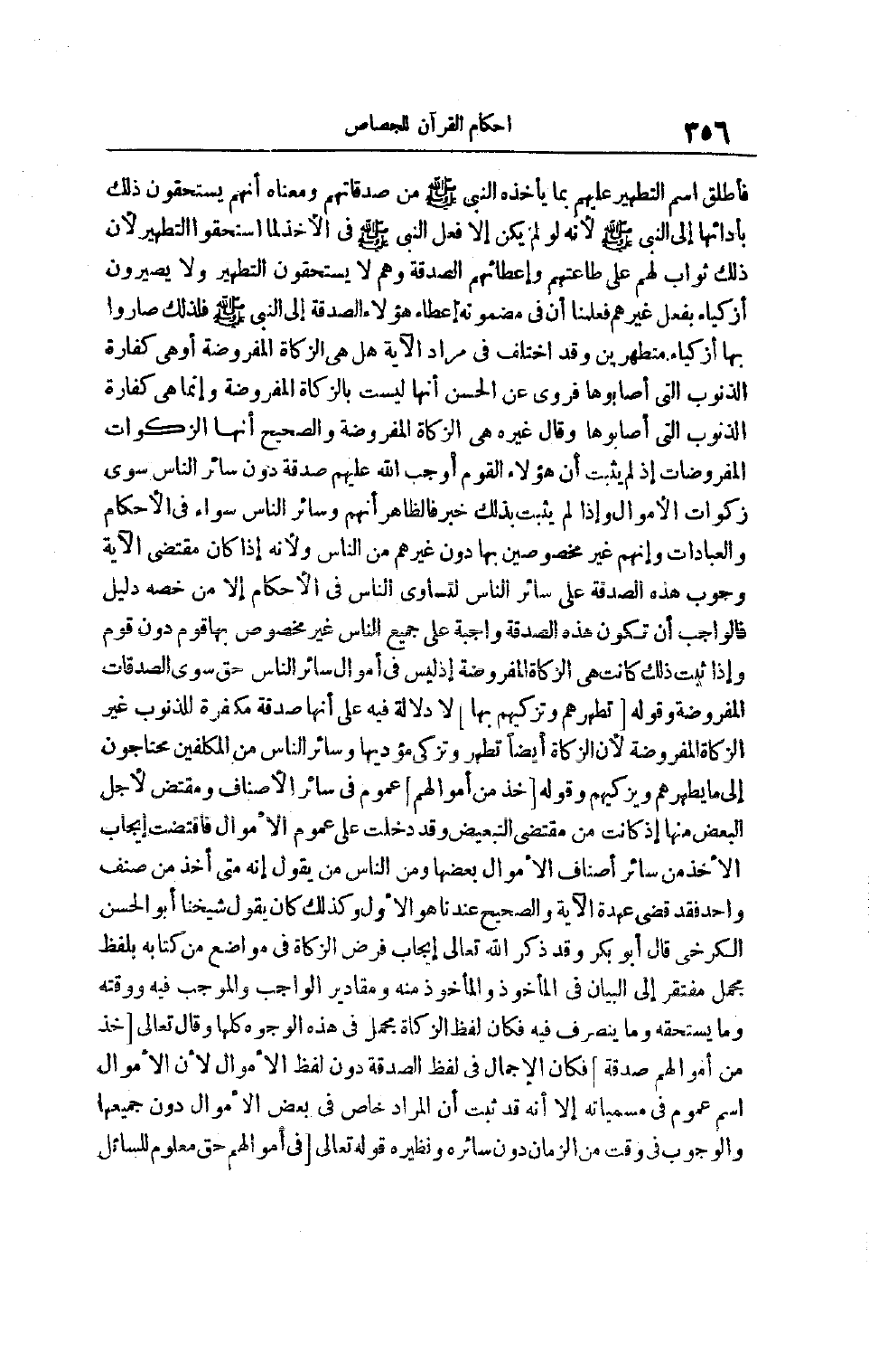 فَأَطْلَقَ اسْمَ التَّطْهِيرِ عَلَيْهِمْ بِمَا يَأْخُذُهُ النَّبِيُّ صَلَّى اللَّهُ عَلَيْهِ وَسَلَّمَ مِنْ صَدَقَاتِهِمْ وَمَعْنَاهُ أَنَّهُمْ يَسْتَحِقُّونَ ذَلِكَ بِأَدَائِهَا إلَى النَّبِيِّ صَلَّى اللَّهُ عَلَيْهِ وَسَلَّمَ لِأَنَّهُ لَوْ لَمْ يَكُنْ إلَّا فِعْلُ النَّبِيِّ صَلَّى اللَّهُ عَلَيْهِ وَسَلَّمَ فِي الْأَخْذِ لَمَا اسْتَحَقُّوا التَّطْهِيرَ لِأَنَّ ذَلِكَ ثَوَابٌ لَهُمْ عَلَى طَاعَتِهِمْ وَإِعْطَائِهِمْ الصَّدَقَةَ وَهُمْ لَا يَسْتَحِقُّونَ التَّطْهِيرَ وَلَا يَصِيرُونَ أَزْكِيَاءَ بِفِعْلِ غَيْرِهِمْ فَعَلِمْنَا أَنَّ فِي مَضْمُونِهِ إعْطَاءَ هَؤُلَاءِ الصَّدَقَةَ إلَى النَّبِيِّ صَلَّى اللَّهُ عَلَيْهِ وَسَلَّمَ فَلِذَلِكَ صَارُوا بِهَا أَزْكِيَاءَ مُتَطَهِّرِينَ وَقَدْ اُخْتُلِفَ فِي مُرَادِ الْآيَةِ هَلْ هِيَ الزَّكَاةُ الْمَفْرُوضَةُ أو هي كفارة الذُّنُوبِ الَّتِي أَصَابُوهَا فَرُوِيَ عَنْ الْحَسَنِ أَنَّهَا لَيْسَتْ بِالزَّكَاةِ الْمَفْرُوضَةِ وَإِنَّمَا هِيَ كَفَّارَةُ الذُّنُوبِ الَّتِي أَصَابُوهَا وَقَالَ غَيْرُهُ هِيَ الزَّكَاةُ الْمَفْرُوضَةُ وَالصَّحِيحُ أَنَّهَا الزَّكَوَاتُ الْمَفْرُوضَاتُ إذْ لَمْ يَثْبُتْ أَنَّ هَؤُلَاءِ الْقَوْمَ أَوْجَبَ اللَّهُ عَلَيْهِمْ صَدَقَةً دُونَ سَائِرِ النَّاسِ سِوَى زَكَوَاتِ الْأَمْوَالِ وَإِذَا لَمْ يَثْبُتْ بِذَلِكَ خَبَرٌ فَالظَّاهِرُ أَنَّهُمْ وَسَائِرَ النَّاسِ سَوَاءٌ فِي الْأَحْكَامِ وَالْعِبَادَاتِ وَأَنَّهُمْ غَيْرُ مَخْصُوصِينَ بِهَا دُونَ غَيْرِهِمْ مِنْ النَّاسِ وَلِأَنَّهُ إذَا كَانَ مُقْتَضَى الْآيَةِ وُجُوبُ هَذِهِ الصَّدَقَةِ عَلَى سَائِرِ النَّاسِ لِتَسَاوِي النَّاسِ فِي الْأَحْكَامِ إلَّا مَنْ خَصَّهُ دَلِيلٌ فَالْوَاجِبُ أَنْ تَكُونَ هَذِهِ الصَّدَقَةُ وَاجِبَةً عَلَى جَمِيعِ النَّاسِ غَيْرَ مَخْصُوصٍ بِهَا قَوْمٌ دُونَ قَوْمٍ وَإِذَا ثَبَتَ ذَلِكَ كَانَتْ هِيَ الزَّكَاةَ الْمَفْرُوضَةَ إذْ لَيْسَ فِي أَمْوَالِ سَائِرِ النَّاسِ حَقٌّ سِوَى الصَّدَقَاتِ المفروضة وقوله تطهرهم وتزكيهم بها لَا دَلَالَةَ فِيهِ عَلَى أَنَّهَا صَدَقَةٌ مُكَفِّرَةٌ للذنوب غير الزكاة المفروضة لأن الزكاة أَيْضًا تُطَهِّرُ وَتُزَكِّي مُؤَدِّيَهَا وَسَائِرُ النَّاسِ مِنْ الْمُكَلَّفِينَ مُحْتَاجُونَ إلَى مَا يُطَهِّرُهُمْ وَيُزَكِّيهِمْ وَقَوْلُهُ خذ من أموالهم عموم في سائر الأصناف ومقتض لأجل الْبَعْضِ مِنْهَا إذْ كَانَتْ مِنْ مُقْتَضَى التَّبْعِيضِ وَقَدْ دَخَلَتْ عَلَى عُمُومِ الْأَمْوَالِ فَاقْتَضَتْ إيجَابَ الْأَخْذِ مِنْ سَائِرِ أَصْنَافِ الْأَمْوَالِ بَعْضَهَا وَمِنْ النَّاسِ مَنْ يَقُولُ إنَّهُ مَتَى أَخَذَ مِنْ صِنْفٍ وَاحِدٍ فَقَدْ قَضَى عُهْدَةَ الْآيَةِ وَالصَّحِيحُ عِنْدَنَا هُوَ الْأَوَّلُ وَكَذَلِكَ كَانَ يَقُولُ شَيْخُنَا أَبُو الْحَسَنِ الْكَرْخِيُّ قَالَ أَبُو بَكْرٍ وَقَدْ ذَكَرَ اللَّهُ تَعَالَى إيجَابَ فَرْضِ الزَّكَاةِ فِي مَوَاضِعَ مِنْ كِتَابِهِ بِلَفْظٍ مُجْمَلٍ مُفْتَقِرٍ إلَى الْبَيَانِ فِي الْمَأْخُوذِ وَالْمَأْخُوذِ مِنْهُ وَمَقَادِيرِ الْوَاجِبِ وَالْمُوجِبِ فِيهِ وَوَقْتِهِ وَمَا يَسْتَحِقُّهُ وَمَا يَنْصَرِفُ فيه فكان لفظ الزكاة مجمل فِي هَذِهِ الْوُجُوهِ كُلِّهَا وَقَالَ تَعَالَى خُذْ من أموالهم صدقة فَكَانَ الْإِجْمَالُ فِي لَفْظِ الصَّدَقَةِ دُونَ لَفْظِ الْأَمْوَالِ لِأَنَّ الْأَمْوَالَ اسْمُ عُمُومٍ فِي مُسَمَّيَاتِهِ إلَّا أَنَّهُ قَدْ ثَبَتَ أَنَّ الْمُرَادَ خَاصٌّ فِي بَعْضِ الْأَمْوَالِ دُونَ جَمِيعِهَا وَالْوُجُوبَ فِي وَقْتٍ مِنْ الزَّمَانِ دُونَ سَائِرِهِ وَنَظِيرُهُ قَوْله تعالى فى أموالهم حق معلوم للسائل والمحروم