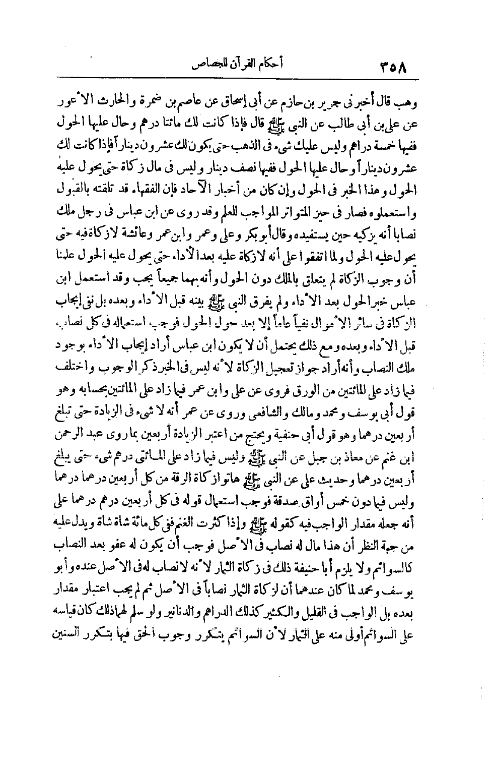 وَلَيْسَ فِي مَالٍ زَكَاةٌ حَتَّى يَحُولَ عَلَيْهِ الْحَوْلُ وَهَذَا الْخَبَرُ فِي الْحَوْلِ وَإِنْ كَانَ مِنْ أَخْبَارِ الْآحَادِ فَإِنَّ الْفُقَهَاءَ قَدْ تَلَقَّتْهُ بِالْقَبُولِ وَاسْتَعْمَلُوهُ فَصَارَ فِي حيز المتواتر المواجب لِلْعِلْمِ وَقَدْ رُوِيَ عَنْ ابْنِ عَبَّاسٍ فِي رَجُلٍ مَلَكَ نِصَابًا أَنَّهُ يُزَكِّيهِ حِينَ يَسْتَفِيدُهُ وَقَالَ أَبُو بَكْرٍ وَعَلِيٌّ وَعُمَرُ وَابْنُ عُمَرَ وَعَائِشَةُ لَا زَكَاةَ فِيهِ حَتَّى يَحُولَ عَلَيْهِ الْحَوْلُ وَلَمَّا اتَّفَقُوا عَلَى أَنَّهُ لَا زَكَاةَ عَلَيْهِ بَعْدَ الْأَدَاءِ حَتَّى يَحُولَ عَلَيْهِ الْحَوْلُ علمنا أن وجوب الزكاة لم يتعلق بالملك دُونَ الْحَوْلِ وَأَنَّهُ بِهِمَا جَمِيعًا يَجِبُ وَقَدْ اسْتَعْمَلَ ابْنُ عَبَّاسٍ خَبَرَ الْحَوْلِ بَعْدَ الْأَدَاءِ وَلَمْ يُفَرِّقْ النَّبِيُّ صَلَّى اللَّهُ عَلَيْهِ وَسَلَّمَ بَيْنَهُ قَبْلَ الْأَدَاءِ وَبَعْدَهُ بَلْ نَفَى إيجَابَ الزَّكَاةِ فِي سَائِرِ الْأَمْوَالِ نَفْيًا عَامًّا إلَّا بَعْدَ حَوَلِ الْحَوْلِ فَوَجَبَ اسْتِعْمَالُهُ فِي كُلِّ نِصَابٍ قَبْلَ الْأَدَاءِ وَبَعْدَهُ وَمَعَ ذَلِكَ يُحْتَمَلُ أَنْ لَا يَكُونَ ابْنُ عَبَّاسٍ أَرَادَ إيجَابَ الْأَدَاءِ بِوُجُودِ مِلْكِ النِّصَابِ وَأَنَّهُ أَرَادَ جَوَازَ تَعْجِيلِ الزَّكَاةِ لِأَنَّهُ لَيْسَ فِي الْخَبَرِ ذِكْرُ الْوُجُوبِ وَاخْتُلِفَ فِيمَا زَادَ عَلَى الْمِائَتَيْنِ مِنْ الْوَرِقِ