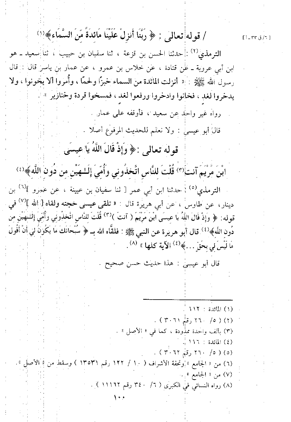 التِّرْمِذِيّ: حَدثنَا ابْن أبي عمر [ثَنَا سُفْيَان بن عُيَيْنَة، عَن عَمْرو] بن دِينَار، عَن طَاوس، عَن أبي هُرَيْرَة قَالَ: تلقى عِيسَى حجَّته ولقاه [الله] فِي قَوْله: {وَإِذ قَالَ الله يَا عِيسَى ابْن مَرْيَم (آنت) قلت للنَّاس اتخذوني وَأمي إِلَهَيْنِ من دون الله} قَالَ أَبُو هُرَيْرَة عَن النَّبِي - صَلَّى اللَّهُ عَلَيْهِ وَسَلَّم َ -: فلقاه الله ب {سُبْحَانَكَ مَا يكون لي أَن أَقُول مَا لَيْسَ لي بِحَق} الْآيَة كلهَا ".