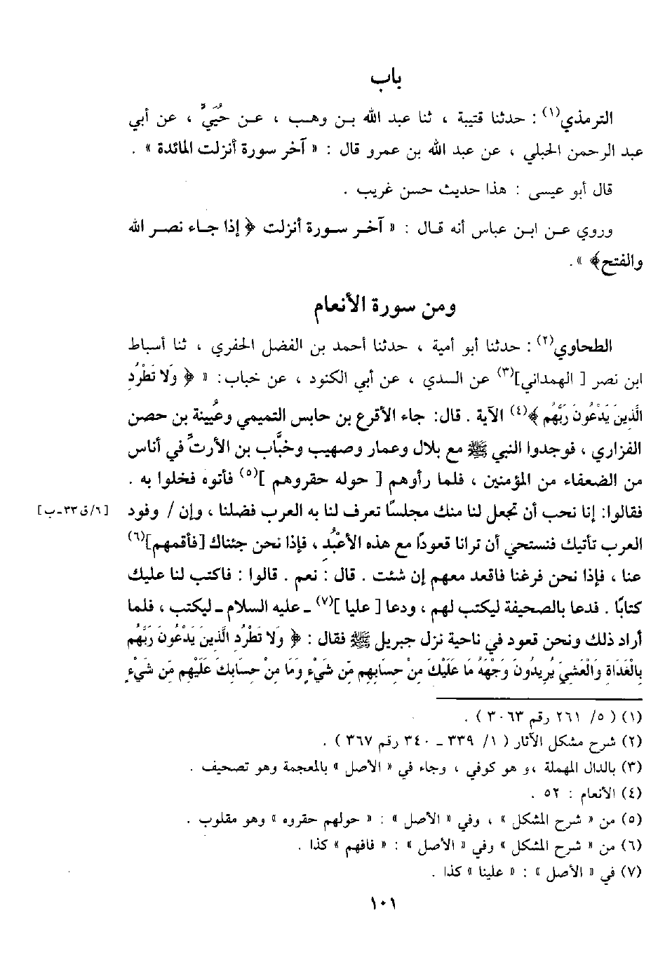 الطَّحَاوِيّ: حَدثنَا أَبُو أُميَّة، حَدثنَا أَحْمد بن الْفضل الْحَفرِي، ثَنَا أَسْبَاط ابْن نصر [الْهَمدَانِي] عَن السّديّ، عَن أبي الكنود، عَن خباب: " {وَلَا تطرد الَّذين يدعونَ رَبهم} الْآيَة. قَالَ: جَاءَ الْأَقْرَع بن حَابِس التَّمِيمِي وعيينة بن حصن الْفَزارِيّ، فوجدوا النَّبِي - صَلَّى اللَّهُ عَلَيْهِ وَسَلَّم َ - مَعَ بِلَال وعمار وصهيب وخباب بن الْأَرَت فِي أنَاس من الضُّعَفَاء من الْمُؤمنِينَ، فَلَمَّا رَأَوْهُمْ [حوله حَقرُوهُمْ] فَأتوهُ فَخلوا بِهِ. فَقَالُوا: إِنَّا نحب أَن تجْعَل لنا مِنْك مَجْلِسا تعرف لنا بِهِ الْعَرَب فضلنَا، وَإِن / وُفُود الْعَرَب تَأْتِيك فنستحي أَن تَرَانَا قعُودا مَعَ هَذِه الْأَعْبد، فَإِذا نَحن جئْنَاك [فأقمهم] عَنَّا، فَإِذا نَحن فَرغْنَا فَاقْعُدْ مَعَهم إِن شِئْت. قَالَ: نعم قَالُوا: فَاكْتُبْ لنا عَلَيْك كتابا. فَدَعَا بالصحيفة ليكتب لَهُم، ودعا [عليا]- عَلَيْهِ السَّلَام - ليكتب، فَلَمَّا أَرَادَ ذَلِك وَنحن قعُود فِي نَاحيَة نزل جِبْرِيل - صَلَّى اللَّهُ عَلَيْهِ وَسَلَّم َ - فَقَالَ: {وَلَا تطرد الَّذين يدعونَ رَبهم بِالْغَدَاةِ والعشي يُرِيدُونَ وَجهه مَا عَلَيْك من حسابهم من شَيْء وَمَا من حِسَابك عَلَيْهِم من شَيْء