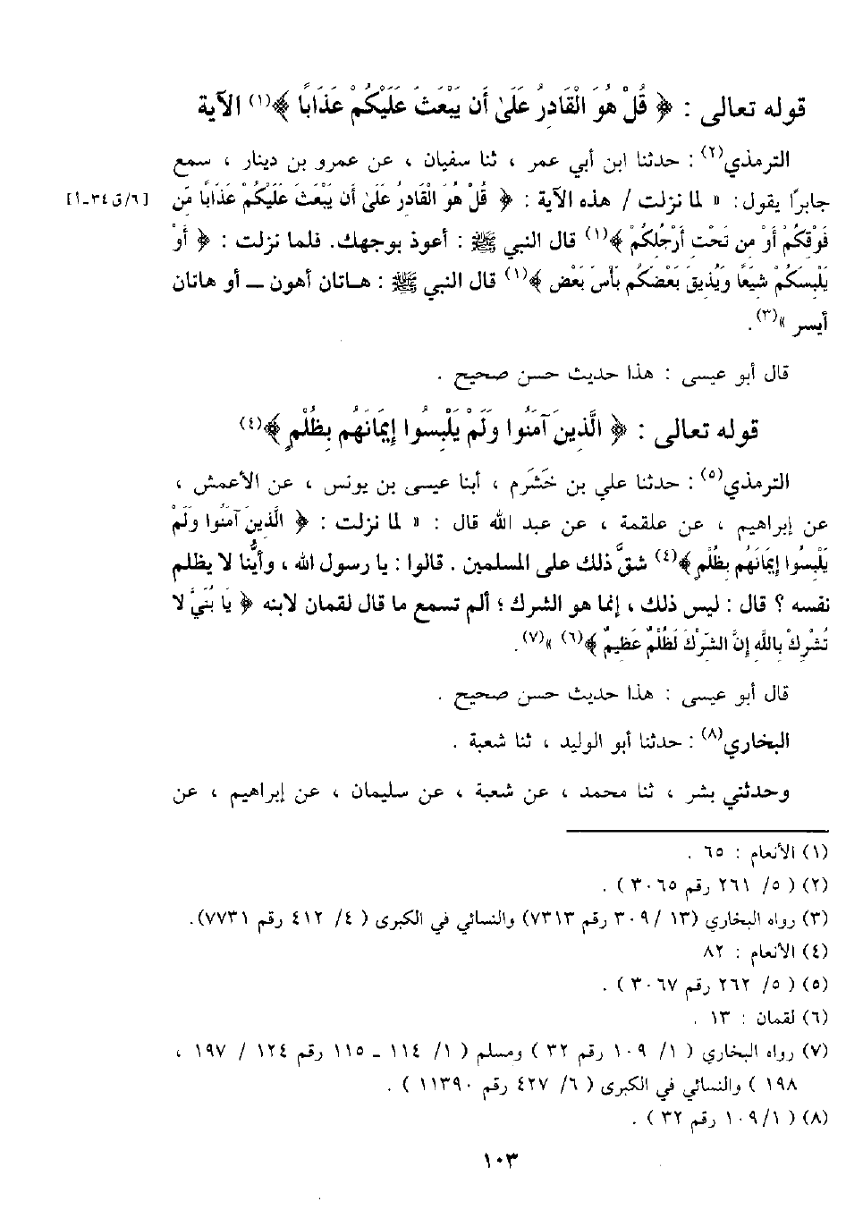 التِّرْمِذِيّ: حَدثنَا ابْن أبي عمر، ثَنَا سُفْيَان، عَن عَمْرو بن دِينَار، سمع جَابِرا يَقُول: " لما نزلت / هَذِه الْآيَة: {قل هُوَ الْقَادِر على أَن يبْعَث عَلَيْكُم عذَابا من فَوْقكُم أَو من تَحت أَرْجُلكُم} قَالَ النَّبِي - صَلَّى اللَّهُ عَلَيْهِ وَسَلَّم َ -: أعوذ بِوَجْهِك. فَلَمَّا نزلت: {أَو يلْبِسكُمْ شيعًا وَيُذِيق بَعْضكُم بَأْس بعض} قَالَ النَّبِي - صَلَّى اللَّهُ عَلَيْهِ وَسَلَّم َ -: هَاتَانِ أَهْون - أَو هَاتَانِ أيسر ".