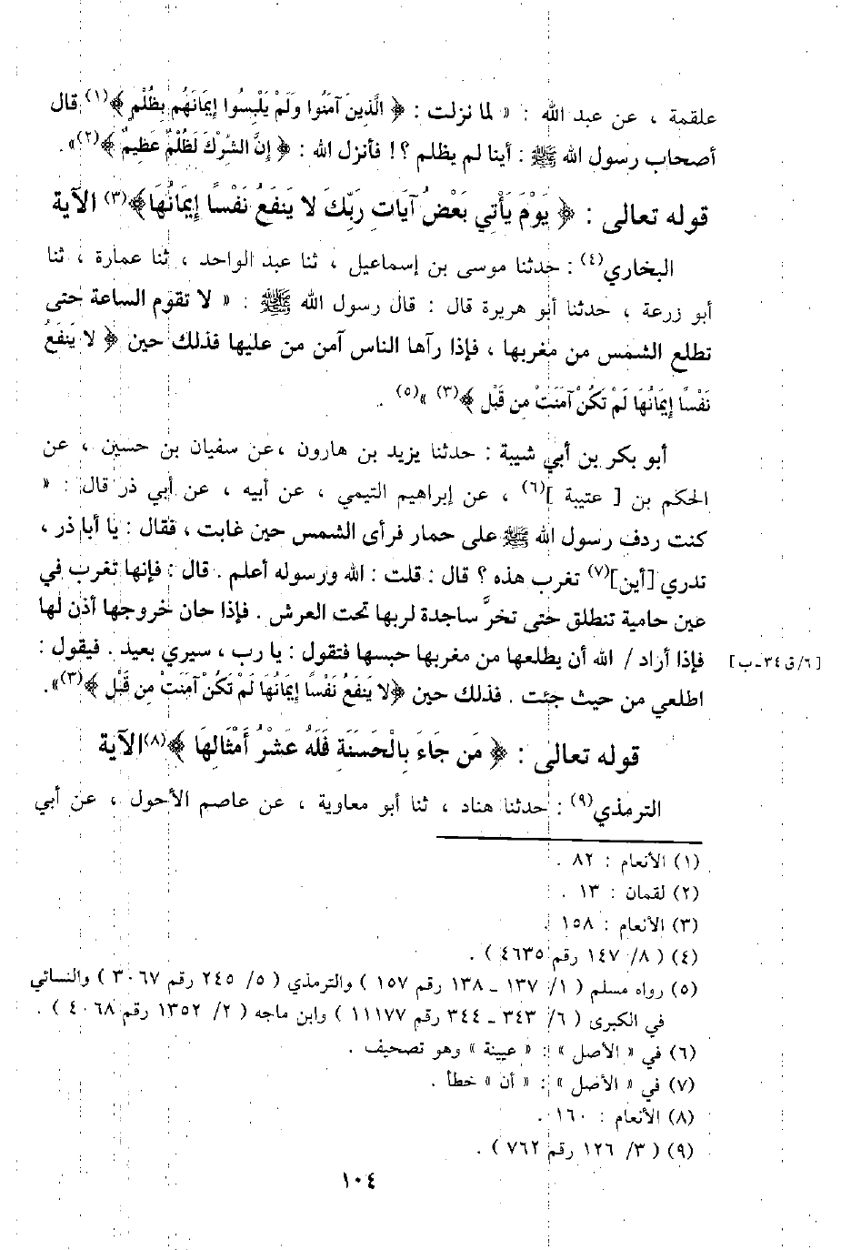 البُخَارِيّ: حَدثنَا مُوسَى بن إِسْمَاعِيل، ثَنَا عبد الْوَاحِد، ثَنَا عمَارَة، ثَنَا أَبُو زرْعَة، حَدثنَا أَبُو هُرَيْرَة قَالَ: قَالَ رَسُول الله - صَلَّى اللَّهُ عَلَيْهِ وَسَلَّم َ -: " لَا تقوم السَّاعَة حَتَّى تطلع الشَّمْس من مغْرِبهَا، فَإِذا رَآهَا النَّاس آمن من عَلَيْهَا فَذَلِك حِين {لَا ينفع نفسا إيمَانهَا لم تكن آمَنت من قبل} ".