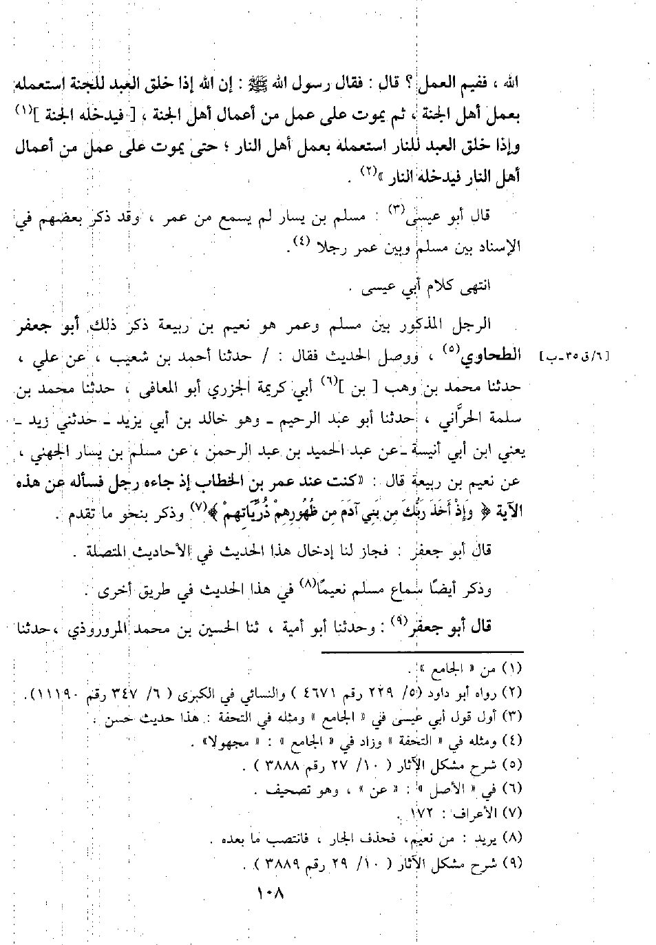 أَبُو جَعْفَر الطَّحَاوِيّ، وَوصل الحَدِيث فَقَالَ: / حَدثنَا أَحْمد بن شُعَيْب، عَن عَليّ، حَدثنَا مُحَمَّد بن وهب [بن] أبي كَرِيمَة الْجَزرِي أَبُو الْمعَافى، حَدثنَا مُحَمَّد بن سَلمَة الْحَرَّانِي، حَدثنَا أَبُو عبد الرَّحِيم - وَهُوَ خَالِد بن أبي يزِيد - حَدثنِي زيد - يَعْنِي ابْن أبي أنيسَة - عَن عبد الحميد بن عبد الرَّحْمَن، عَن مُسلم بن يسَار الْجُهَنِيّ، عَن نعيم بن ربيعَة قَالَ: " كنت عِنْد عمر بن الْخطاب إِذْ جَاءَهُ رجل فَسَأَلَهُ عَن هَذِه الْآيَة {وَإِذ أَخذ رَبك من بني آدم من ظُهُورهمْ ذرياتهم} وَذكر بِنَحْوِ مَا تقدم.