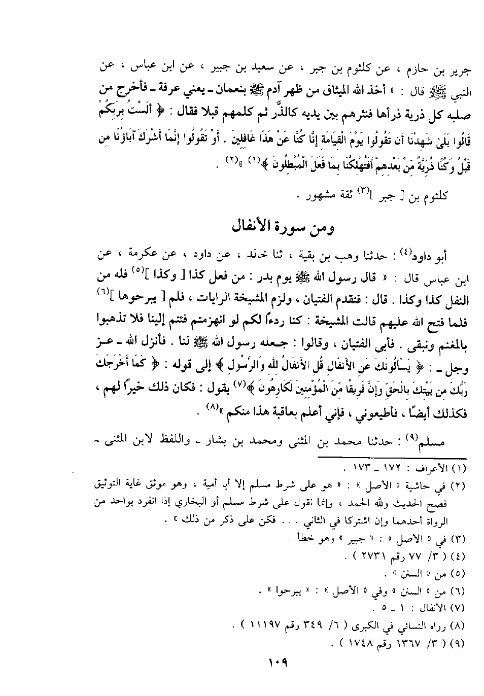 جرير بن حَازِم، عَن كُلْثُوم بن جبر، عَن سعيد بن جُبَير، عَن ابْن عَبَّاس، عَن النَّبِي - صَلَّى اللَّهُ عَلَيْهِ وَسَلَّم َ - قَالَ: " أَخذ الله الْمِيثَاق من ظهر آدم - صَلَّى اللَّهُ عَلَيْهِ وَسَلَّم َ - بنعمان - يَعْنِي عَرَفَة - فَأخْرج من صلبه كل ذُرِّيَّة ذرأها فنثرهم بَين يَدَيْهِ كالذر ثمَّ كَلمهمْ قبلا فَقَالَ: {أَلَسْت بربكم قَالُوا بلَى شَهِدنَا أَن تَقولُوا يَوْم الْقِيَامَة إِنَّا كُنَّا عَن هَذَا غافلين. أَو تَقولُوا إِنَّمَا أشرك آبَاؤُنَا من قبل وَكُنَّا ذُرِّيَّة من بعدهمْ أفتهلكنا بِمَا فعل المبطلون} ".