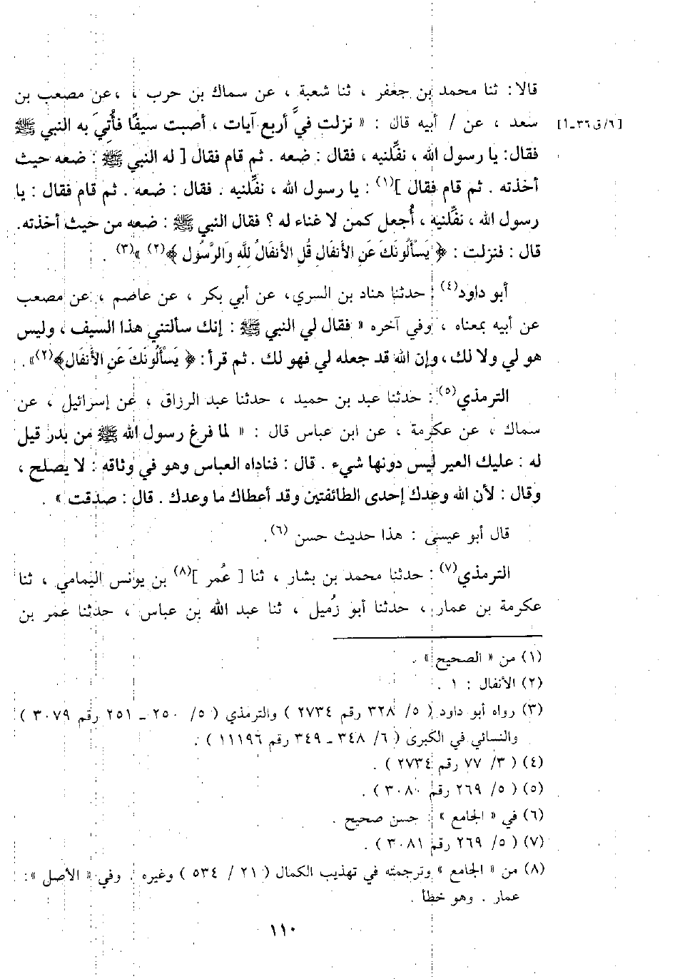 أَبُو دَاوُد: حَدثنَا هناد بن السّري، عَن أبي بكر، عَن عَاصِم، عَن مُصعب عَن أَبِيه بِمَعْنَاهُ، وَفِي آخِره " فَقَالَ لي النَّبِي - صَلَّى اللَّهُ عَلَيْهِ وَسَلَّم َ -: إِنَّك سَأَلتنِي هَذَا السَّيْف، وَلَيْسَ هُوَ لي وَلَا لَك، وَإِن الله قد جعله لي فَهُوَ لَك. ثمَّ قَرَأَ: {يَسْأَلُونَك عَن الْأَنْفَال} ".
