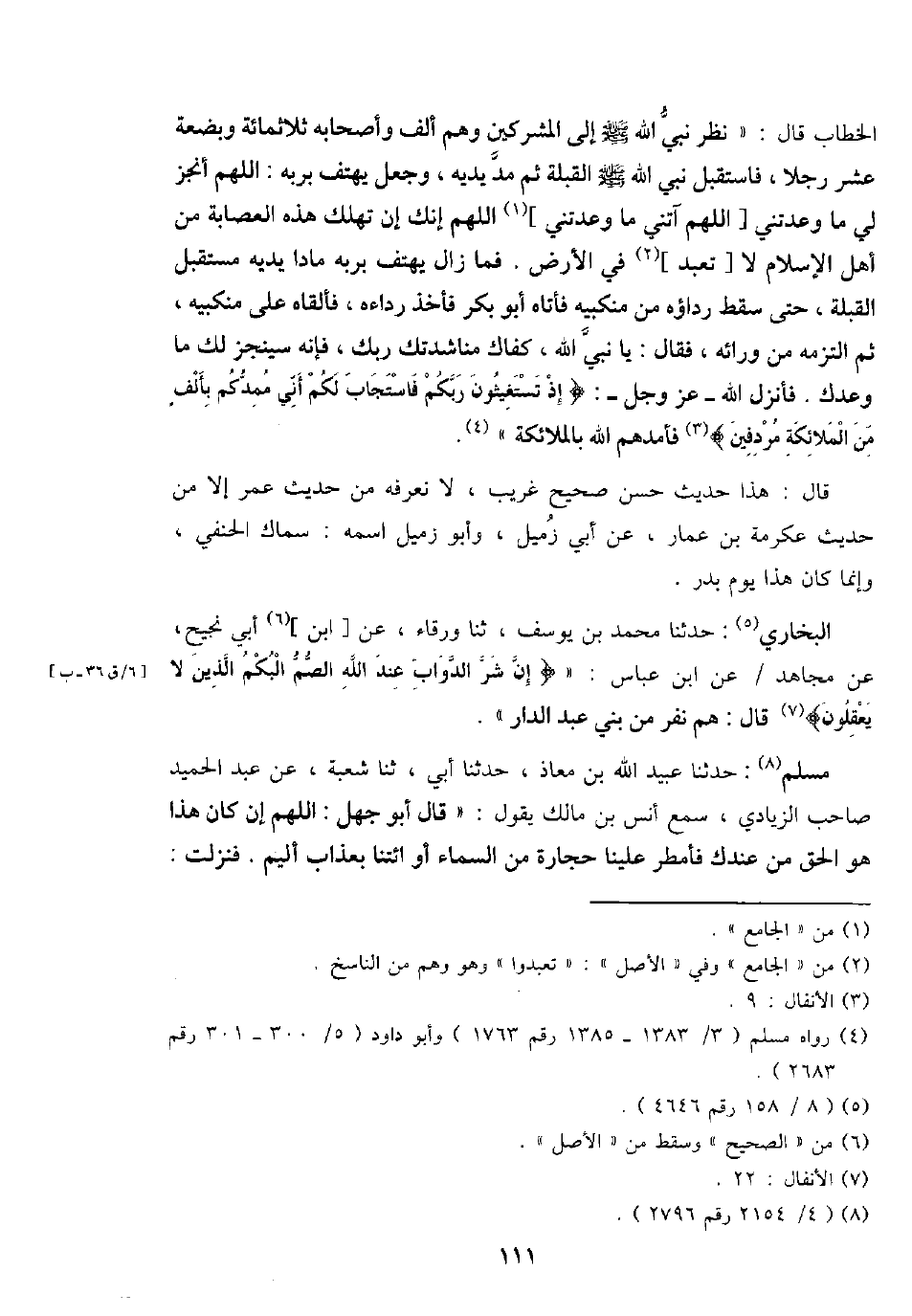 الْخطاب قَالَ: " نظر نَبِي الله - صَلَّى اللَّهُ عَلَيْهِ وَسَلَّم َ - إِلَى الْمُشْركين وهم ألف وَأَصْحَابه ثَلَاثمِائَة وَبضْعَة عشر رجلا، فَاسْتقْبل نَبِي الله - صَلَّى اللَّهُ عَلَيْهِ وَسَلَّم َ - الْقبْلَة ثمَّ مد يَدَيْهِ، وَجعل يَهْتِف بربه: اللَّهُمَّ أنْجز لي مَا وَعَدتنِي [اللَّهُمَّ آتني مَا وَعَدتنِي] اللَّهُمَّ إِنَّك إِن تهْلك هَذِه الْعِصَابَة من أهل الْإِسْلَام لَا [تعبد] فِي الأَرْض. فَمَا زَالَ يَهْتِف بربه مَادًّا يَدَيْهِ مُسْتَقْبل الْقبْلَة، حَتَّى سقط رِدَاؤُهُ من مَنْكِبَيْه فَأَتَاهُ أَبُو بكر فَأخذ رِدَاءَهُ، فَأَلْقَاهُ على مَنْكِبَيْه، ثمَّ الْتَزمهُ من وَرَائه، فَقَالَ: يَا نَبِي الله، كَفاك مُنَاشَدَتك رَبك، فَإِنَّهُ سَيُنْجِزُ لَك مَا وَعدك. فَأنْزل الله - عز وَجل -: {إِذْ تَسْتَغِيثُونَ ربكُم فَاسْتَجَاب لكم أَنِّي مُمِدكُمْ بِأَلف من الْمَلَائِكَة مُردفِينَ} فَأَمَدَّهُمْ الله بِالْمَلَائِكَةِ ".