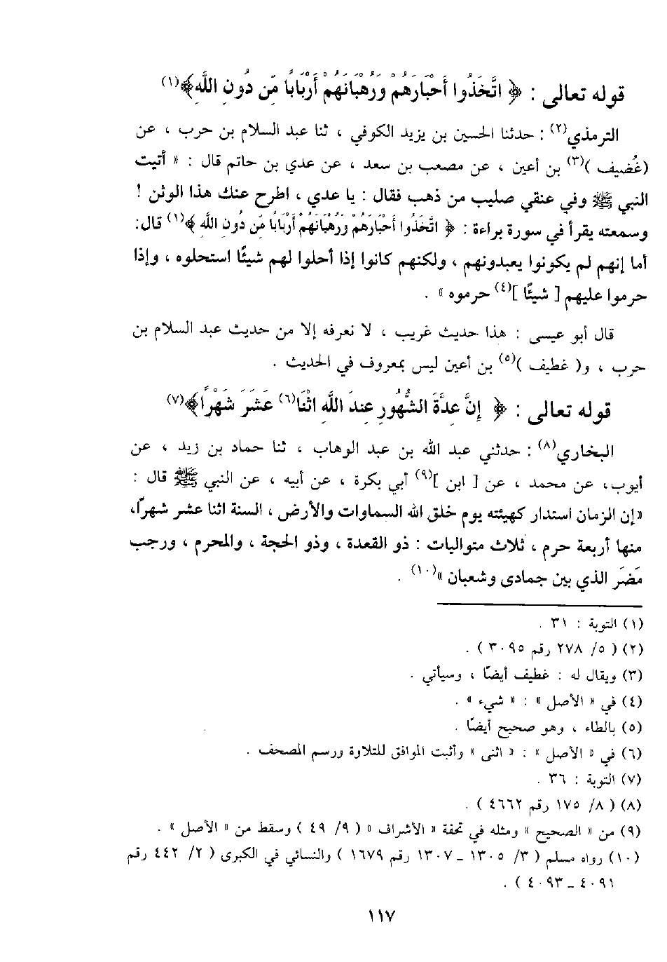 التِّرْمِذِيّ: حَدثنَا الْحُسَيْن بن يزِيد الْكُوفِي، ثَنَا عبد السَّلَام بن حَرْب، عَن (غُضَيْف) بن أعين، عَن مُصعب بن سعد، عَن عدي بن حَاتِم قَالَ: " أتيت النَّبِي - صَلَّى اللَّهُ عَلَيْهِ وَسَلَّم َ - وَفِي عنقِي صَلِيب من ذهب فَقَالَ: يَا عدي، اطرَح عَنْك هَذَا الوثن! وسمعته يقْرَأ فِي سُورَة بَرَاءَة: {اتَّخذُوا أَحْبَارهم وَرُهْبَانهمْ أَرْبَابًا من دون الله} قَالَ: أما إِنَّهُم لم يَكُونُوا يَعْبُدُونَهُمْ، وَلَكنهُمْ كَانُوا إِذا أحلُّوا لَهُم شَيْئا اسْتَحَلُّوهُ، وَإِذا حرمُوا عَلَيْهِم [شَيْئا] حرمُوهُ ".