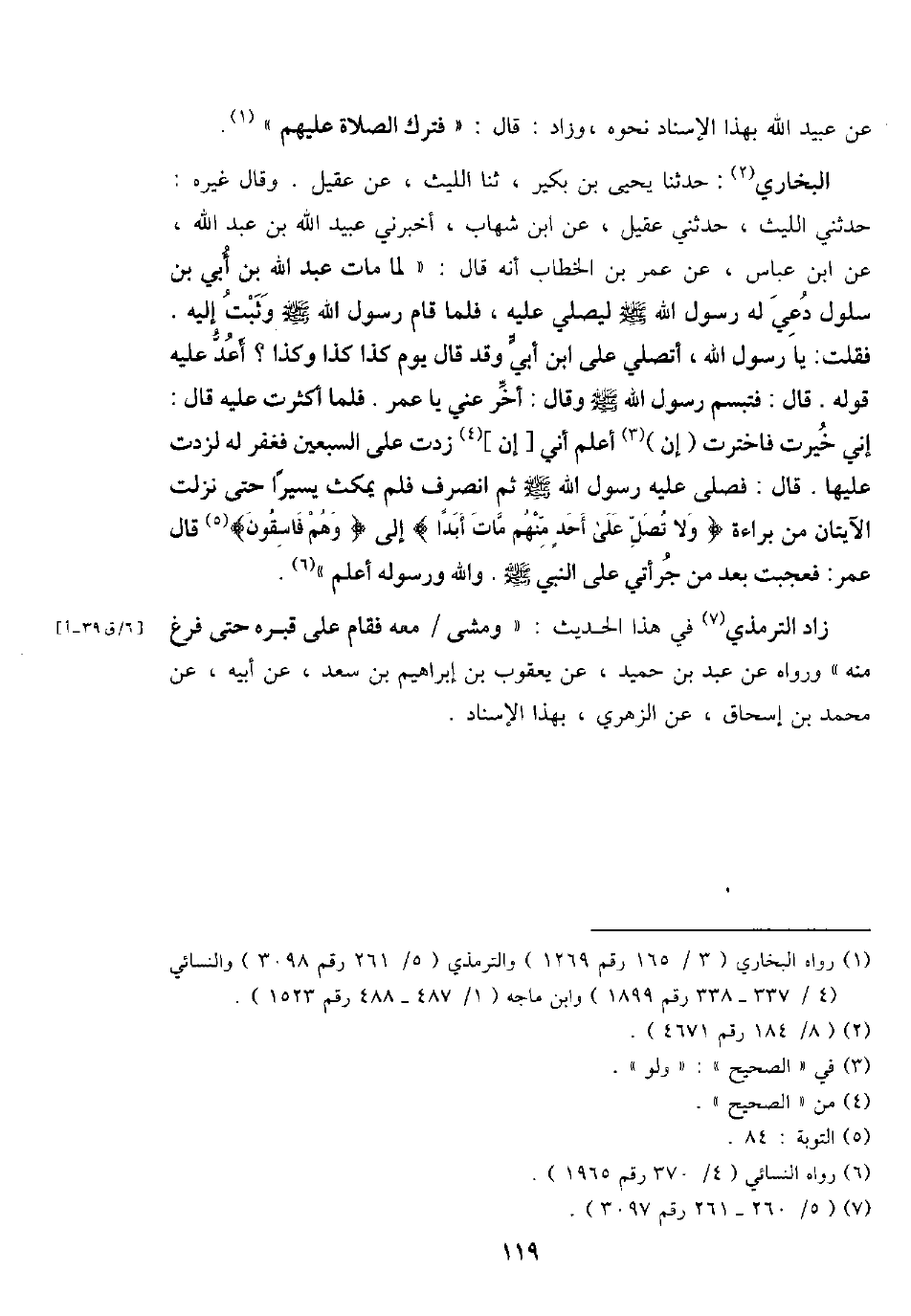 البُخَارِيّ: حَدثنَا يحيى بن بكير، ثَنَا اللَّيْث، عَن عقيل. وَقَالَ غَيره: حَدثنِي اللَّيْث، حَدثنِي عقيل، عَن ابْن شهَاب، أَخْبرنِي عبيد الله بن عبد الله، عَن ابْن عَبَّاس، عَن عمر بن الْخطاب أَنه قَالَ: " لما مَاتَ عبد الله بن أبي بن سلول دعِي لَهُ رَسُول الله - صَلَّى اللَّهُ عَلَيْهِ وَسَلَّم َ - ليُصَلِّي عَلَيْهِ، فَلَمَّا قَامَ رَسُول الله - صَلَّى اللَّهُ عَلَيْهِ وَسَلَّم َ - وَثَبت إِلَيْهِ. فَقلت: يَا رَسُول الله، أَتُصَلِّي على ابْن أبي وَقد قَالَ يَوْم كَذَا كَذَا وَكَذَا؟ أعد عَلَيْهِ قَوْله. قَالَ: فَتَبَسَّمَ رَسُول الله - صَلَّى اللَّهُ عَلَيْهِ وَسَلَّم َ - وَقَالَ: أخر عني يَا عمر. فَلَمَّا أكثرت عَلَيْهِ قَالَ: إِنِّي خيرت فاخترت (إِن) أعلم أَنِّي [إِن] زِدْت على السّبْعين فغفر لَهُ لزدت عَلَيْهَا. قَالَ: فصلى عَلَيْهِ رَسُول الله - صَلَّى اللَّهُ عَلَيْهِ وَسَلَّم َ - ثمَّ انْصَرف فَلم يمْكث يَسِيرا حَتَّى نزلت الْآيَتَانِ من بَرَاءَة {وَلَا تصل على أحد مِنْهُم مَاتَ أبدا} إِلَى {وهم فَاسِقُونَ} قَالَ عمر: فعجبت بعد من جرأتي على النَّبِي - صَلَّى اللَّهُ عَلَيْهِ وَسَلَّم َ -. وَالله وَرَسُوله أعلم ".