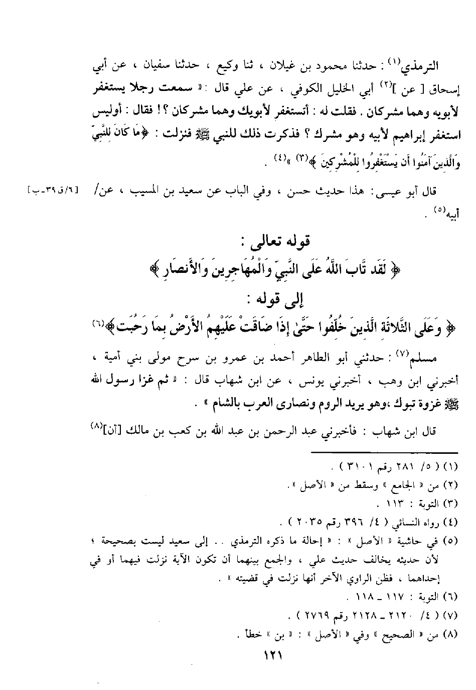 التِّرْمِذِيّ: حَدثنَا مَحْمُود بن غيلَان، ثَنَا وَكِيع، حَدثنَا سُفْيَان، عَن أبي إِسْحَاق [عَن] أبي الْخَلِيل الْكُوفِي، عَن عَليّ قَالَ: " سَمِعت رجلا يسْتَغْفر لِأَبَوَيْهِ وهما مُشْرِكَانِ. فَقلت لَهُ: أَتَسْتَغْفِرُ لِأَبَوَيْك وهما مُشْرِكَانِ؟ ! فَقَالَ: أَو لَيْسَ اسْتغْفر إِبْرَاهِيم لِأَبِيهِ وَهُوَ مُشْرك؟ فَذكرت ذَلِك للنَّبِي - صَلَّى اللَّهُ عَلَيْهِ وَسَلَّم َ - فَنزلت: {مَا كَانَ للنَّبِي وَالَّذين آمنُوا أَن يَسْتَغْفِرُوا للْمُشْرِكين} ".