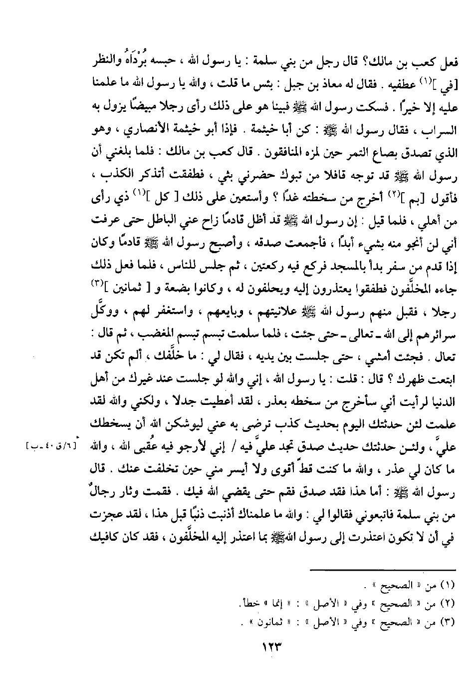 فعل كَعْب بن مَالك؟ قَالَ رجل: من بني سَلمَة: يَا رَسُول الله، حَبسه برْدَاهُ وَالنَّظَر [فِي] عطفيه. فَقَالَ لَهُ معَاذ بن جبل: بئس مَا قلت، وَالله يَا رَسُول الله مَا علمنَا عَلَيْهِ إِلَّا خيرا. فَسكت رَسُول الله - صَلَّى اللَّهُ عَلَيْهِ وَسَلَّم َ - فَبينا هُوَ على ذَلِك رأى رجلا مبيضا يَزُول بِهِ السراب، فَقَالَ رَسُول الله - صَلَّى اللَّهُ عَلَيْهِ وَسَلَّم َ -: كن أَبَا خَيْثَمَة. فَإِذا أَبُو خَيْثَمَة الْأنْصَارِيّ، وَهُوَ الَّذِي تصدق بِصَاع التَّمْر حِين لمزه المُنَافِقُونَ. قَالَ كَعْب بن مَالك: فَلَمَّا بَلغنِي أَن رَسُول الله - صَلَّى اللَّهُ عَلَيْهِ وَسَلَّم َ - قد توجه قَافِلًا من تَبُوك حضرني بثي، فطفقت أَتَذكر الْكَذِب، فَأَقُول [بِمَ] أخرج من سخطته غَدا؟ وأستعين على ذَلِك [كل] ذِي رَأْي من أَهلِي، فَلَمَّا قيل: إِن رَسُول الله - صَلَّى اللَّهُ عَلَيْهِ وَسَلَّم َ - قد أظل قادما زاح عني الْبَاطِل حَتَّى عرفت أَنِّي لن أنجو مِنْهُ بِشَيْء أبدا، فأجمعت صدقه، وَأصْبح رَسُول الله - صَلَّى اللَّهُ عَلَيْهِ وَسَلَّم َ - قادما وَكَانَ إِذا قدم من سفر بَدَأَ بِالْمَسْجِدِ فَرَكَعَ فِيهِ رَكْعَتَيْنِ، ثمَّ جلس للنَّاس، فَلَمَّا فعل ذَلِك جَاءَهُ الْمُخَلفُونَ فطفقوا يَعْتَذِرُونَ إِلَيْهِ ويحلفون لَهُ، وَكَانُوا بضعَة و [ثَمَانِينَ] رجلا، فَقبل مِنْهُم رَسُول الله - صَلَّى اللَّهُ عَلَيْهِ وَسَلَّم َ - علانيتهم، وبايعهم، واستغفر لَهُم، ووكل سرائرهم إِلَى الله - تَعَالَى - حَتَّى جِئْت، فَلَمَّا سلمت تَبَسم تَبَسم الْمُغْضب، ثمَّ قَالَ: تعال. فَجئْت أَمْشِي، حَتَّى جَلَست بَين يَدَيْهِ، فَقَالَ لي: مَا خَلفك، ألم تكن قد ابتعت ظهرك؟ قَالَ: قلت: يَا رَسُول الله، إِنِّي وَالله لَو جَلَست عِنْد غَيْرك من أهل الدُّنْيَا لرأيت أَنِّي سأخرج من سخطه بِعُذْر، لقد أَعْطَيْت جدلا، وَلَكِنِّي وَالله لقد علمت لَئِن حدثتك الْيَوْم بِحَدِيث كذب ترْضى بِهِ عني ليوشكن الله أَن يسخطك عَليّ، وَلَئِن حدثتك حَدِيث صدق تَجِد عَليّ فِيهِ / إِنِّي لأرجو فِيهِ عُقبى الله، وَالله مَا كَانَ لي عذر، وَالله مَا كنت قطّ أقوى وَلَا أيسر مني حِين تخلفت عَنْك. قَالَ رَسُول الله - صَلَّى اللَّهُ عَلَيْهِ وَسَلَّم َ -: أما هَذَا فقد صدق فَقُمْ حَتَّى يقْضِي الله فِيك. فَقُمْت وثار رجال من بني سَلمَة فَاتبعُوني فَقَالُوا لي: وَالله مَا علمناك أذنبت ذَنبا قبل هَذَا، لقد عجزت فِي أَن لَا تكون اعتذرت إِلَى رَسُول الله - صَلَّى اللَّهُ عَلَيْهِ وَسَلَّم َ - بِمَا اعتذر إِلَيْهِ الْمُخَلفُونَ، فقد كَانَ كافيك