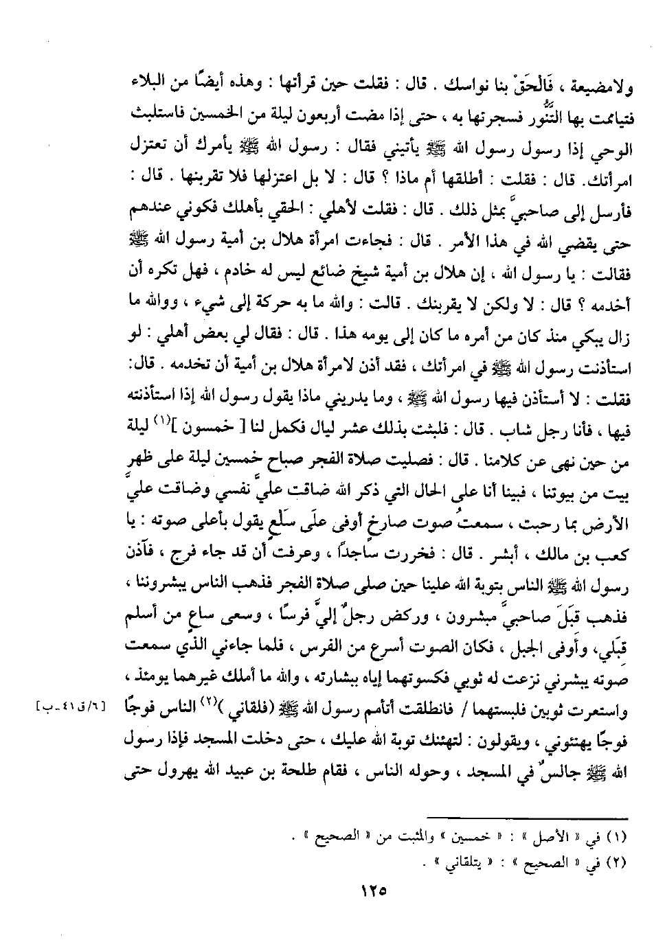 وَلَا مضيعة، فَالْحق بِنَا نواسك. قَالَ: فَقلت حِين قرأتها: وَهَذِه أَيْضا من الْبلَاء فتياممت بهَا التَّنور فسجرتها بِهِ، حَتَّى إِذا مَضَت أَرْبَعُونَ لَيْلَة من الْخمسين فاستلبث الْوَحْي إِذا رَسُول الله - صَلَّى اللَّهُ عَلَيْهِ وَسَلَّم َ - يأتيني فَقَالَ: رَسُول الله - صَلَّى اللَّهُ عَلَيْهِ وَسَلَّم َ - يَأْمُرك أَن تَعْتَزِل امْرَأَتك. قَالَ: فَقلت: أطلقها أم مَاذَا؟ قَالَ: لَا بل اعتزلها فَلَا تقربنها. قَالَ: فَأرْسل إِلَى صَاحِبي بِمثل ذَلِك. قَالَ: فَقلت لأهلي: الحقي بأهلك فكوني عِنْدهم حَتَّى يقْضِي الله فِي هَذَا الْأَمر. قَالَ: فَجَاءَت امْرَأَة هِلَال بن أُميَّة رَسُول الله - صَلَّى اللَّهُ عَلَيْهِ وَسَلَّم َ - فَقَالَت: يَا رَسُول الله، إِن هِلَال بن أُميَّة شيخ ضائع لَيْسَ لَهُ خَادِم، فَهَل تكره أَن أخدمه؟ قَالَ: لَا وَلَكِن لَا يقربنك. قَالَت: وَالله مَا بِهِ حَرَكَة إِلَى شَيْء، وَوَاللَّه مَا زَالَ يبكي مُنْذُ كَانَ من أمره مَا كَانَ إِلَى يَوْمه هَذَا. قَالَ: فَقَالَ لي بعض أَهلِي: لَو اسْتَأْذَنت رَسُول الله - صَلَّى اللَّهُ عَلَيْهِ وَسَلَّم َ - فِي امْرَأَتك، فقد أذن لامْرَأَة هِلَال بن أُميَّة أَن تخدمه. قَالَ: فَقلت: لَا اسْتَأْذن فِيهَا رَسُول الله - صَلَّى اللَّهُ عَلَيْهِ وَسَلَّم َ -، وَمَا يدريني مَاذَا يَقُول رَسُول الله إِذا استأذنته فِيهَا، فَأَنا رجل شَاب. قَالَ: فَلَبثت بذلك عشر لَيَال فكمل لنا [خَمْسُونَ] لَيْلَة من حِين نهى عَن كلامنا. قَالَ: فَصليت صَلَاة الْفجْر صباح خمسين لَيْلَة على ظهر بَيت من بُيُوتنَا، فَبينا أَنا على الْحَال الَّتِي ذكر الله ضَاقَتْ عَليّ نَفسِي وَضَاقَتْ عَليّ الأَرْض بِمَا رَحبَتْ، سَمِعت صَوت صارخ أوفى على سلع يَقُول بِأَعْلَى صَوته: يَا كَعْب بن مَالك، أبشر. قَالَ: فَخَرَرْت سَاجِدا، وَعرفت أَن قد جَاءَ فرج، فآذن رَسُول الله - صَلَّى اللَّهُ عَلَيْهِ وَسَلَّم َ - النَّاس بتوبة الله علينا حِين صلى صَلَاة الْفجْر فَذهب النَّاس يبشروننا، فَذهب قبل صَاحِبي مبشرون، وركض رجل إِلَيّ فرسا، وسعى ساع من أسلم قبلي، وأوفى الْجَبَل، فَكَانَ الصَّوْت أسْرع من الْفرس، فَلَمَّا جَاءَنِي الَّذِي سَمِعت صَوته يبشرني نزعت لَهُ ثوبي فكسوتهما إِيَّاه ببشارته، وَالله مَا أملك غَيرهمَا يَوْمئِذٍ، واستعرت ثَوْبَيْنِ فلبستهما / فَانْطَلَقت أتأمم رَسُول الله - صَلَّى اللَّهُ عَلَيْهِ وَسَلَّم َ - (فلقاني) النَّاس فوجا فوجا يهنئوني، وَيَقُولُونَ: لتهئنك تَوْبَة الله عَلَيْك، حَتَّى دخلت الْمَسْجِد فَإِذا رَسُول الله - صَلَّى اللَّهُ عَلَيْهِ وَسَلَّم َ - جَالس فِي الْمَسْجِد، وَحَوله النَّاس، فَقَامَ طَلْحَة بن عبيد الله يُهَرْوِل حَتَّى