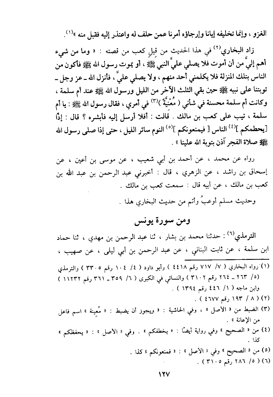 زَاد البُخَارِيّ فِي هَذَا الحَدِيث من قيل كَعْب من قصَّته: " وَمَا من شَيْء أهم إِلَيّ من أَن أَمُوت فَلَا يُصَلِّي عَليّ النَّبِي - صَلَّى اللَّهُ عَلَيْهِ وَسَلَّم َ -، أَو يَمُوت رَسُول الله - صَلَّى اللَّهُ عَلَيْهِ وَسَلَّم َ - فَأَكُون من النَّاس بِتِلْكَ الْمنزلَة فَلَا يكلمني أحد مِنْهُم، وَلَا يُصَلِّي عَليّ، فَأنْزل الله - عز وَجل - تَوْبَتنَا على نبيه - صَلَّى اللَّهُ عَلَيْهِ وَسَلَّم َ - حِين بَقِي الثُّلُث الآخر من اللَّيْل وَرَسُول الله - صَلَّى اللَّهُ عَلَيْهِ وَسَلَّم َ - عِنْد أم سَلمَة، وَكَانَت أم سَلمَة محسنة فِي شأني (معنية) فِي أَمْرِي، فَقَالَ رَسُول الله - صَلَّى اللَّهُ عَلَيْهِ وَسَلَّم َ -: يَا أم سَلمَة، تيب على كَعْب بن مَالك. قَالَت: أَفلا أرسل إِلَيْهِ فأبشره؟ قَالَ: إِذا [يحطمكم] النَّاس [فيمنعونكم] النّوم سَائِر اللَّيْل، حَتَّى إِذا صلى رَسُول الله - صَلَّى اللَّهُ عَلَيْهِ وَسَلَّم َ - صَلَاة الْفجْر آذن بتوبة الله علينا ".