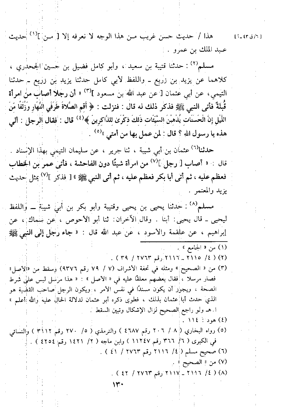 مُسلم: حَدثنَا قُتَيْبَة بن سعيد، وَأَبُو كَامِل فُضَيْل بن حُسَيْن الجحدري، كِلَاهُمَا عَن يزِيد بن زُرَيْع - وَاللَّفْظ لأبي كَامِل حَدثنَا يزِيد بن زُرَيْع - حَدثنَا التَّيْمِيّ، عَن أبي عُثْمَان [عَن عبد الله بن مَسْعُود] " أَن رجلا أصَاب من امْرَأَة قبْلَة فَأتى النَّبِي - صَلَّى اللَّهُ عَلَيْهِ وَسَلَّم َ - فَذكر ذَلِك لَهُ قَالَ: فَنزلت: {أقِم الصَّلَاة طرفِي النَّهَار وَزلفًا من اللَّيْل إِن الْحَسَنَات يذْهبن السَّيِّئَات ذَلِك ذكرى لِلذَّاكِرِينَ} قَالَ: فَقَالَ الرجل: أَلِي هَذِه يَا رَسُول الله؟ قَالَ: لمن عمل بهَا من أمتِي ".