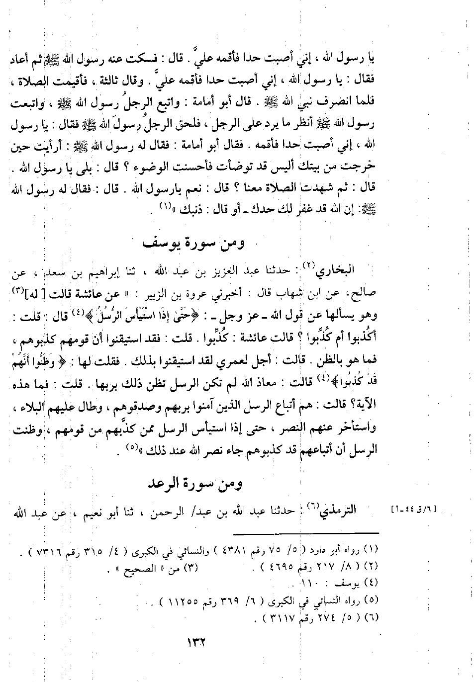البُخَارِيّ: حَدثنَا عبد الْعَزِيز بن عبد الله، ثَنَا إِبْرَاهِيم بن سعد، عَن صَالح، عَن ابْن شهَاب قَالَ: أَخْبرنِي عُرْوَة بن الزبير: " عَن عَائِشَة قَالَت [لَهُ] وَهُوَ يسْأَلهَا عَن قَول الله - عز وَجل - {حَتَّى إِذا استيأس الرُّسُل} قَالَ: قلت: أكذِبوا أم كذّبوا؟ قَالَت عَائِشَة: كذّبوا. قلت: فقد استيقنوا أَن قَومهمْ كذبوهم، فَمَا هُوَ بِالظَّنِّ. قَالَت: أجل لعمري لقد استيقنوا بذلك. فَقلت لَهَا: {وظنوا أَنهم قد كذبُوا} قَالَت: معَاذ الله لم تكن الرُّسُل تظن ذَلِك بربها. قلت: فَمَا هَذِه الْآيَة؟ قَالَت: هم أَتبَاع الرُّسُل الَّذين آمنُوا برَبهمْ وصدقوهم، وَطَالَ عَلَيْهِم الْبلَاء، واستأخر عَنْهُم النَّصْر، حَتَّى إِذا استيأس الرُّسُل مِمَّن كذبهمْ من قَومهمْ، وظنت الرُّسُل أَن أتباعهم قد كذبوهم جَاءَ نصر الله عِنْد ذَلِك ".