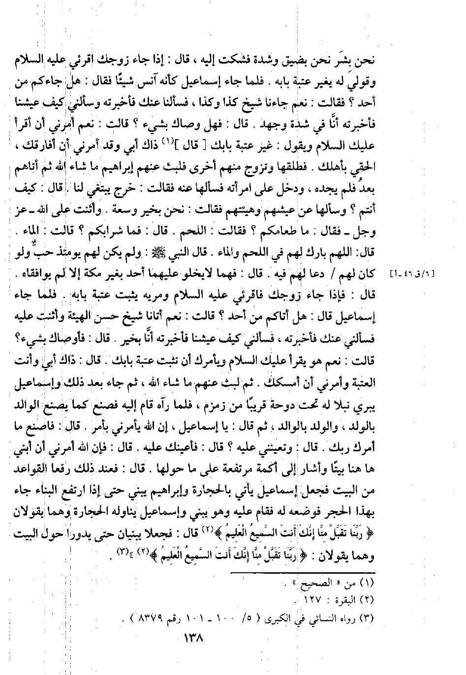 نَحن بشر نَحن بِضيق وَشدَّة فشكت إِلَيْهِ، قَالَ: إِذا جَاءَ زَوجك اقرئي عَلَيْهِ السَّلَام وَقَوْلِي لَهُ يُغير عتبَة بَابه. فَلَمَّا جَاءَ إِسْمَاعِيل كَأَنَّهُ آنس شَيْئا فَقَالَ: هَل جَاءَكُم من أحد؟ فَقَالَت: نعم جَاءَنَا شيخ كَذَا وَكَذَا، فسألنا عَنْك فَأَخْبَرته وسألني كَيفَ عيشنا فَأَخْبَرته أَنا فِي شدَّة وَجهد. قَالَ: فَهَل وصاك بِشَيْء؟ قَالَت: نعم أَمرنِي أَن أَقرَأ عَلَيْك السَّلَام وَيَقُول: غير عتبَة بابك [قَالَ] ذَاك أبي وَقد أَمرنِي أَن أُفَارِقك، الحقي بأهلك. فَطلقهَا وَتزَوج مِنْهُم أُخْرَى فَلبث عَنْهُم إِبْرَاهِيم مَا شَاءَ الله ثمَّ أَتَاهُم بعد فَلم يجده، وَدخل على امْرَأَته فَسَأَلَهَا عَنهُ فَقَالَت: خرج يَبْتَغِي لنا. قَالَ: كَيفَ أَنْتُم؟ وسألها عَن عيشهم وهيئتهم فَقَالَ: نَحن بِخَير وسعة. وأثنت على الله - عز وَجل - فَقَالَ: مَا طَعَامكُمْ؟ فَقَالَت: اللَّحْم. قَالَ: فَمَا شرابكم؟ قَالَت: المَاء. قَالَ: اللَّهُمَّ بَارك لَهُم فِي اللَّحْم وَالْمَاء. قَالَ النَّبِي - صَلَّى اللَّهُ عَلَيْهِ وَسَلَّم َ -: وَلم يكن لَهُم يَوْمئِذٍ حب وَلَو كَانَ لَهُم / دَعَا لَهُم فِيهِ. قَالَ: فهما لَا يخلوا عَلَيْهِمَا أحد بِغَيْر مَكَّة إِلَّا لم يوافقاه. قَالَ: فَإِذا جَاءَ زَوجك فاقرئي عَلَيْهِ السَّلَام ومريه يثبت عتبَة بَابه. فَلَمَّا جَاءَ إِسْمَاعِيل قَالَ: هَل أَتَاكُم من أحد؟ قَالَت: نعم أَتَانَا شيخ حسن الْهَيْئَة وأثنت عَلَيْهِ فَسَأَلَنِي عَنْك فَأَخْبَرته، فَسَأَلَنِي كَيفَ عيشنا فَأَخْبَرته أَنا بِخَير. قَالَ: فأوصاك بِشَيْء؟ قَالَت: نعم هُوَ يقْرَأ عَلَيْك السَّلَام ويأمرك أَن تثبت عتبَة بابك. قَالَ: ذَاك أبي وَأَنت العتبة وَأَمرَنِي أَن أمسكك. ثمَّ لبث عَنْهُم مَا شَاءَ الله، ثمَّ جَاءَ بعد ذَلِك وَإِسْمَاعِيل يبري نبْلًا لَهُ تَحت دوحة قَرِيبا من زَمْزَم، فَلَمَّا رَآهُ قَامَ إِلَيْهِ فَصنعَ كَمَا يصنع الْوَالِد بِالْوَلَدِ، وَالْولد بالوالد، ثمَّ قَالَ: يَا إِسْمَاعِيل، إِن الله يَأْمُرنِي بِأَمْر. قَالَ: فَاصْنَعْ مَا أَمرك رَبك. قَالَ: وتعينني عَلَيْهِ؟ قَالَ: فأعينك عَلَيْهِ. قَالَ: فَإِن الله أَمرنِي أَن أبني هَا هُنَا بَيْتا وَأَشَارَ إِلَى أكمة مُرْتَفعَة على مَا حولهَا. قَالَ: فَعِنْدَ ذَلِك رفعا الْقَوَاعِد من الْبَيْت فَجعل إِسْمَاعِيل يَأْتِي بِالْحِجَارَةِ وَإِبْرَاهِيم يَبْنِي حَتَّى إِذا ارْتَفع الْبناء جَاءَ بِهَذَا الْحجر فَوَضعه لَهُ فَقَامَ عَلَيْهِ وَهُوَ يَبْنِي وَإِسْمَاعِيل يناوله الْحِجَارَة وهما يَقُولَانِ {رَبنَا تقبل منا إِنَّك أَنْت السَّمِيع الْعَلِيم} قَالَ: فَجعلَا يبنيان حَتَّى يدورا حول الْبَيْت وهما يَقُولَانِ: {رَبنَا تقبل منا إِنَّك أَنْت السَّمِيع الْعَلِيم} ".