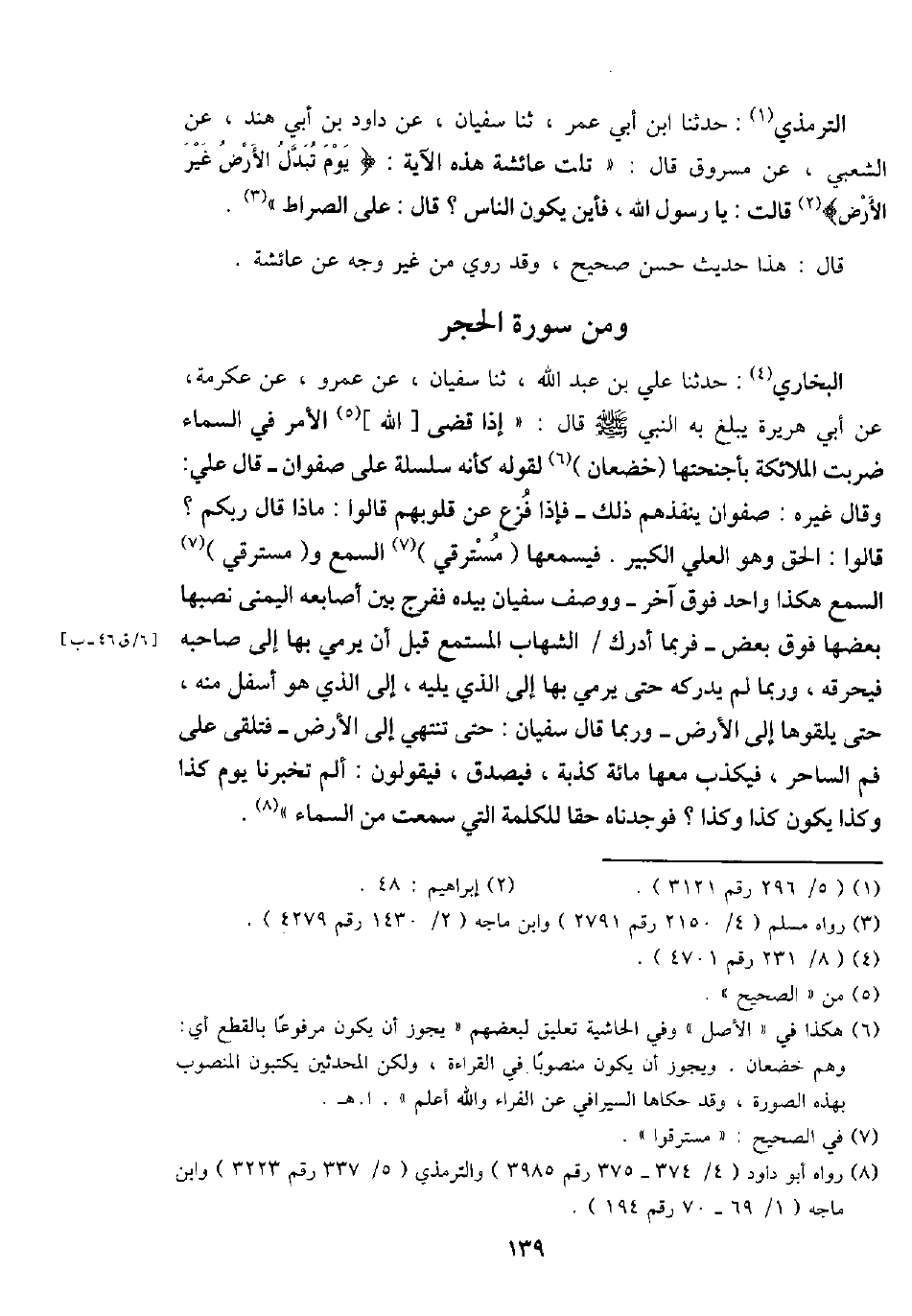 البُخَارِيّ: حَدثنَا عَليّ بن عبد الله، ثَنَا سُفْيَان، عَن عَمْرو، عَن عِكْرِمَة، عَن أبي هُرَيْرَة يبلغ بِهِ النَّبِي - صَلَّى اللَّهُ عَلَيْهِ وَسَلَّم َ - قَالَ: " إِذا قضى [الله] الْأَمر فِي السَّمَاء ضربت الْمَلَائِكَة بأجنحتها (خضعان) لقَوْله كَأَنَّهُ سلسلة على صَفْوَان - قَالَ عَليّ: وَقَالَ غَيره: صَفْوَان ينفذهم ذَلِك - فَإِذا فزغ عَن قُلُوبهم قَالُوا: مَاذَا قَالَ ربكُم. قَالُوا: الْحق وَهُوَ الْعلي الْكَبِير. فيسمعها (مسترقي) السّمع و (مسترقي) السّمع هَكَذَا وَاحِد فَوق آخر - وَوصف سُفْيَان بِيَدِهِ فَفرج بَين أَصَابِعه الْيُمْنَى نصبها بَعْضهَا فَوق بعض - فَرُبمَا أدْرك / الشهَاب المستمع قبل أَن يَرْمِي بهَا إِلَى صَاحبه فيحرقه، وَرُبمَا لم يُدْرِكهُ حَتَّى يَرْمِي بهَا إِلَى الَّذِي يَلِيهِ، إِلَى الَّذِي هُوَ أَسْفَل مِنْهُ، حَتَّى يلقوها إِلَى الأَرْض - رُبمَا قَالَ سُفْيَان: حَتَّى تَنْتَهِي إِلَى الأَرْض - فَتلقى على فَم السَّاحر، فيكذب مَعهَا مائَة كذبة، فَيصدق، فَيَقُولُونَ: ألم تخبرنا يَوْم كَذَا وَكَذَا يكون كَذَا وَكَذَا؟ فوجدناه حَقًا للكلمة الَّتِي سَمِعت من السَّمَاء ".