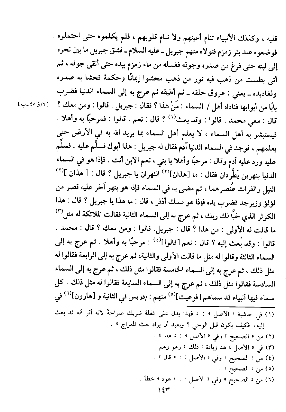 قلبه، وَكَذَلِكَ الْأَنْبِيَاء تنام أَعينهم وَلَا تنام قُلُوبهم، فَلم يكلموه حَتَّى احتملوه فوضعوه عِنْد بِئْر زَمْزَم فتولاه مِنْهُم جِبْرِيل - عَلَيْهِ السَّلَام - فشق جِبْرِيل مَا بَين نَحره إِلَى لبته حَتَّى فرغ من صَدره وجوفه فَغسله من مَاء زَمْزَم بِيَدِهِ حَتَّى أنقى جَوْفه، ثمَّ أَتَى بطست من ذهب فِيهِ تور من ذهب محشوا إِيمَانًا وَحِكْمَة فحشا بِهِ صَدره ولغاديده - يَعْنِي: عروق حلقه - ثمَّ أطبقه ثمَّ عرج بِهِ إِلَى السَّمَاء الدُّنْيَا فَضرب بَابا من أَبْوَابهَا فناداه أهل / السَّمَاء: من هَذَا؟ فَقَالَ: جِبْرِيل. قَالُوا: وَمن مَعَك؟ قَالَ: معي مُحَمَّد. قَالُوا: وَقد بعث؟ قَالَ: نعم. قَالُوا: فمرحبا بِهِ وَأهلا. فيستبشر بِهِ أهل السَّمَاء، لَا يعلم أهل السَّمَاء بِمَا يُرِيد الله بِهِ فِي الأَرْض حَتَّى يعلمهُمْ، فَوجدَ فِي السَّمَاء الدُّنْيَا آدم فَقَالَ لَهُ جِبْرِيل: هَذَا أَبوك فَسلم عَلَيْهِ. فَسلم عَلَيْهِ ورد عَلَيْهِ آدم وَقَالَ: مرْحَبًا وَأهلا يَا بني، نعم الابْن أَنْت. فَإِذا هُوَ فِي السَّمَاء الدُّنْيَا بنهرين يطردان فَقَالَ: مَا [هَذَانِ] النهران يَا جِبْرِيل؟ قَالَ: [هَذَانِ] النّيل والفرات عنصرهما، ثمَّ مضى بِهِ فِي السَّمَاء فَإِذا هُوَ بنهر آخر عَلَيْهِ قصر من لُؤْلُؤ وَزَبَرْجَد فَضرب يَده فَإِذا هُوَ مسك أذفر، قَالَ: مَا هَذَا يَا جِبْرِيل؟ قَالَ: هَذَا الْكَوْثَر الَّذِي خبأ لَك رَبك، ثمَّ عرج بِهِ إِلَى السَّمَاء الثَّانِيَة فَقَالَت الْمَلَائِكَة لَهُ مثل مَا قَالَت لَهُ الأولى: من هَذَا؟ قَالَ: جِبْرِيل. قَالُوا: وَمن مَعَك؟ قَالَ: مُحَمَّد. قَالُوا: وَقد بعث إِلَيْهِ؟ قَالَ: نعم [قَالُوا] : مرْحَبًا بِهِ وَأهلا. ثمَّ عرج بِهِ إِلَى السَّمَاء الثَّالِثَة وَقَالُوا لَهُ مثل مَا قَالَت الأولى وَالثَّانيَِة، ثمَّ عرج بِهِ إِلَى الرَّابِعَة فَقَالُوا لَهُ مثل ذَلِك، ثمَّ عرج بِهِ إِلَى السَّمَاء الْخَامِسَة فَقَالُوا مثل ذَلِك، ثمَّ عرج بِهِ إِلَى السَّمَاء السَّادِسَة فَقَالُوا مثل ذَلِك، ثمَّ عرج بِهِ إِلَى السَّمَاء السَّابِعَة فَقَالُوا لَهُ مثل ذَلِك. كل سَمَاء فِيهَا أَنْبيَاء قد سماهم [فوعيت] مِنْهُم: إِدْرِيس فِي الثَّانِيَة و [هاورن] فِي