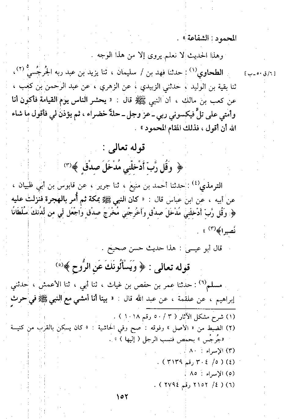 الطَّحَاوِيّ: حَدثنَا فَهد بن / سُلَيْمَان، ثَنَا يزِيد بن عبد ربه الجرجسي، ثَنَا بَقِيَّة بن الْوَلِيد، حَدثنِي الزبيدِيّ، عَن الزُّهْرِيّ، عَن عبد الرَّحْمَن بن كَعْب، عَن كَعْب بن مَالك، أَن النَّبِي - صَلَّى اللَّهُ عَلَيْهِ وَسَلَّم َ - قَالَ: " يحْشر النَّاس يَوْم الْقِيَامَة فَأَكُون أَنا وَأمتِي على تل فيكسوني رَبِّي - عز وَجل - حلَّة خضراء، ثمَّ يُؤذن لي فَأَقُول مَا شَاءَ الله أَن أَقُول، فَذَلِك الْمقَام الْمَحْمُود ".