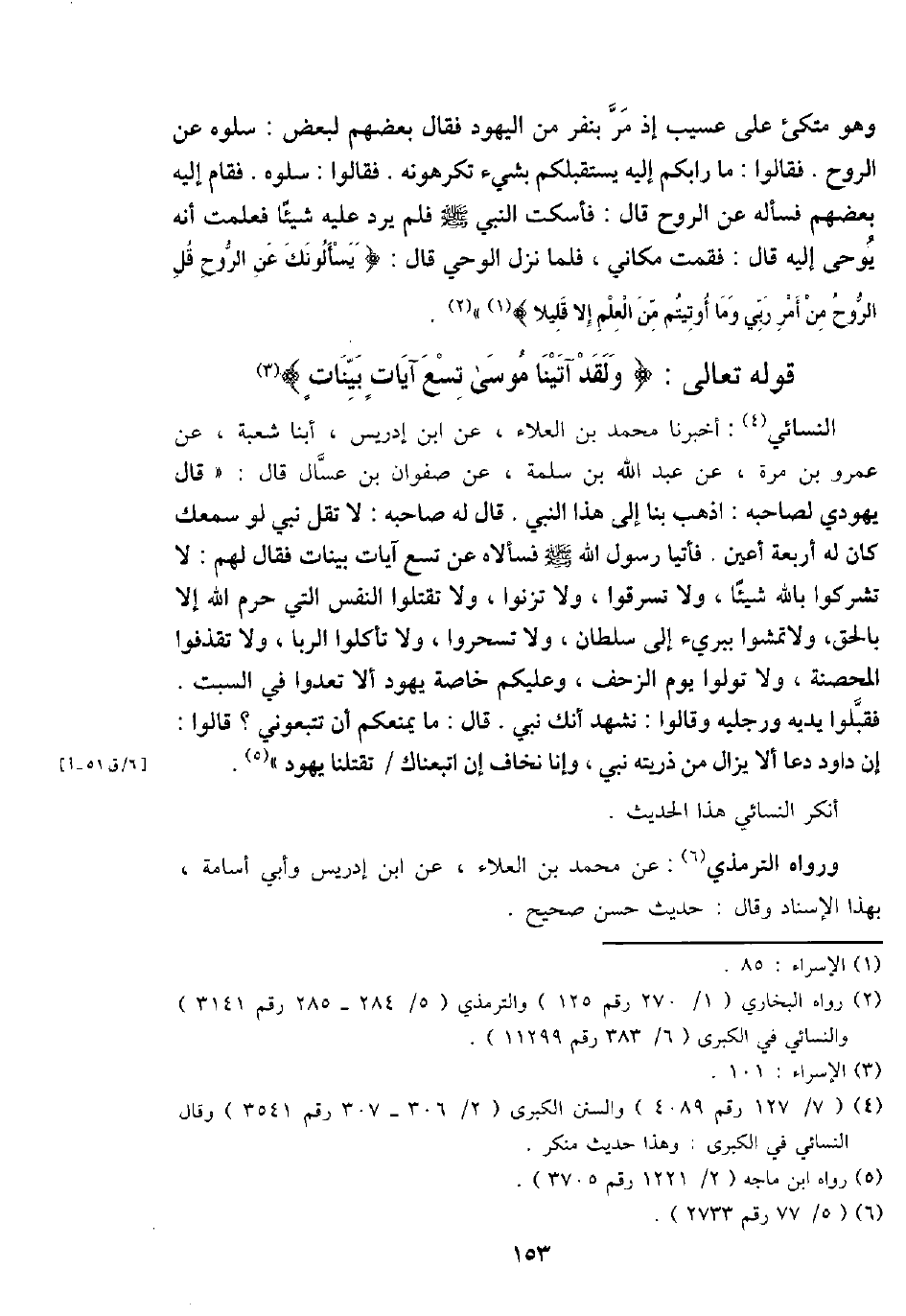 النَّسَائِيّ: أخبرنَا مُحَمَّد بن الْعَلَاء، عَن ابْن إِدْرِيس، أبنا شُعْبَة، عَن عَمْرو بن مرّة، عَن عبد الله بن سَلمَة، عَن صَفْوَان بن عَسَّال قَالَ: " قَالَ يَهُودِيّ لصَاحبه: اذْهَبْ بِنَا إِلَى هَذَا النَّبِي. قَالَ لَهُ صَاحبه: لَا تقل نَبِي لَو سَمعك كَانَ لَهُ أَرْبَعَة أعين. فَأتيَا رَسُول الله - صَلَّى اللَّهُ عَلَيْهِ وَسَلَّم َ - فَسَأَلَاهُ عَن تسع آيَات بَيِّنَات فَقَالَ لَهُم: لَا تُشْرِكُوا بِاللَّه شَيْئا، وَلَا تَسْرِقُوا، وَلَا تَزْنُوا، وَلَا تقتلُوا النَّفس الَّتِي حرم الله إِلَّا بِالْحَقِّ، وَلَا تَمْشُوا بِبَرِيءٍ إِلَى سُلْطَان، وَلَا تسحرُوا، وَلَا تَأْكُلُوا الرِّبَا، وَلَا تَقْذِفُوا المحصنة، وَلَا توَلّوا يَوْم الزَّحْف، وَعَلَيْكُم خَاصَّة يهود أَلا تعدوا فِي السبت. فقبلوا يَدَيْهِ وَرجلَيْهِ وَقَالُوا: نشْهد إِنَّك نَبِي. قَالَ: مَا يمنعكم أَن تتبعوني؟ قَالُوا: إِن دَاوُد دَعَا أَلا يزَال من ذُريَّته نَبِي، وَإِنَّا نَخَاف إِن اتَّبَعْنَاك / تَقْتُلنَا يهود ".