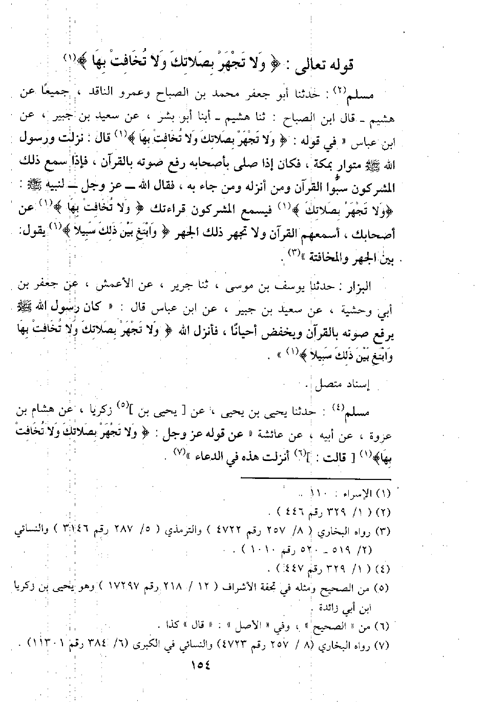 مُسلم: حَدثنَا أَبُو جَعْفَر مُحَمَّد بن الصَّباح وَعَمْرو النَّاقِد، جَمِيعًا عَن هشيم - قَالَ ابْن الصَّباح: ثَنَا هشيم - أبنا أَبُو بشر، عَن سعيد بن جُبَير، عَن ابْن عَبَّاس " فِي قَوْله: {وَلَا تجْهر بصلاتك وَلَا تخَافت بهَا} قَالَ: نزلت وَرَسُول الله - صَلَّى اللَّهُ عَلَيْهِ وَسَلَّم َ - متوار بِمَكَّة، فَكَانَ إِذا صلى بِأَصْحَابِهِ رفع صَوته بِالْقُرْآنِ، فَإِذا سمع ذَلِك الْمُشْركُونَ سبوا الْقُرْآن وَمن أنزلهُ وَمن جَاءَ بِهِ، فَقَالَ الله - عز وَجل - لنَبيه - صَلَّى اللَّهُ عَلَيْهِ وَسَلَّم َ -: {وَلَا تجْهر بصلاتك} فَيسمع الْمُشْركُونَ قراءتك {وَلَا تخَافت بهَا} عَن أَصْحَابك، أسمعهم الْقُرْآن وَلَا تجْهر ذَلِك الْجَهْر {وابتغ بَين ذَلِك سَبِيلا} يَقُول: بَين الْجَهْر والمخافتة} ".