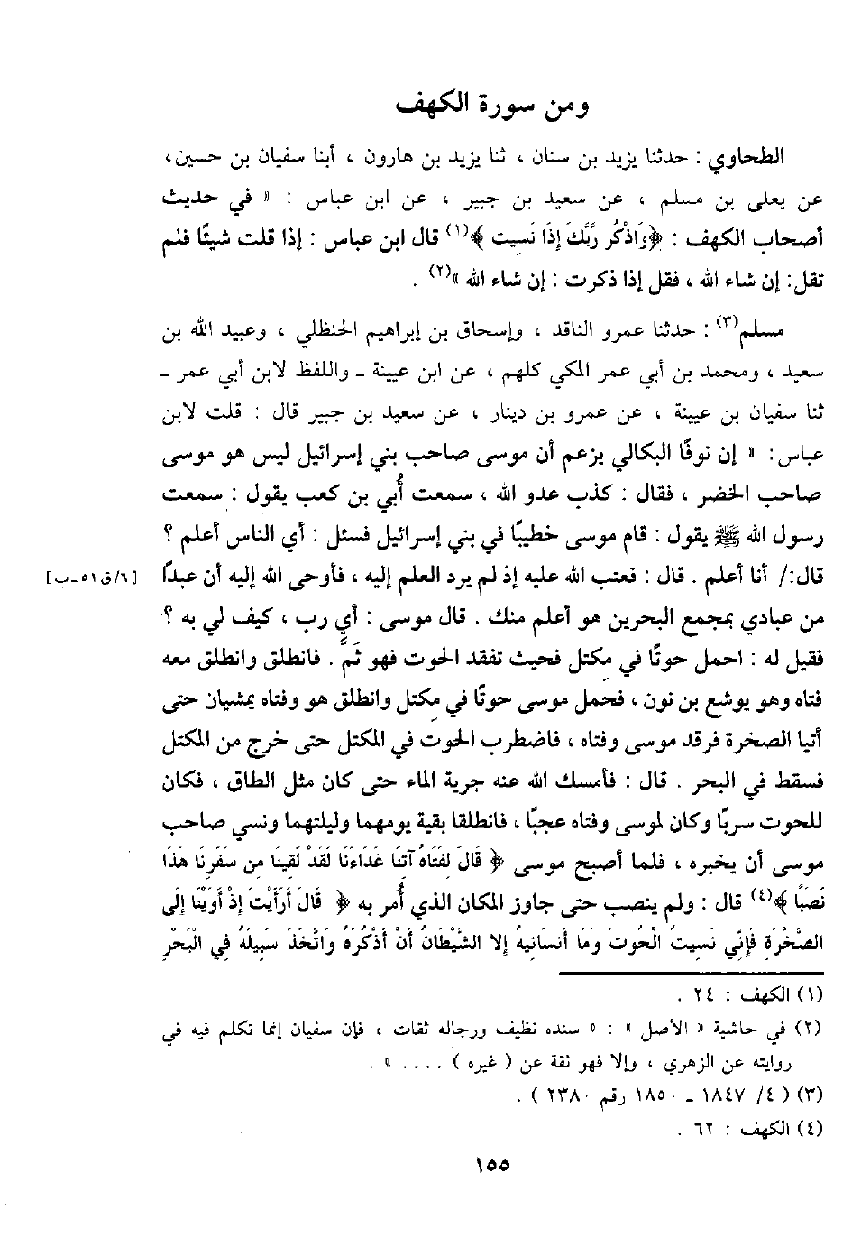 مُسلم: حَدثنَا عَمْرو النَّاقِد، وَإِسْحَاق بن إِبْرَاهِيم الْحَنْظَلِي، وَعبيد الله بن سعيد، وَمُحَمّد بن أبي عمر الْمَكِّيّ كلهم، عَن ابْن عُيَيْنَة - وَاللَّفْظ لِابْنِ أبي عمر - ثَنَا سُفْيَان بن عُيَيْنَة، عَن عَمْرو بن دِينَار، عَن سعيد بن جُبَير قَالَ: قلت لِابْنِ عَبَّاس: " إِن نَوْفًا الْبكالِي يزْعم أَن مُوسَى صَاحب بني إِسْرَائِيل لَيْسَ هُوَ مُوسَى صَاحب الْخضر، فَقَالَ: كذب عَدو الله، سَمِعت أبي بن كَعْب يَقُول: سَمِعت رَسُول الله - صَلَّى اللَّهُ عَلَيْهِ وَسَلَّم َ - يَقُول: قَامَ مُوسَى خَطِيبًا فِي بني إِسْرَائِيل فَسئلَ: أَي النَّاس أعلم؟ قَالَ: / أَنا أعلم. قَالَ: فعتب الله عَلَيْهِ إِذْ لم يرد الْعلم إِلَيْهِ، فَأوحى الله إِلَيْهِ أَن عبدا من عبَادي بمجمع الْبَحْرين هُوَ أعلم مِنْك. قَالَ مُوسَى: أَي رب، كَيفَ لَهُ بِهِ؟ فيقل لَهُ: احْمِلْ حوتا فِي مكتل فَحَيْثُ تفقد الْحُوت فَهُوَ ثمَّ. فَانْطَلق وَانْطَلق مَعَه فتاه وَهُوَ يُوشَع بن نون، فَحمل مُوسَى حوتا فِي مكتل وَانْطَلق هُوَ وفتاه يمشيان حَتَّى أَتَيَا الصَّخْرَة فرقد مُوسَى وفتاه، فاضطرب الْحُوت فِي المكتل حَتَّى خرج من المكتل فَسقط فِي الْبَحْر. قَالَ: فَأمْسك الله عَنهُ جرية المَاء حَتَّى كَانَ مثل الطاق، فَكَانَ للحوت سربا وَكَانَ لمُوسَى وفتاه عجبا، فَانْطَلقَا بَقِيَّة يومهما وليلتهما وَنسي صَاحب مُوسَى أَن يُخبرهُ، فَلَمَّا أصبح مُوسَى {قَالَ لفتاه آتنا غداءنا لقد لَقينَا من سفرنا هَذَا نصبا} قَالَ: وَلم ينصب حَتَّى جَاوز الْمَكَان الَّذِي أَمر بِهِ {قَالَ أَرَأَيْت إِذْ أوينا إِلَى الصَّخْرَة فَإِنِّي نسيت الْحُوت وَمَا أنسانيه إِلَّا الشَّيْطَان أَن أذكرهُ وَاتخذ سَبيله فِي الْبَحْر
