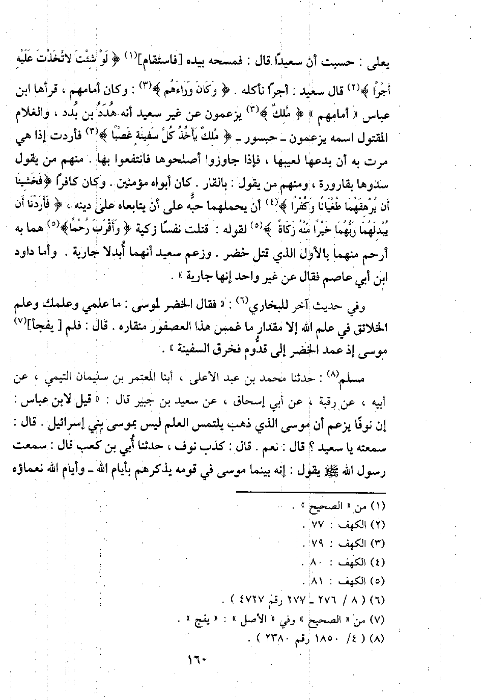 مُسلم: حَدثنَا مُحَمَّد بن عبد الْأَعْلَى، أبنا الْمُعْتَمِر بن سُلَيْمَان التَّيْمِيّ، عَن أَبِيه، عَن رَقَبَة، عَن أبي إِسْحَاق، عَن سعيد بن جُبَير قَالَ: " قيل لِابْنِ عَبَّاس: إِن نَوْفًا يزْعم أَن مُوسَى الَّذِي ذهب يلْتَمس الْعلم لَيْسَ بمُوسَى بني إِسْرَائِيل. قَالَ: سمعته يَا سعيد؟ قَالَ: نعم. قَالَ: كذب نوف، حَدثنَا أبي بن كَعْب قَالَ: سَمِعت رَسُول الله - صَلَّى اللَّهُ عَلَيْهِ وَسَلَّم َ - يَقُول: إِنَّه بَيْنَمَا مُوسَى فِي قومه يذكرهم بأيام الله - وَأَيَّام الله نعماؤه