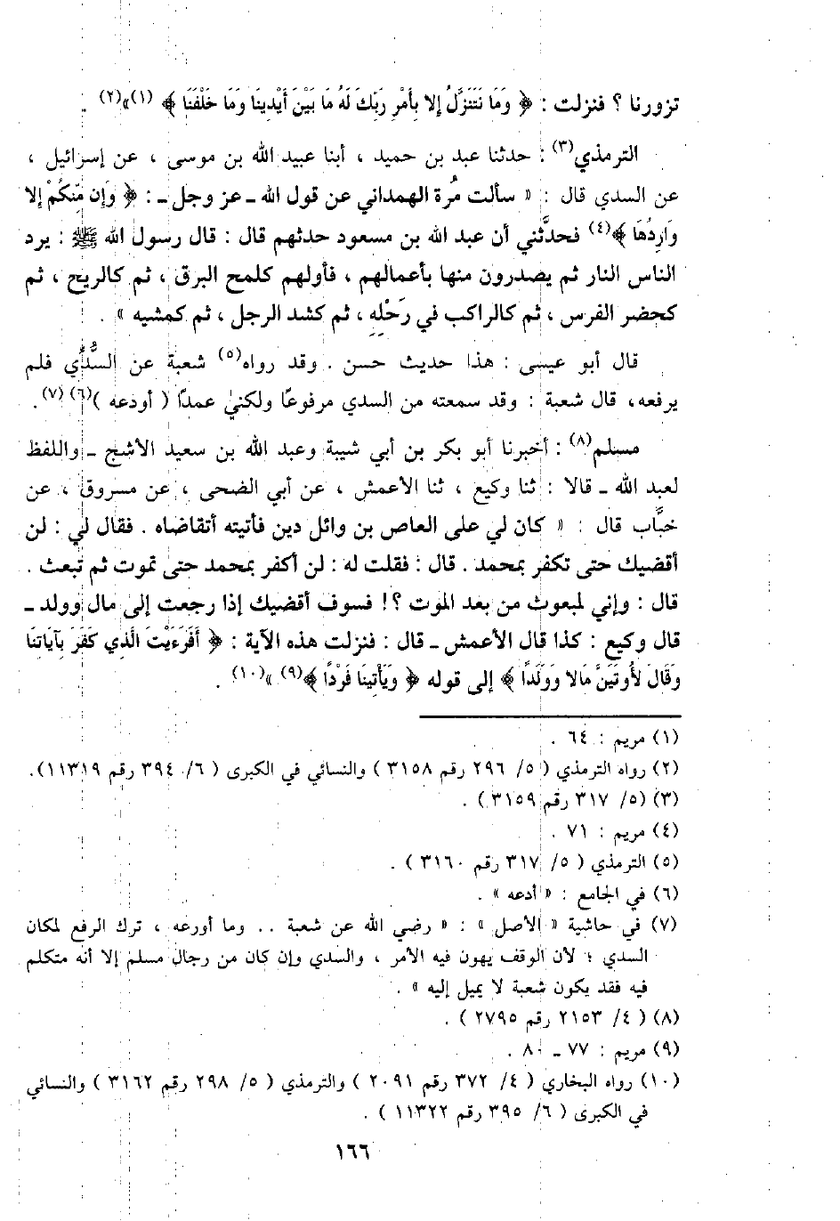 التِّرْمِذِيّ: حَدثنَا عبد بن حميد، أبنا عبيد الله بن مُوسَى، عَن إِسْرَائِيل، عَن السّديّ قَالَ: " سَأَلت مرّة الْهَمدَانِي عَن قَول الله - عز وَجل -: {وَإِن مِنْكُم إِلَّا واردها} فَحَدثني أَن عبد الله بن مَسْعُود حَدثهمْ قَالَ: قَالَ رَسُول الله - صَلَّى اللَّهُ عَلَيْهِ وَسَلَّم َ -: يرد النَّاس النَّار ثمَّ يصدرون مِنْهَا بأعمالهم، فأولهم كلمح الْبَرْق، ثمَّ كَالرِّيحِ، ثمَّ كحضر الْفرس، ثمَّ كالراكب فِي رَحْله، ثمَّ كشد الرجل، ثمَّ كمشيه ".