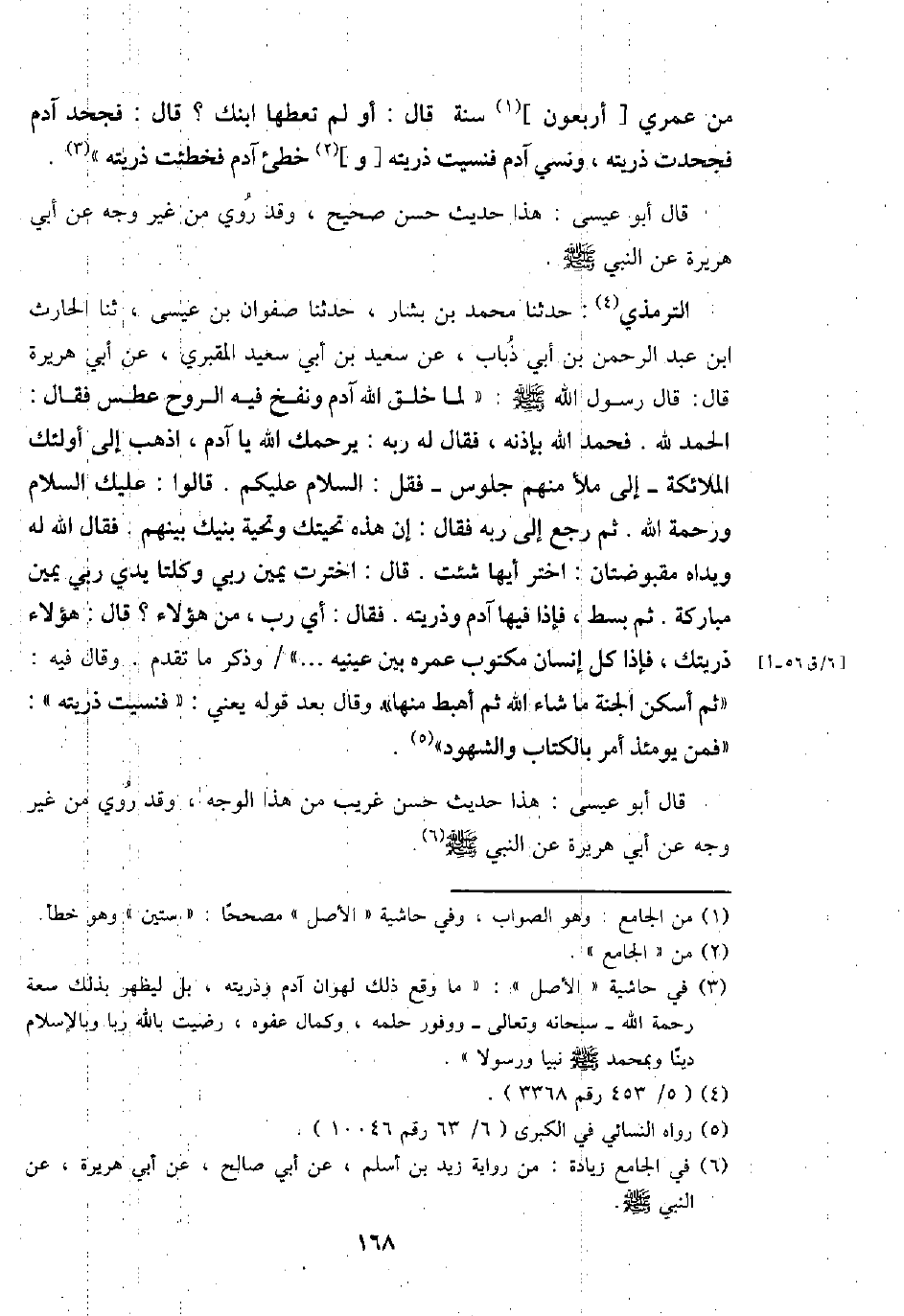 التِّرْمِذِيّ: حَدثنَا مُحَمَّد بن بشار، حَدثنَا صَفْوَان بن عِيسَى، ثَنَا الْحَارِث ابْن عبد الرَّحْمَن بن أبي ذُبَاب، عَن سعيد بن أبي سعيد المَقْبُري، عَن أبي هُرَيْرَة قَالَ: قَالَ رَسُول الله - صَلَّى اللَّهُ عَلَيْهِ وَسَلَّم َ -: " لما خلق الله آدم وَنفخ فِيهِ الرّوح عطس فَقَالَ: الْحَمد لله. فَحَمدَ الله بِإِذْنِهِ، فَقَالَ لَهُ ربه: يَرْحَمك الله يَا آدم، اذْهَبْ إِلَى اولئك الْمَلَائِكَة - إِلَى مَلأ مِنْهُم جُلُوس - فَقل: السَّلَام عَلَيْكُم. قَالُوا: عَلَيْك السَّلَام وَرَحْمَة الله. ثمَّ رَجَعَ إِلَى ربه فَقَالَ: إِن هَذِه تحيتك وتحية بنيك بَينهم. فَقَالَ الله لَهُ ويداه مقبوضتان: اختر أَيهَا شِئْت. قَالَ: اخْتَرْت يَمِين رَبِّي وكلتا يَدي رَبِّي يَمِين مباركة. ثمَّ بسط، فَإِذا فِيهَا آدم وَذريته. فَقَالَ: أَي رب، من هَؤُلَاءِ؟ قَالَ: هَؤُلَاءِ ذريتك، فَإِذا كل إِنْسَان مَكْتُوب عمره بَين عَيْنَيْهِ ... " / وَذكر مَا تقدم. وَقَالَ فِيهِ: " ثمَّ أسكن الْجنَّة مَا شَاءَ الله ثمَّ أهبط مِنْهَا ". وَقَالَ بعد قَوْله يَعْنِي: " فنسيت ذُريَّته ". " فَمن يَوْمئِذٍ أَمر بِالْكتاب وَالشُّهُود ".