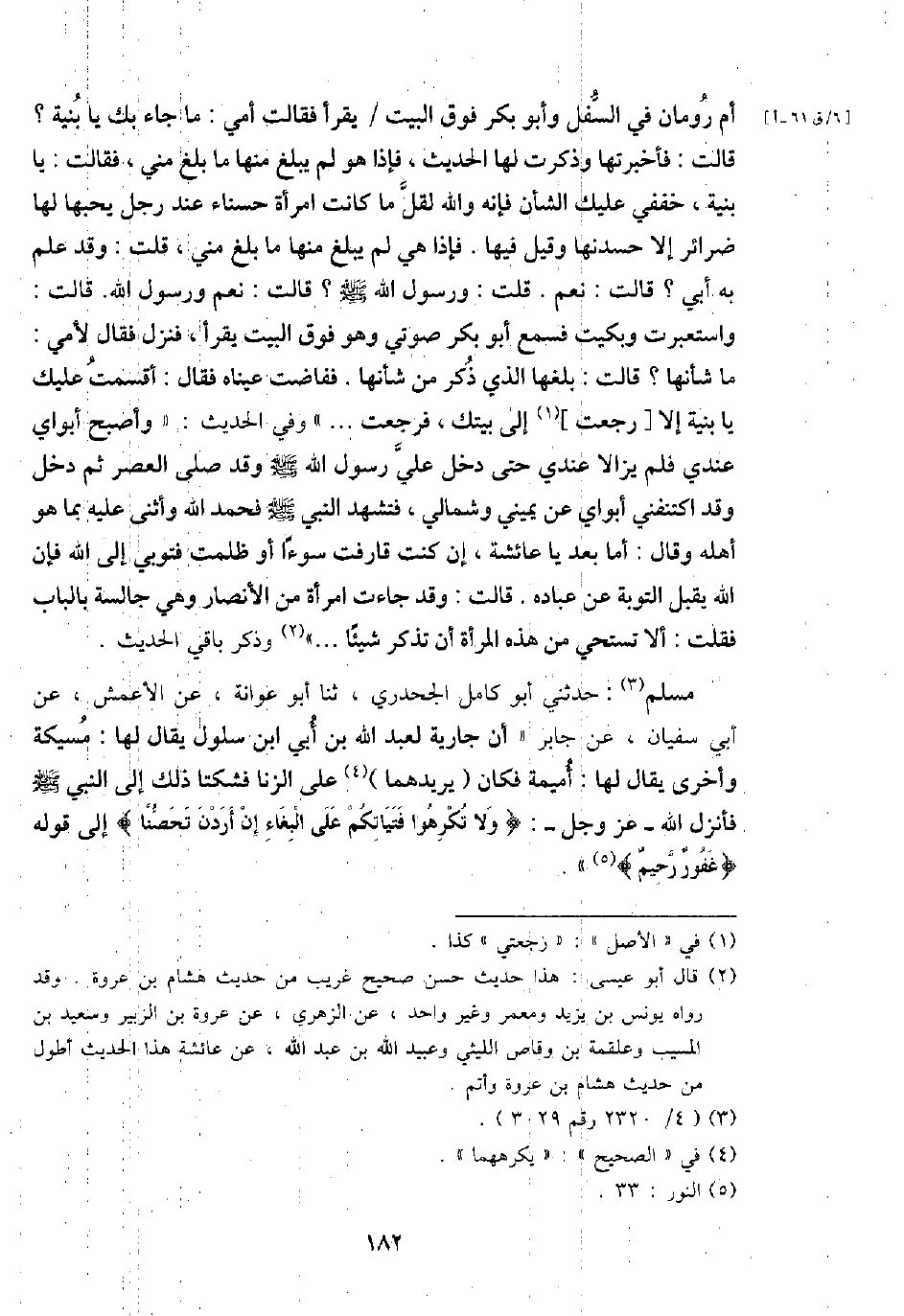 مُسلم: حَدثنِي أَبُو كَامِل الجحدري، ثَنَا أَبُو عوَانَة، عَن الْأَعْمَش، عَن أبي سُفْيَان، عَن جَابر " أَن جَارِيَة لعبد الله بن أبي ابْن سلول يُقَال لَهَا: مُسَيْكَة وَأُخْرَى يُقَال لَهَا: أُمَيْمَة فَكَانَ (يُرِيدهُمَا) على الزِّنَا فَشَكَتَا ذَلِك إِلَى النَّبِي - صَلَّى اللَّهُ عَلَيْهِ وَسَلَّم َ - فَأنْزل الله - عز وَجل -: {وَلَا تكْرهُوا فَتَيَاتكُم على الْبغاء إِن أردن تَحَصُّنًا} إِلَى قَوْله {غَفُور رَحِيم} ".
